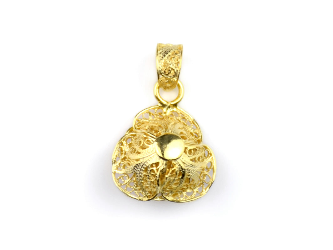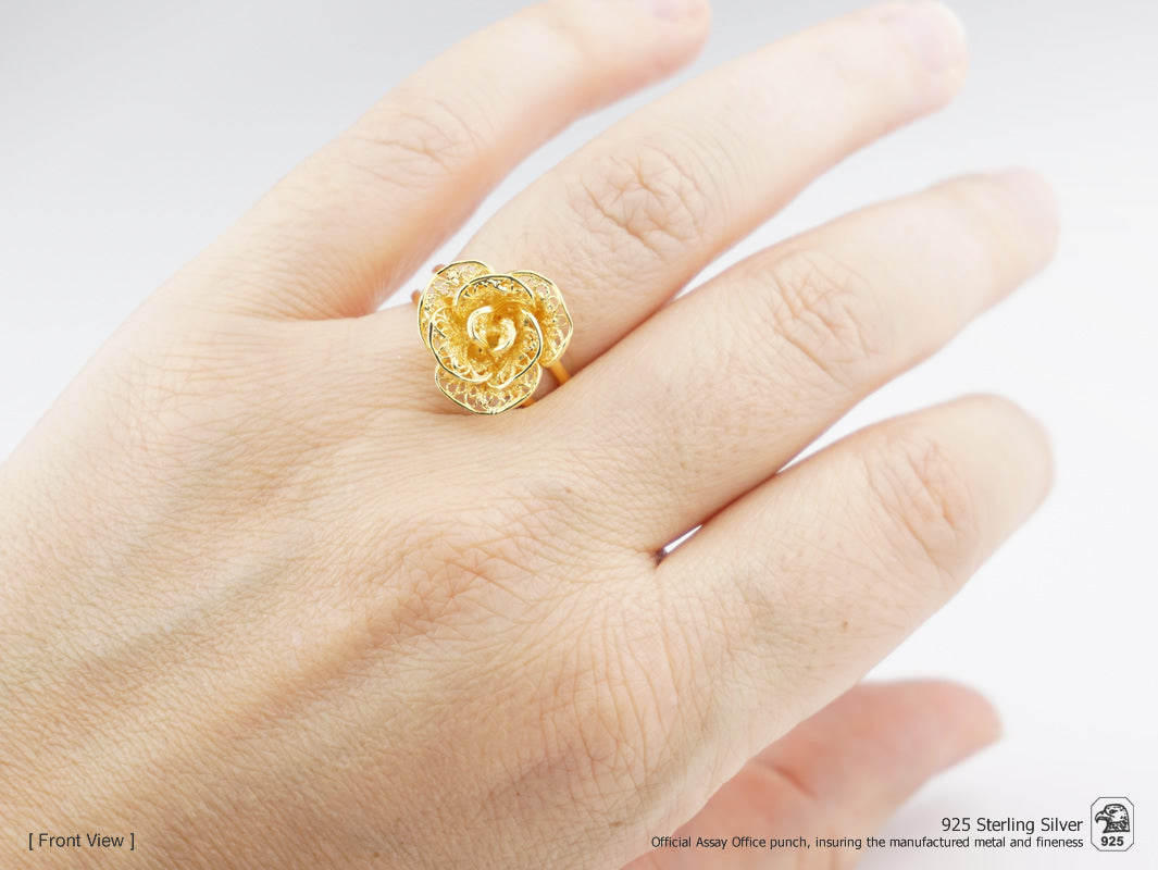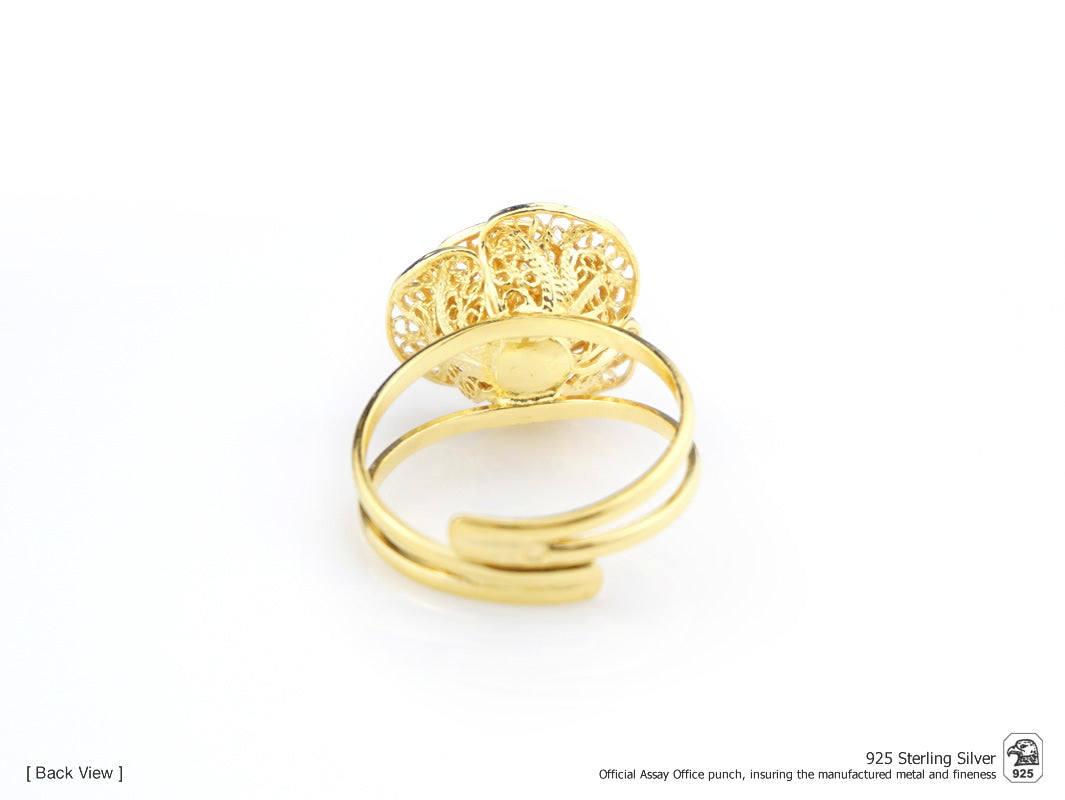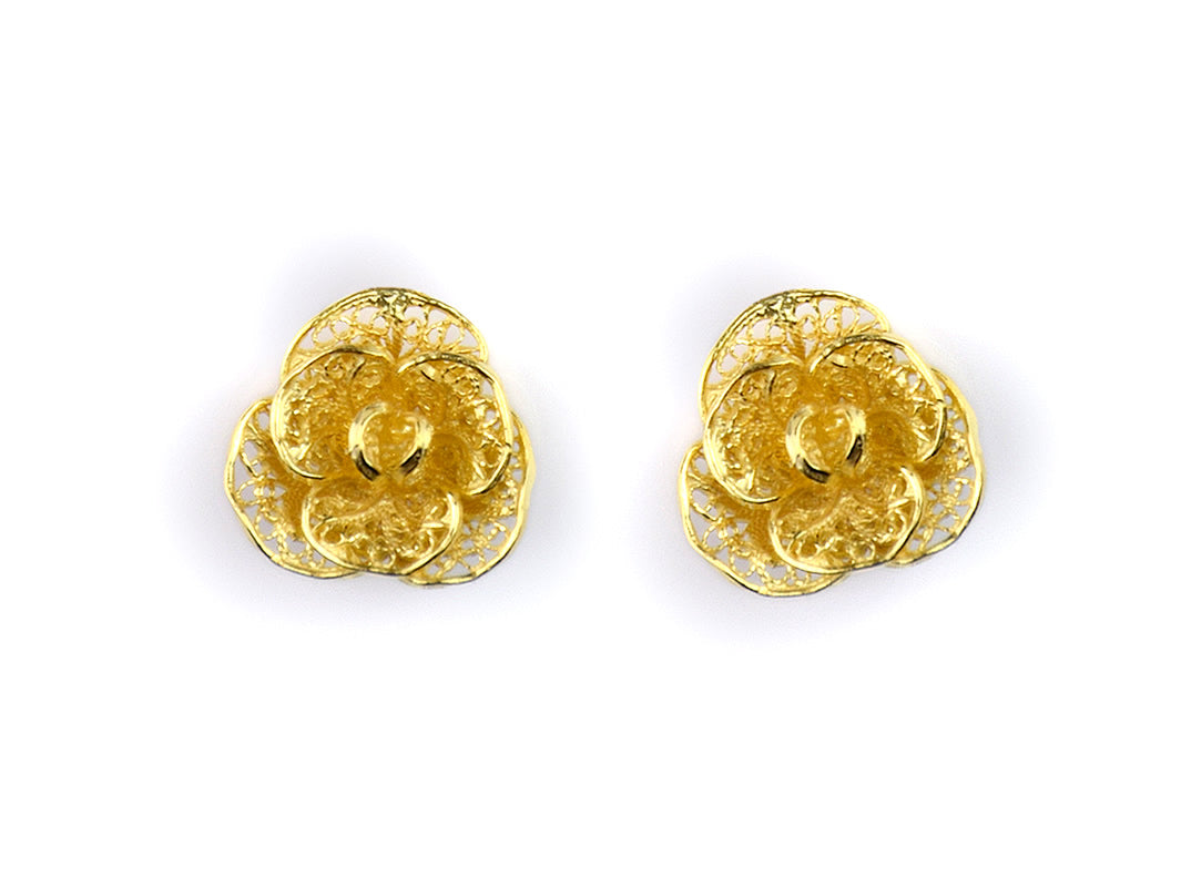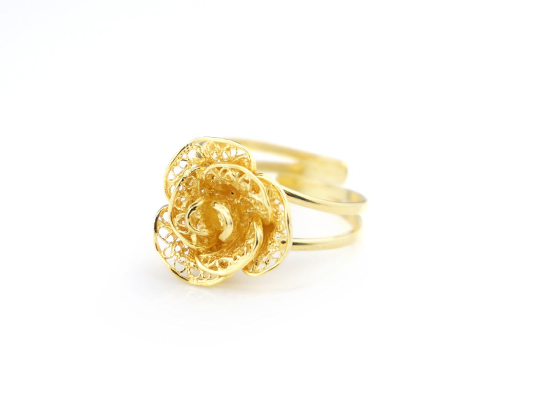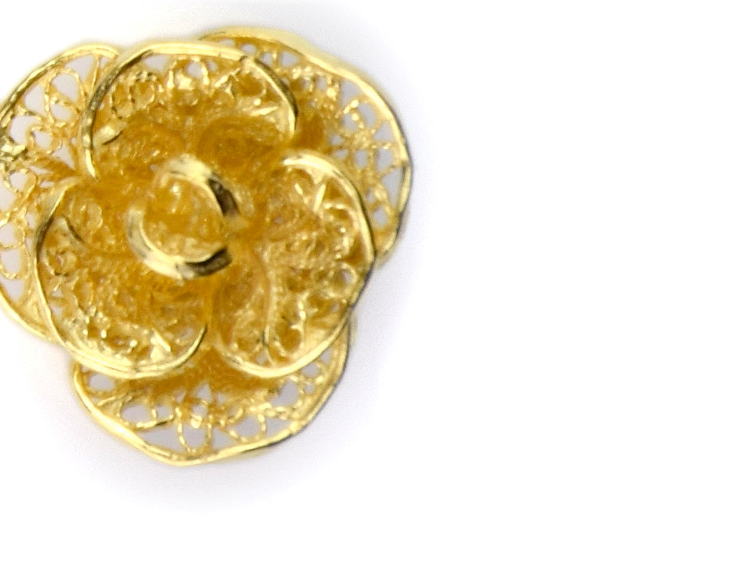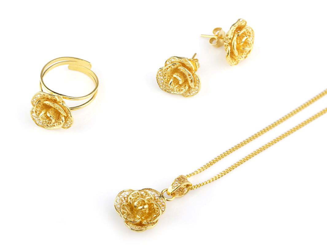 Élégante Parure "Fleurs Élaborées" composé de Boucles d'Oreilles moyennes, Bague réglable et Collier avec chaine réglable. Filigrane Portugaise, fabriqué au Portugal en Argent 925 Doré.