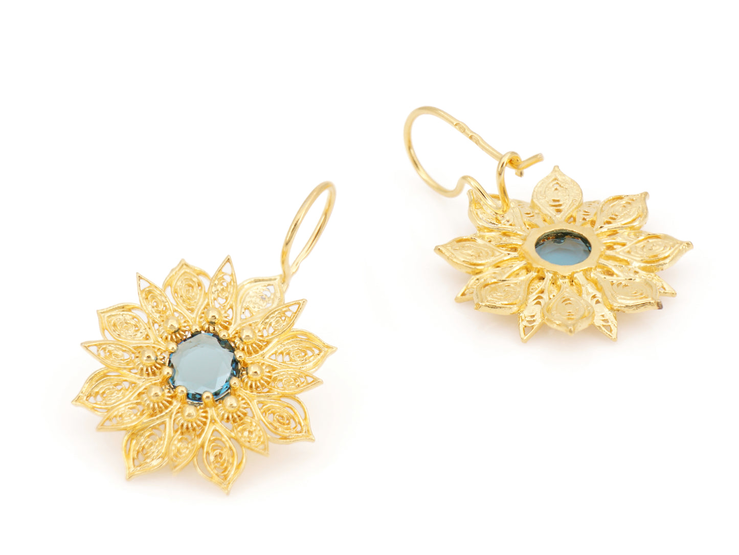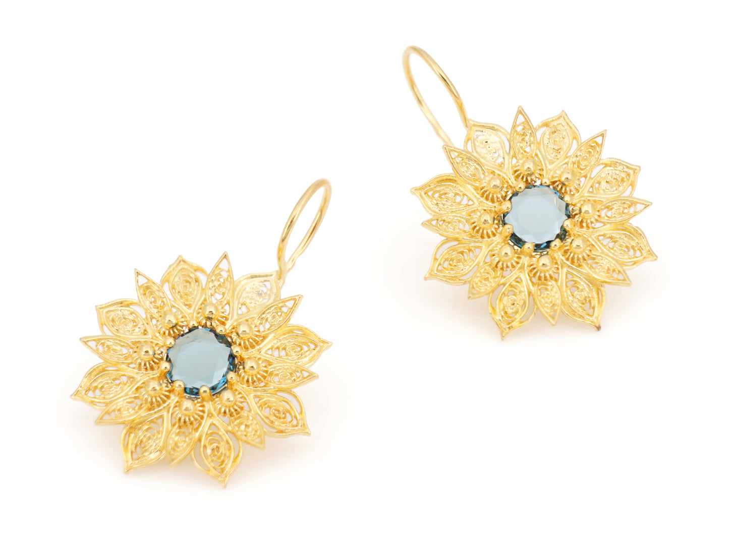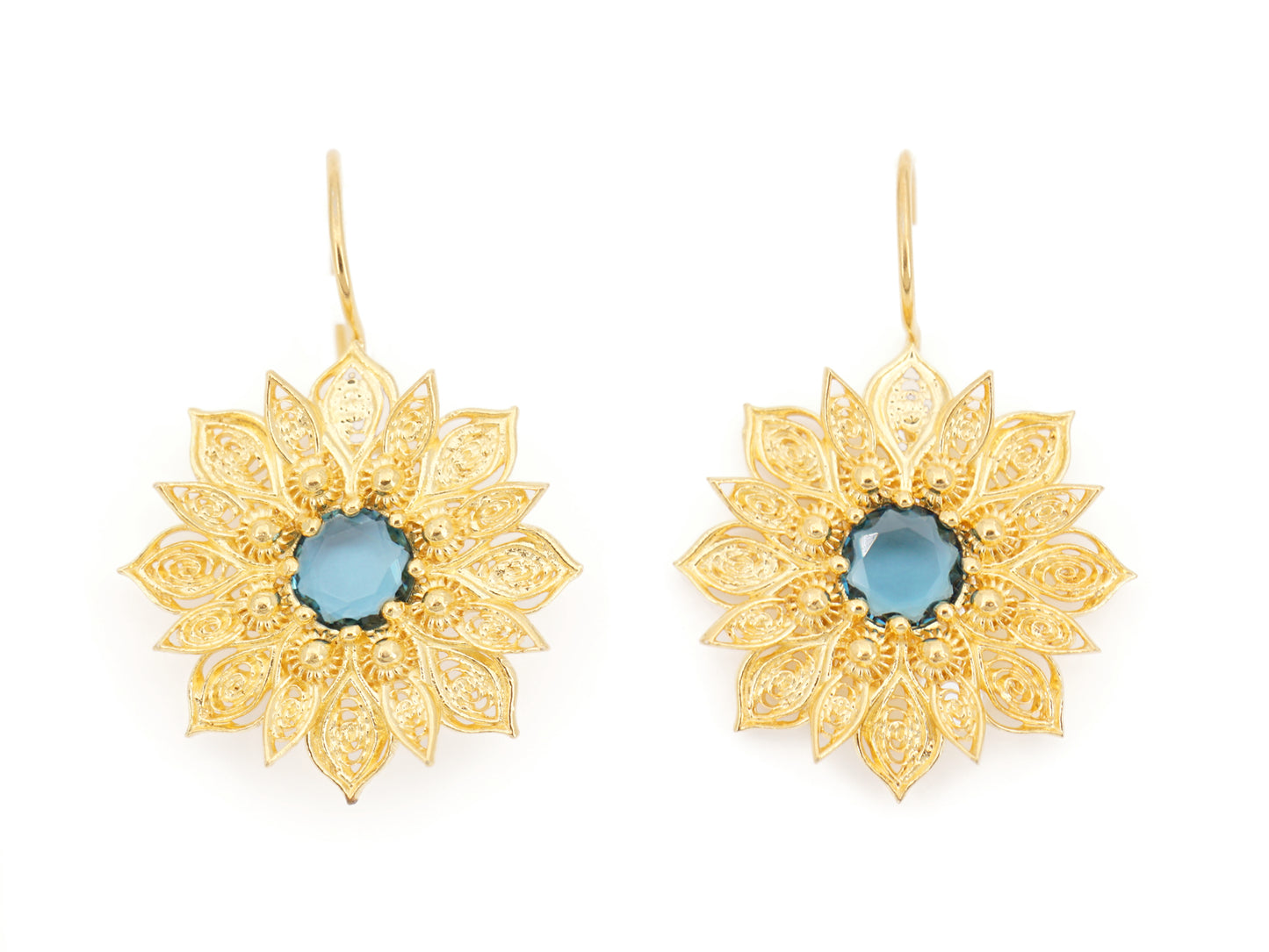 Élégantes Boucles d'Oreilles Fleurs Riches, avec Pierres en verre minéral poli, fermoir à crochet. Filigrane Portugaise, fabriqué au Portugal en Argent 925 Doré.