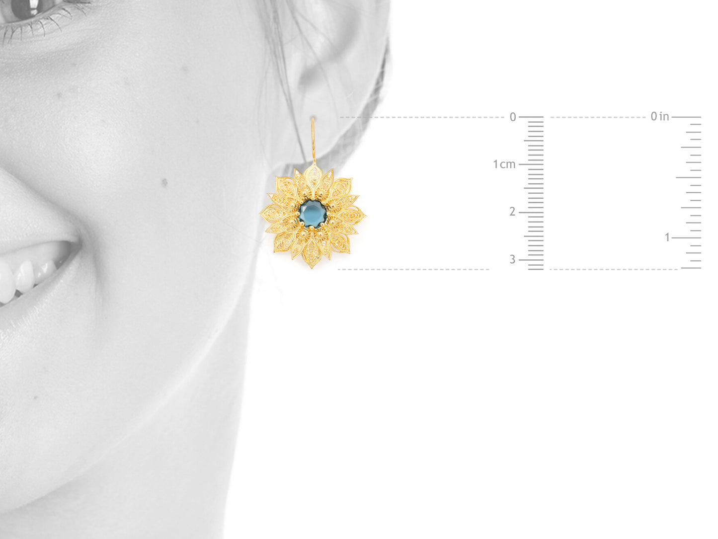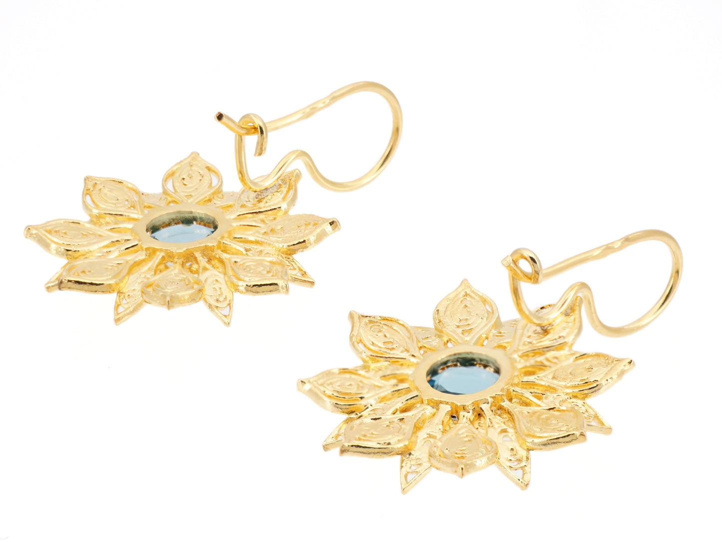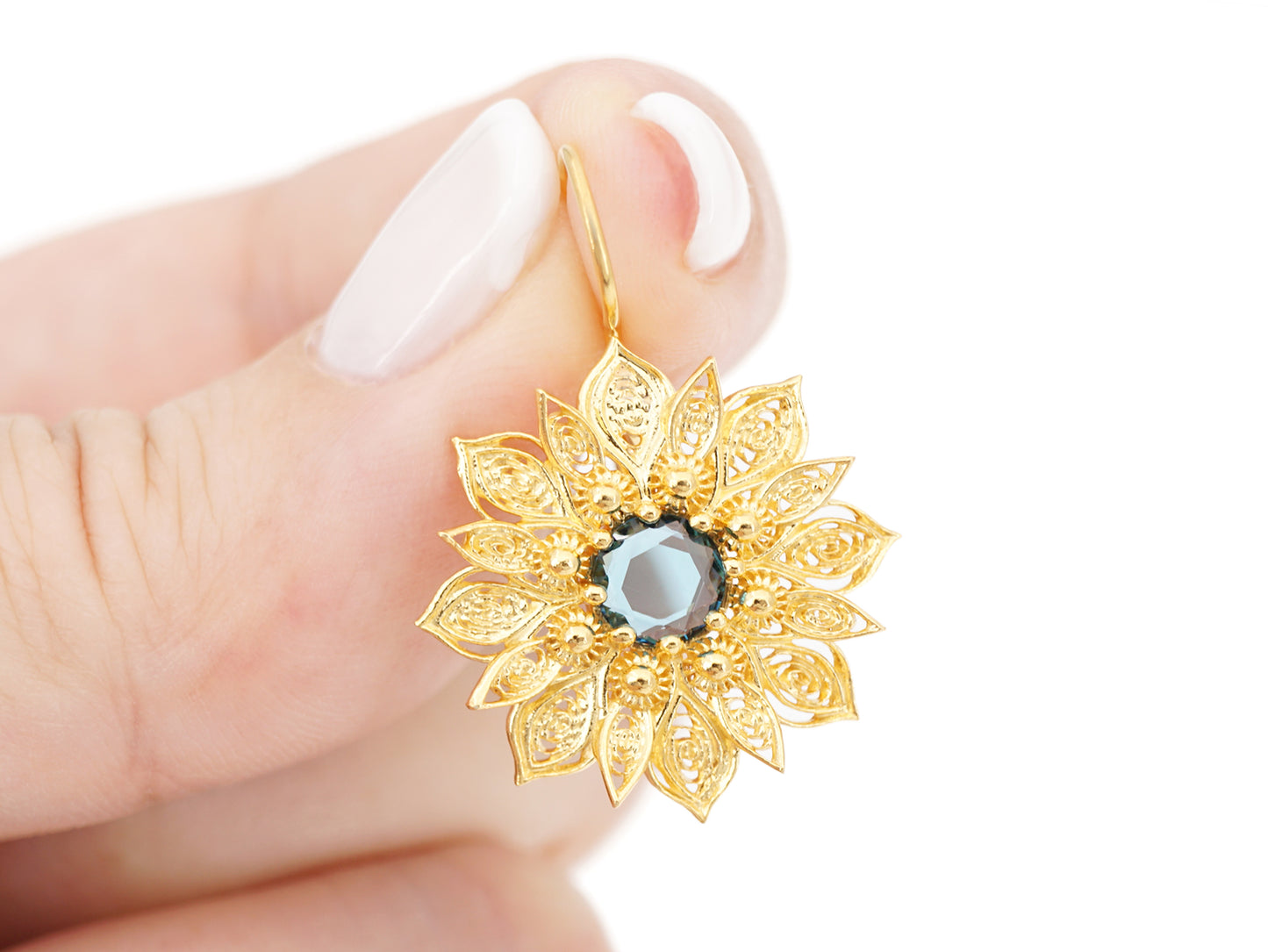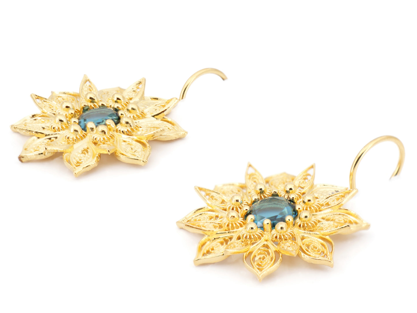 Élégantes Boucles d'Oreilles Fleurs Riches, avec Pierres en verre minéral poli, fermoir à crochet. Filigrane Portugaise, fabriqué au Portugal en Argent 925 Doré.