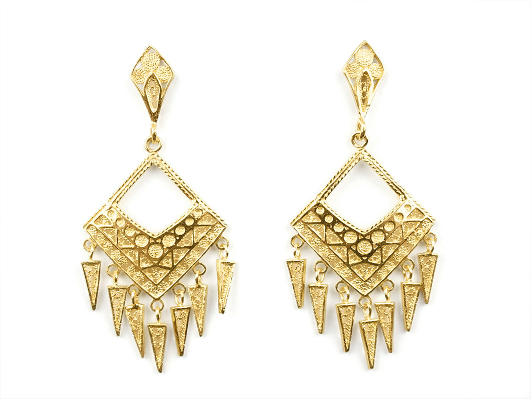 Élégantes Boucles d'Oreilles d'inspiration ethnique avec des franges, à poussette. Filigrane Portugaise, fabriqué au Portugal en Argent 925 Doré.
