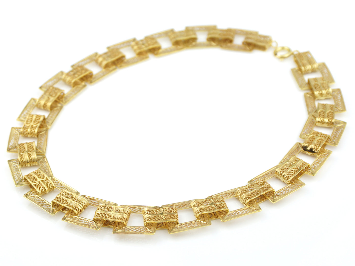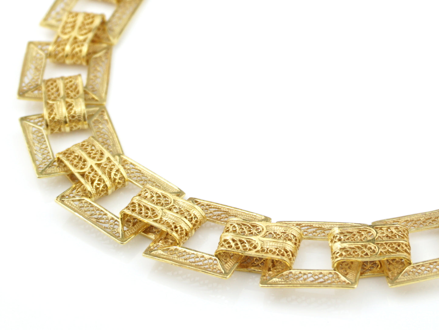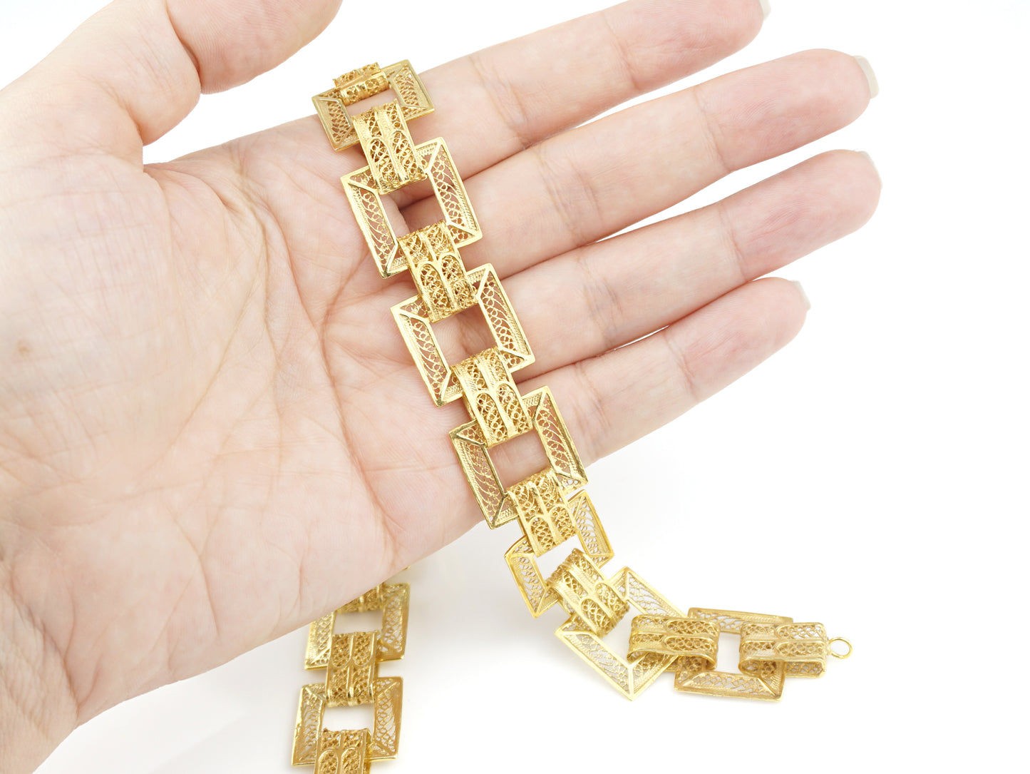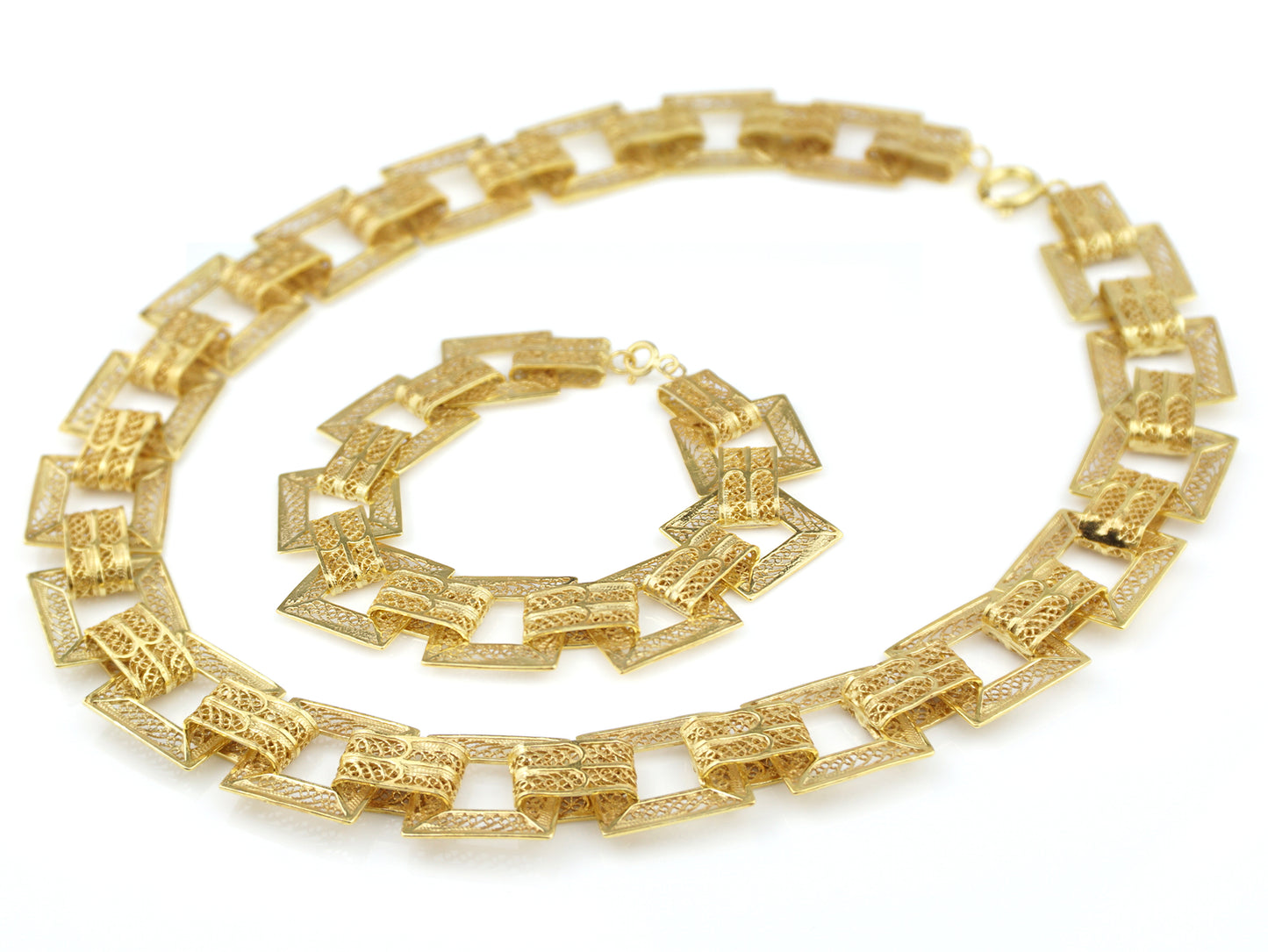 Parure Collier et Bracelet Carrés, Filigrane Portugaise, Argent 925 Doré