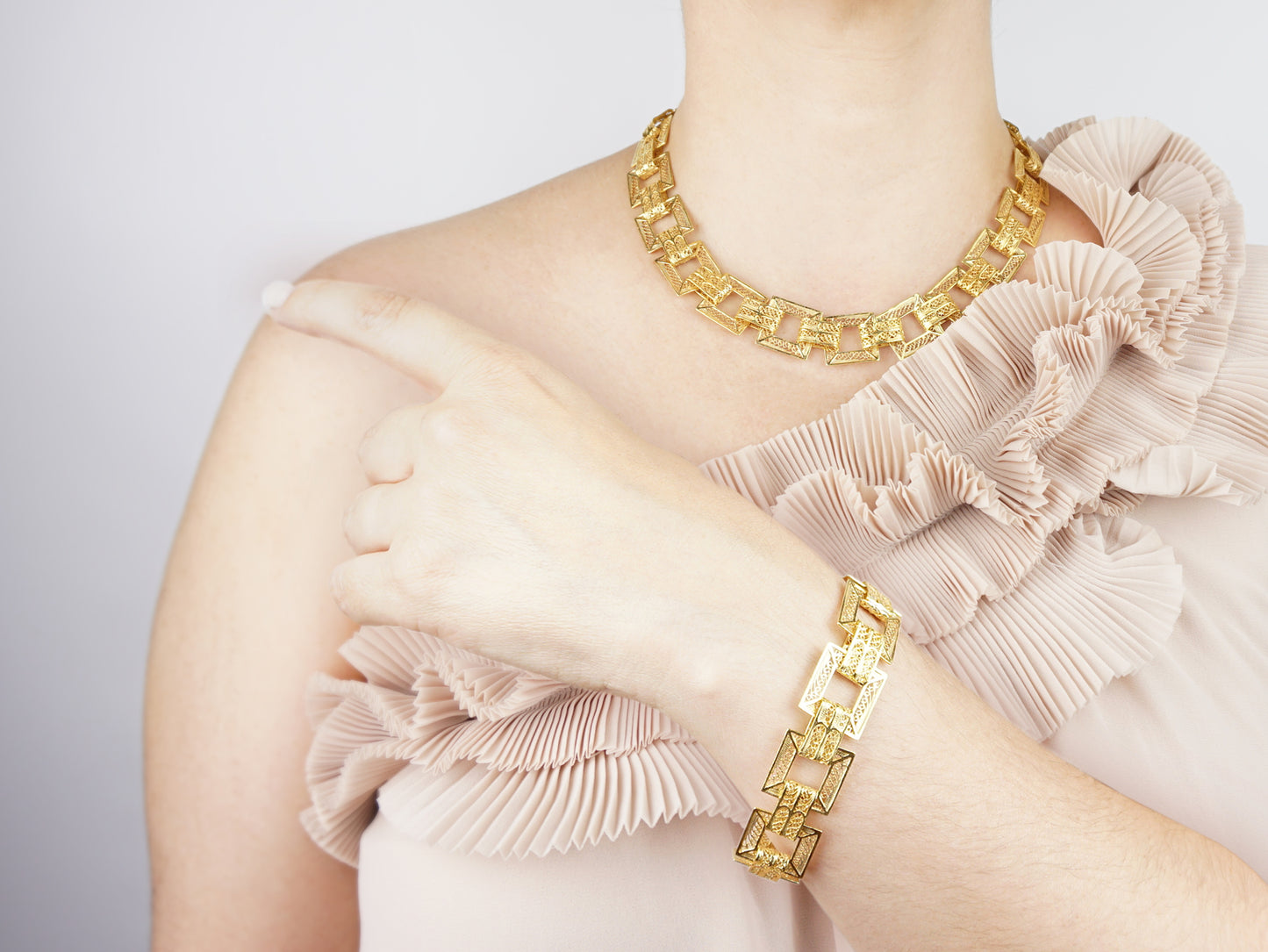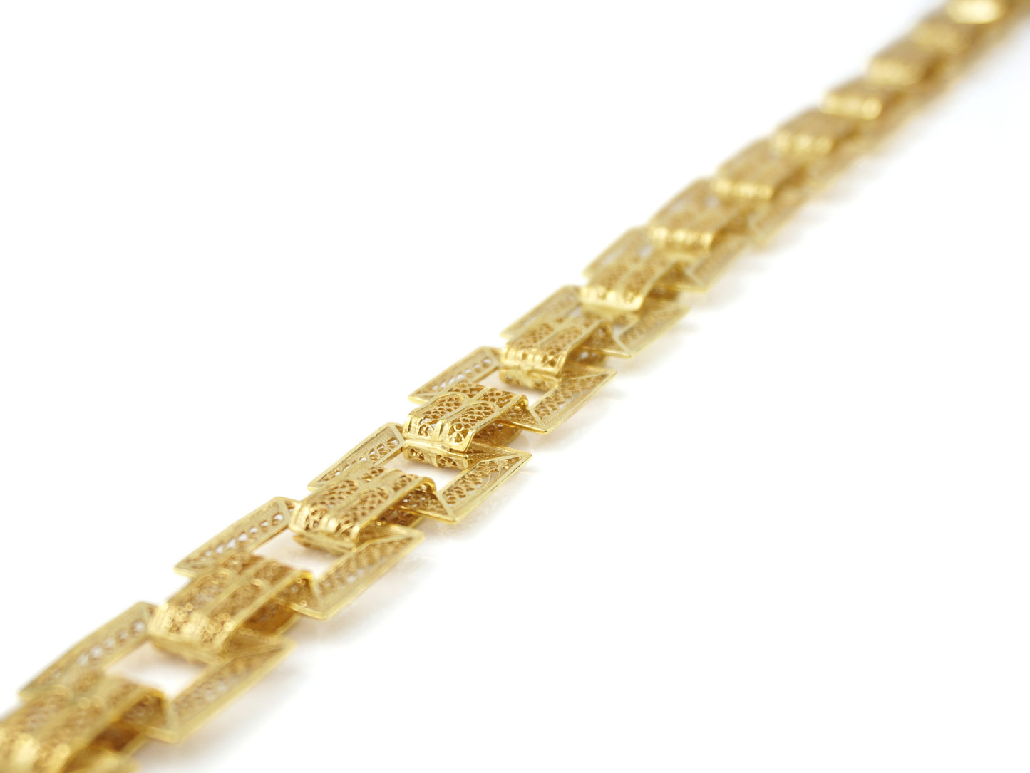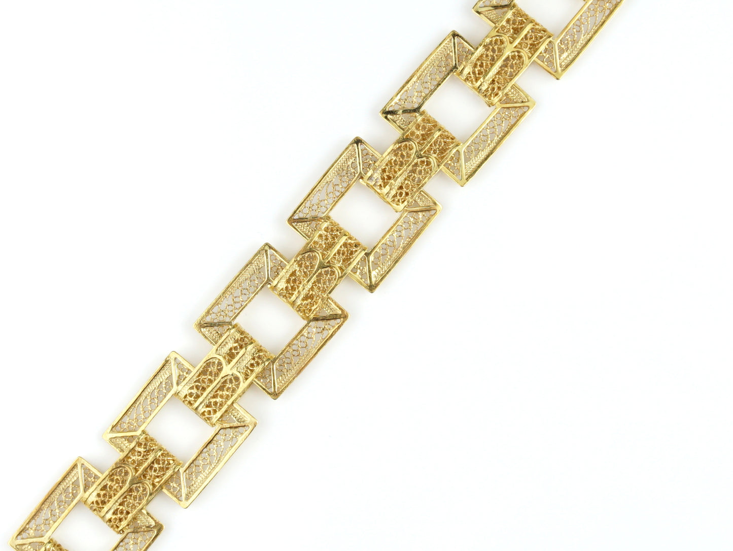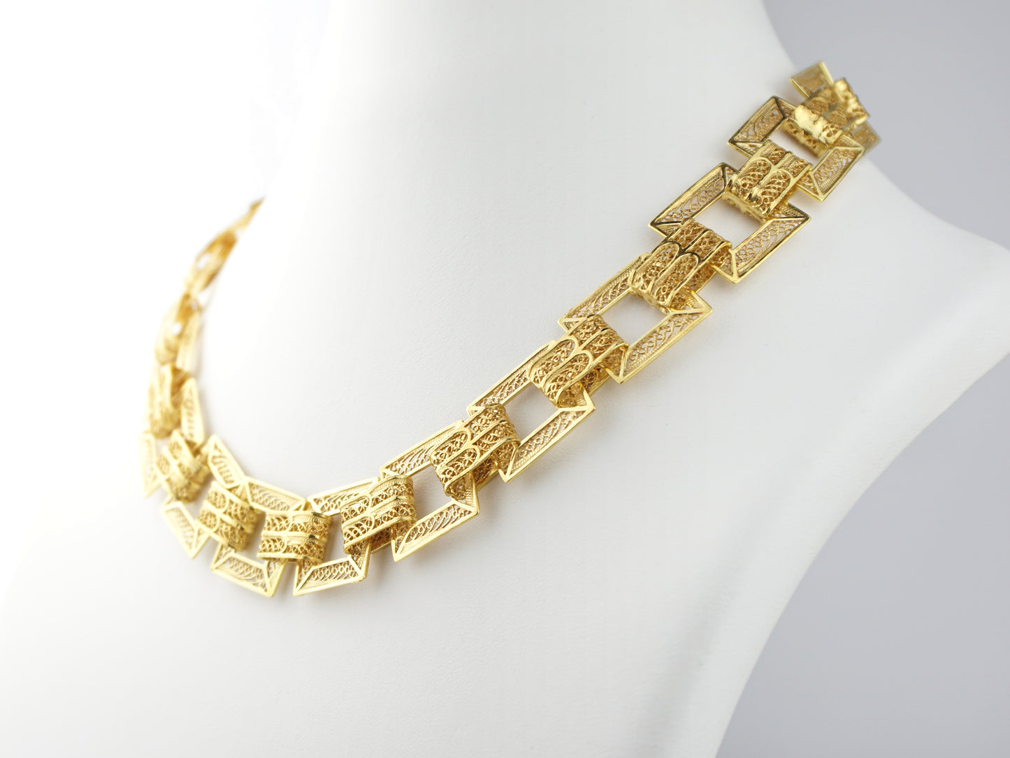 Parure Collier et Bracelet Carrés, Filigrane Portugaise, Argent 925 Doré