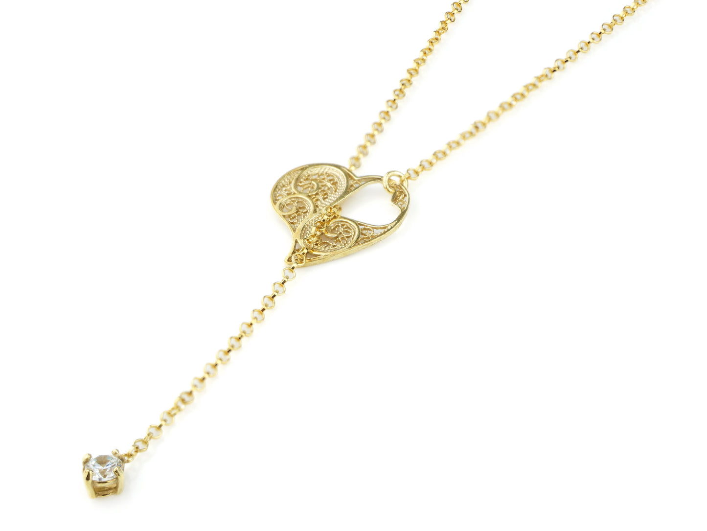 Élégant Collier avec Coeur et Zircone. Filigrane Portugaise, fabriqué au Portugal en Argent 925 Doré.