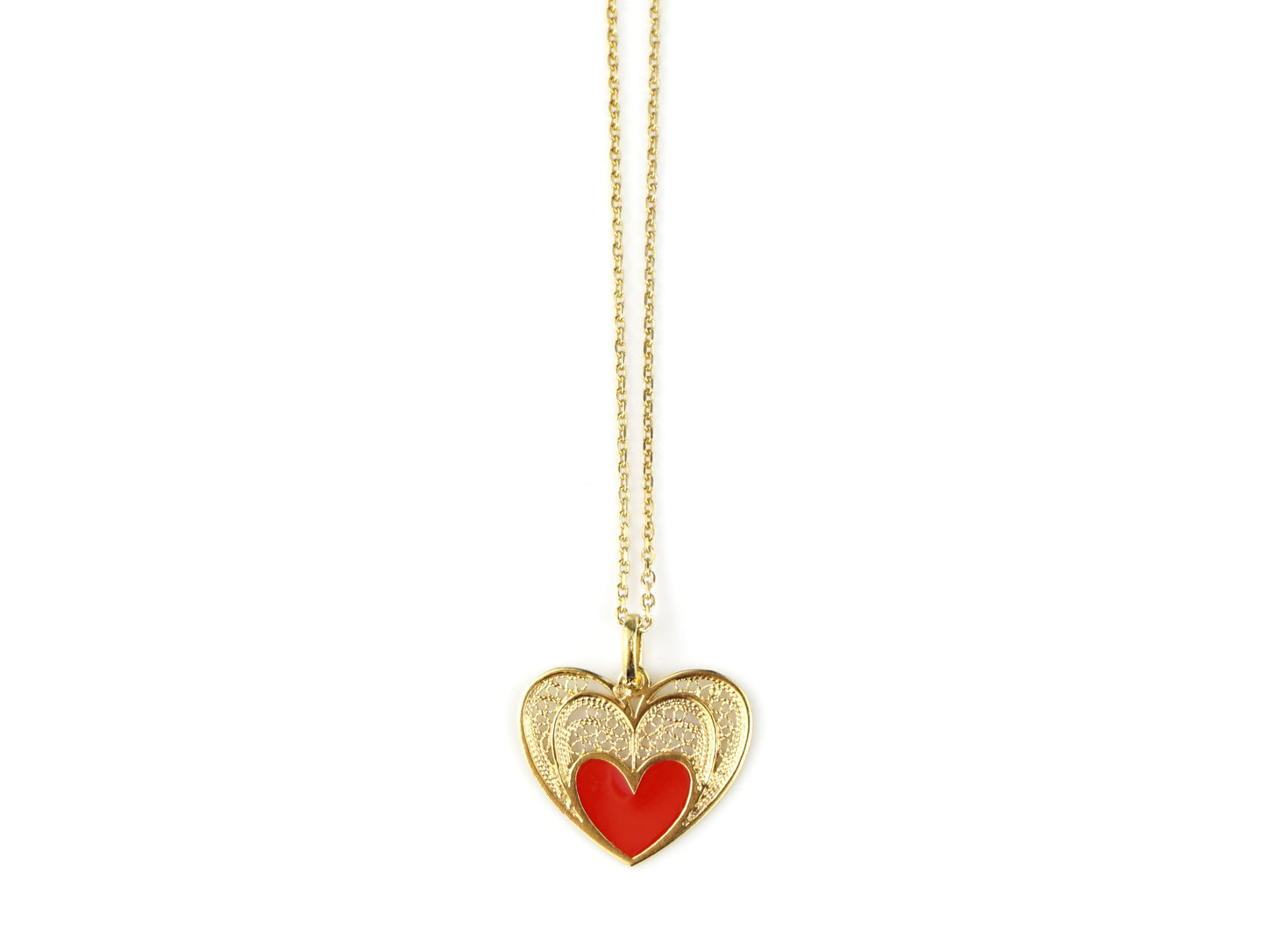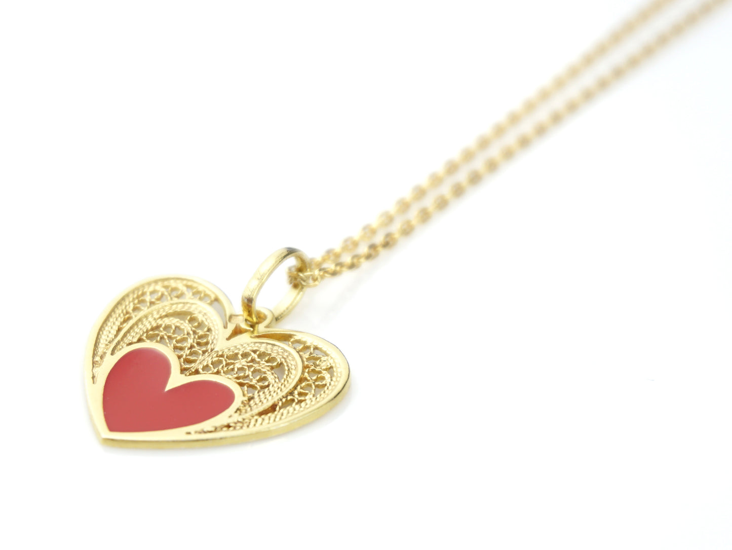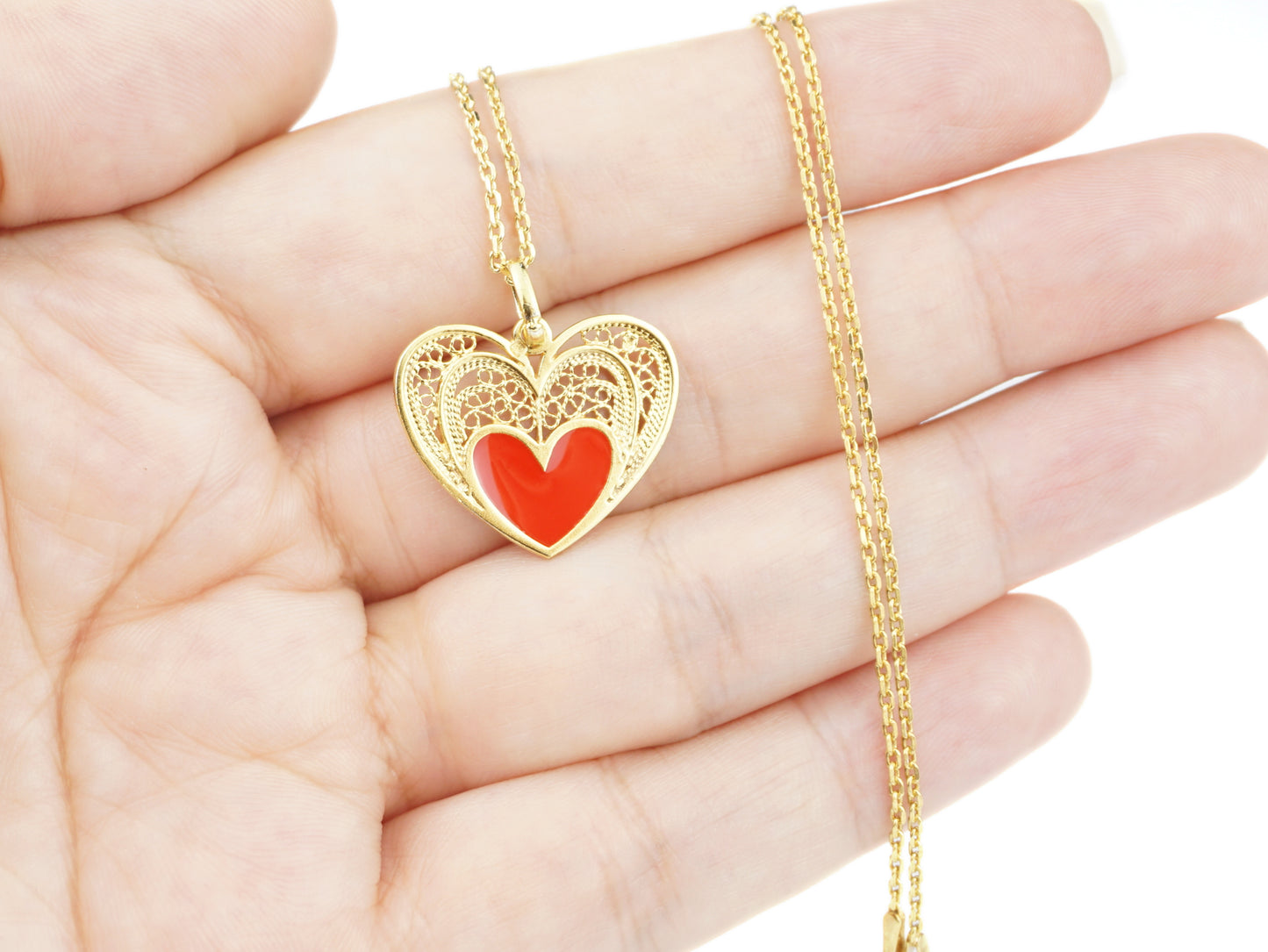 Collier au Coeur Émaillé, Filigrane Portugaise, Argent 925 Doré