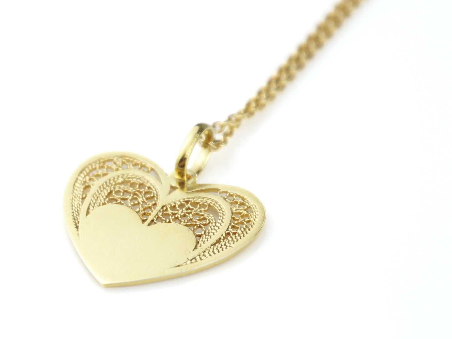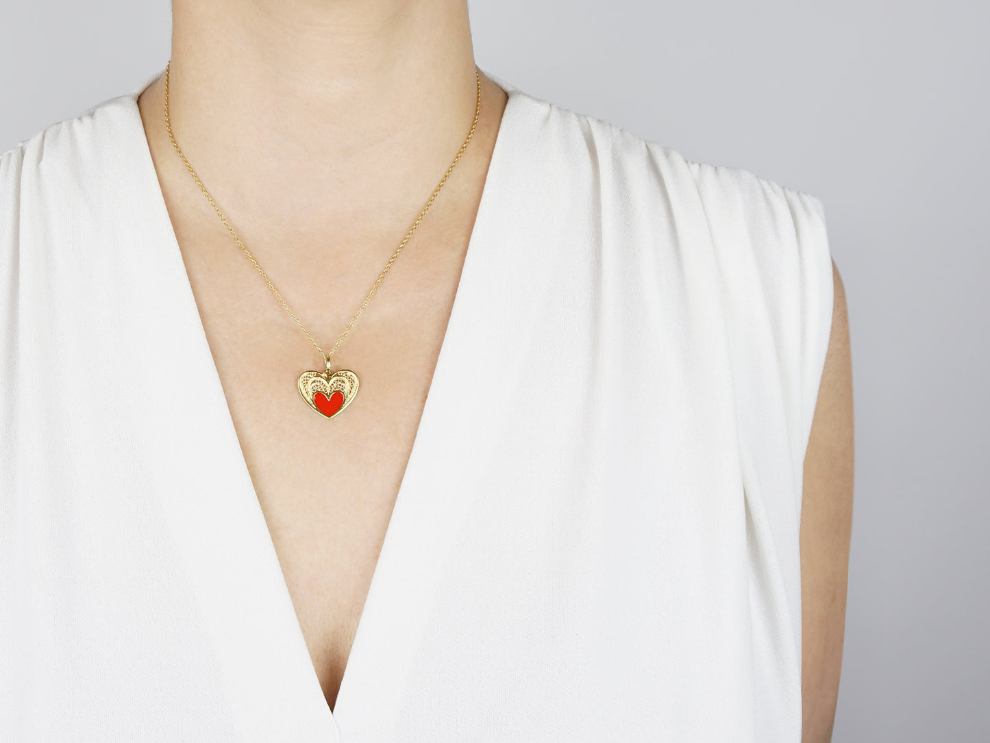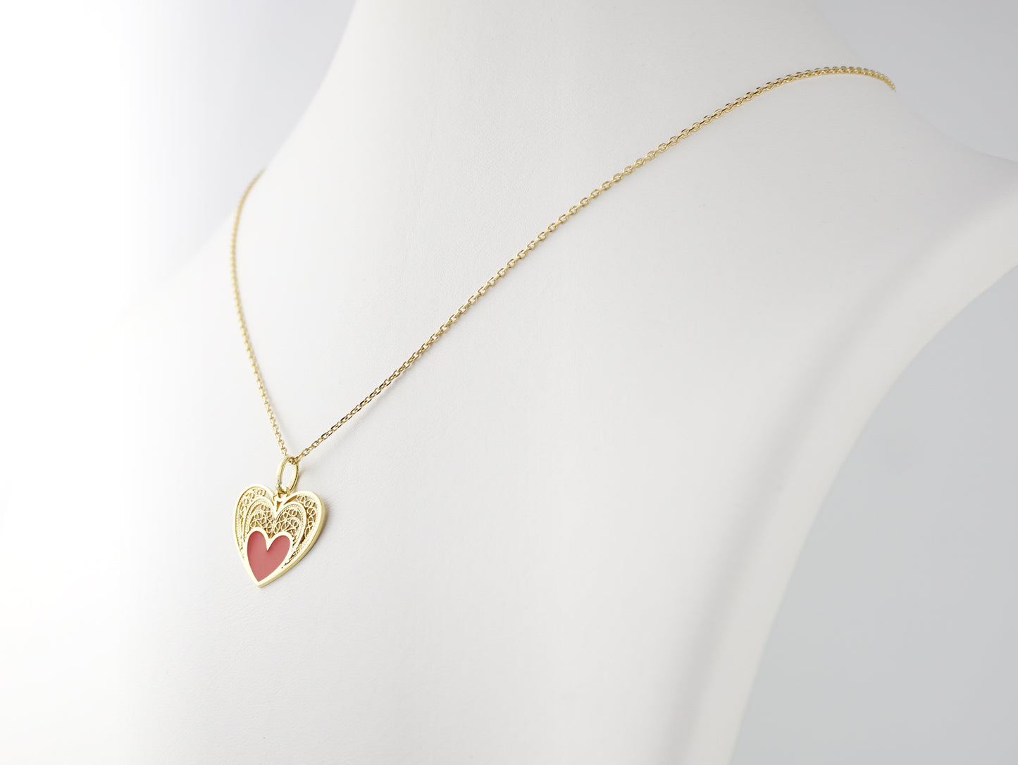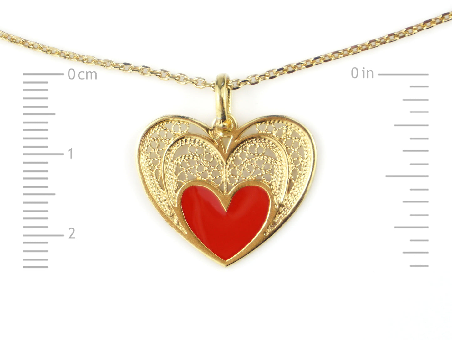 Collier au Coeur Émaillé, Filigrane Portugaise, Argent 925 Doré