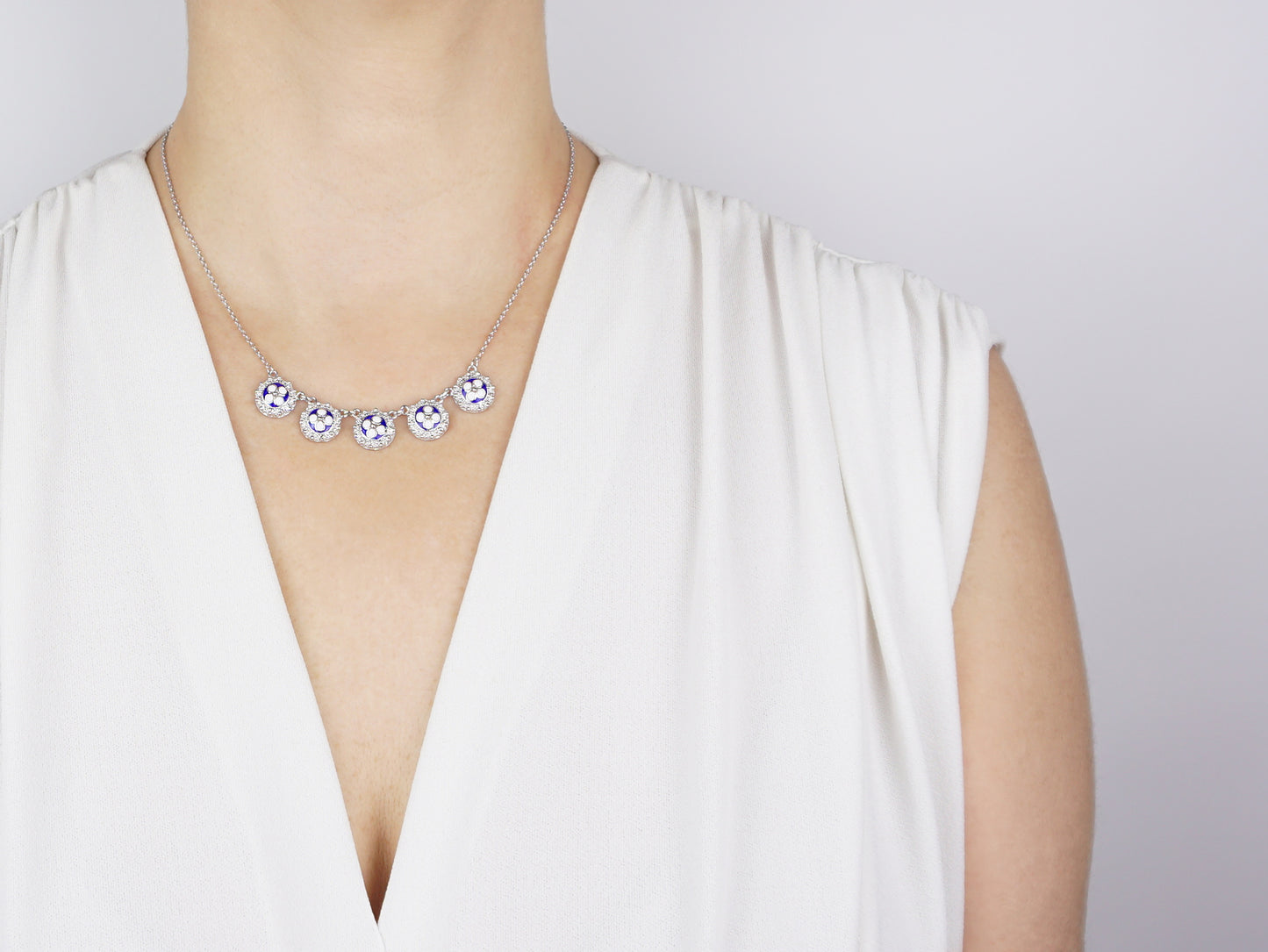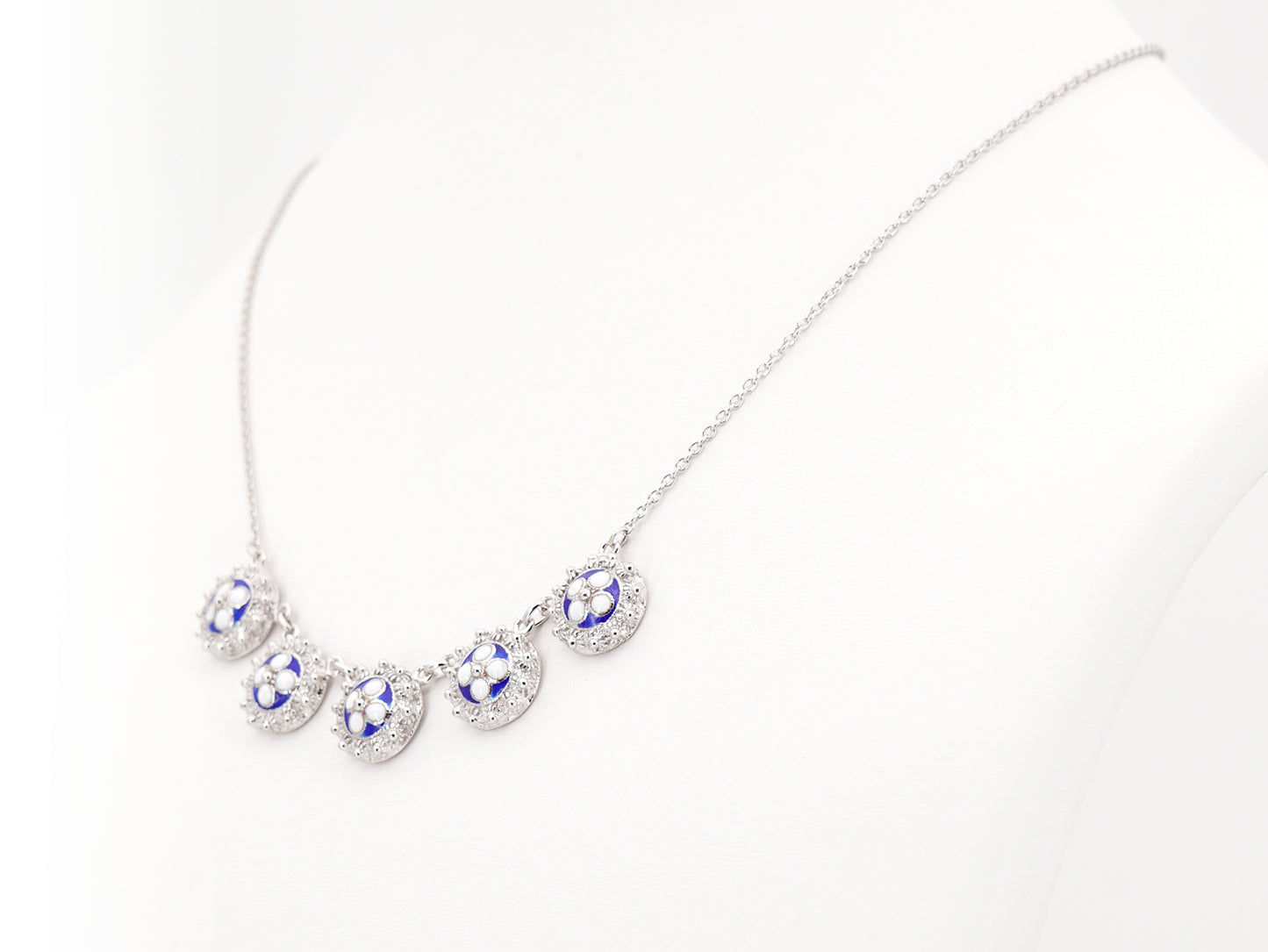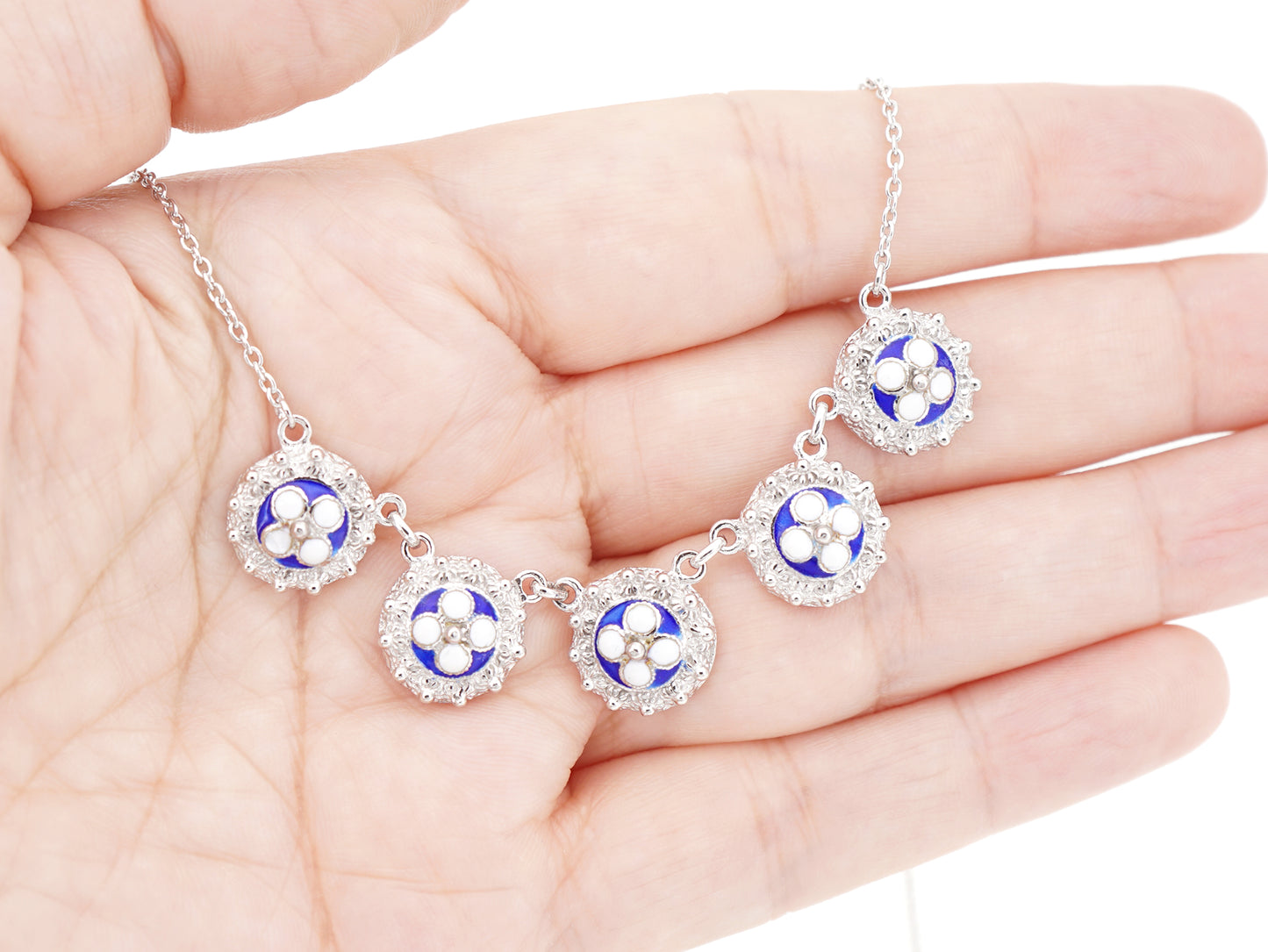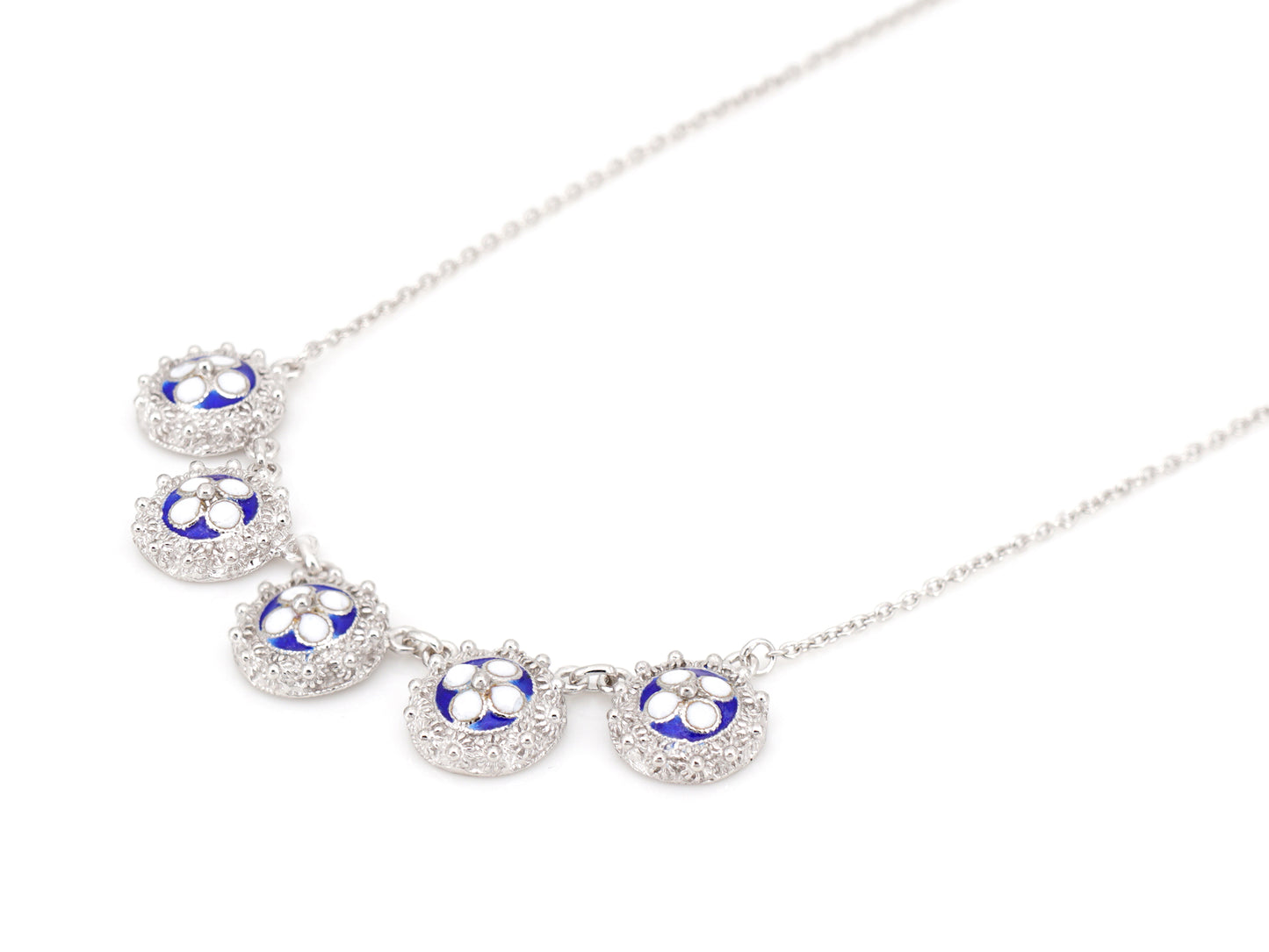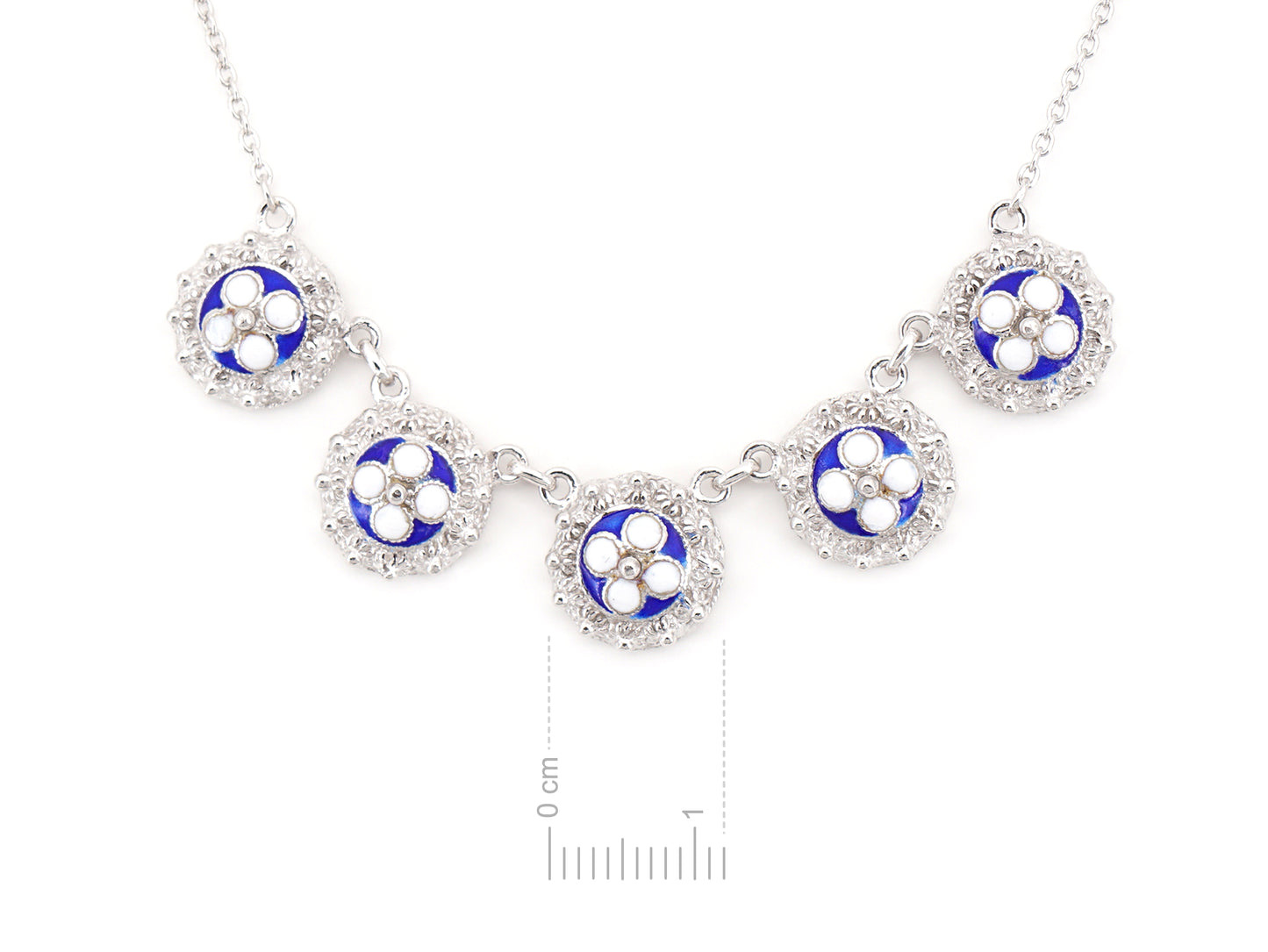 Élégant Collier aux cinq Caramujos classiques en émail bleu, avec chaine courte. Filigrane Portugaise, fabriqué au Portugal en Argent 925 Rhodié.