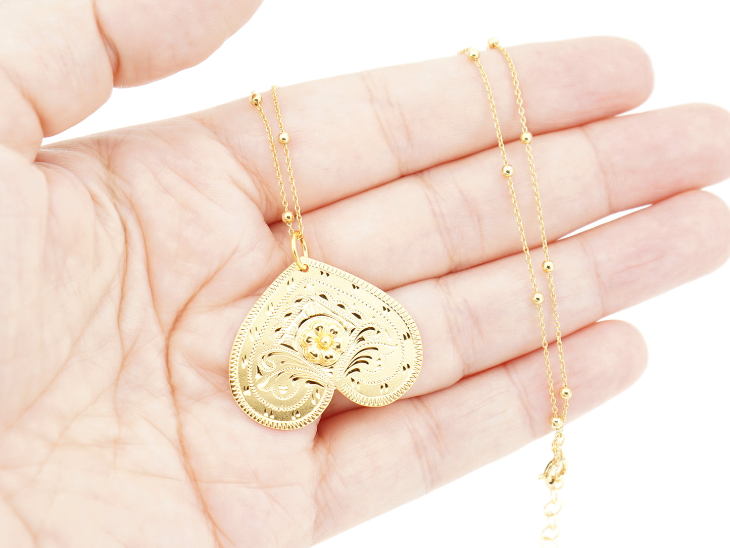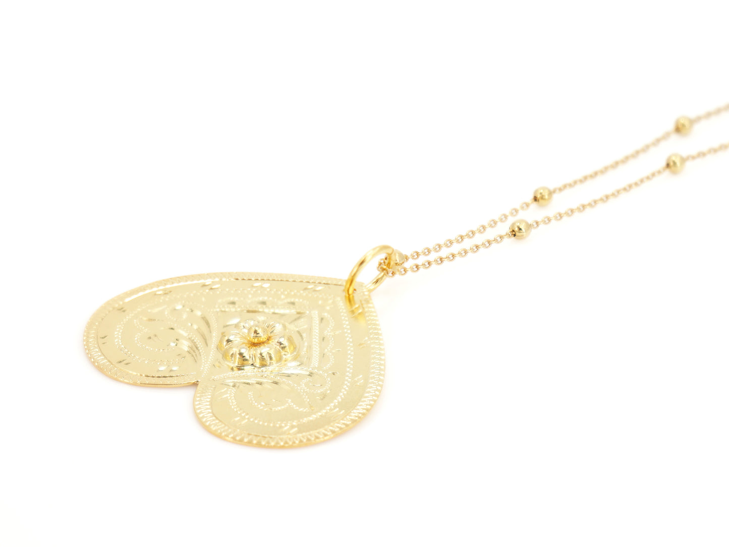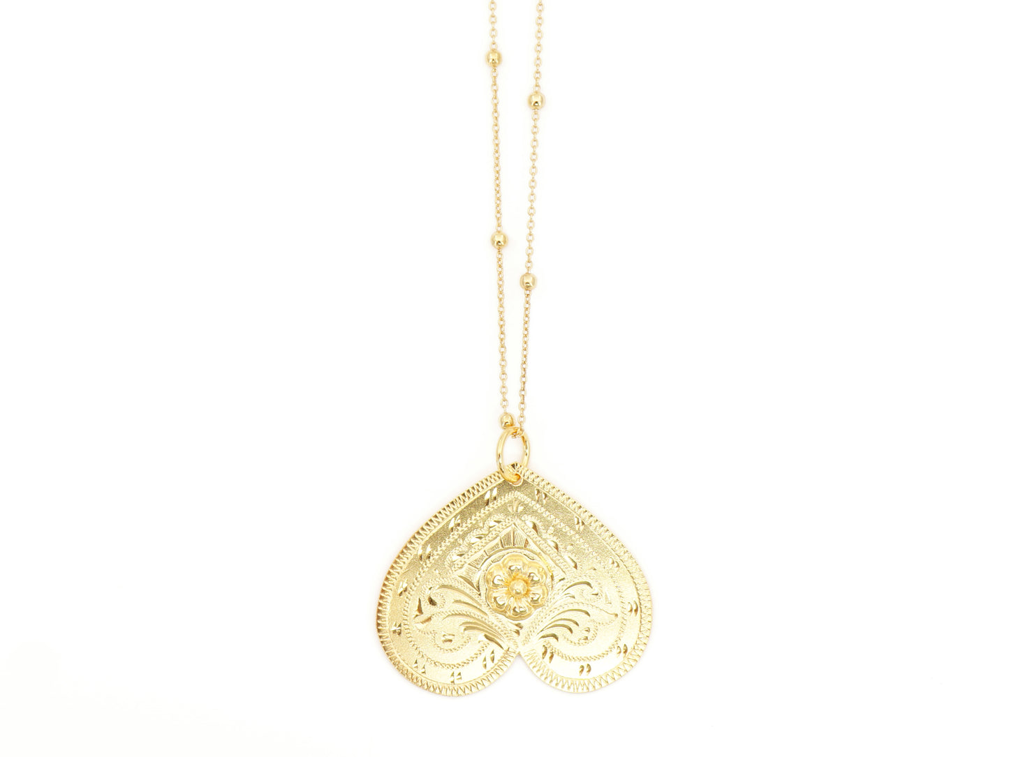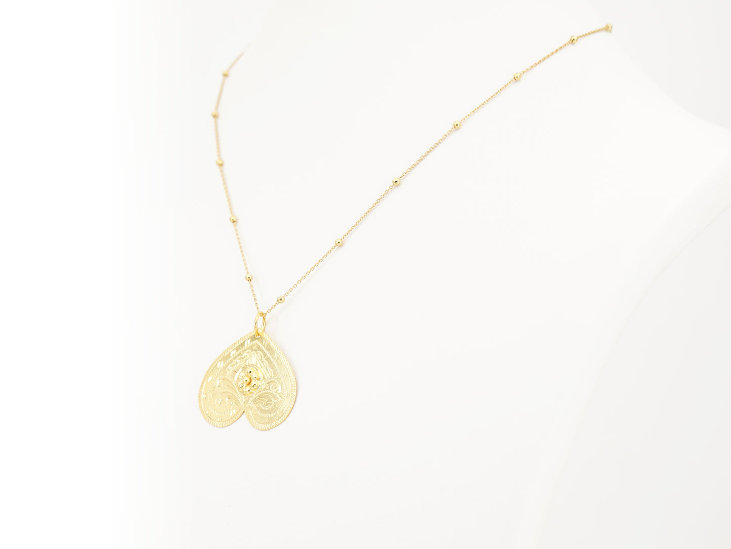 Elégant Collier "sphères" réglable, avec Médaille Coeur Inversé Moyen, gravée à la main par des talentueux artisans en Argent 925 Doré.