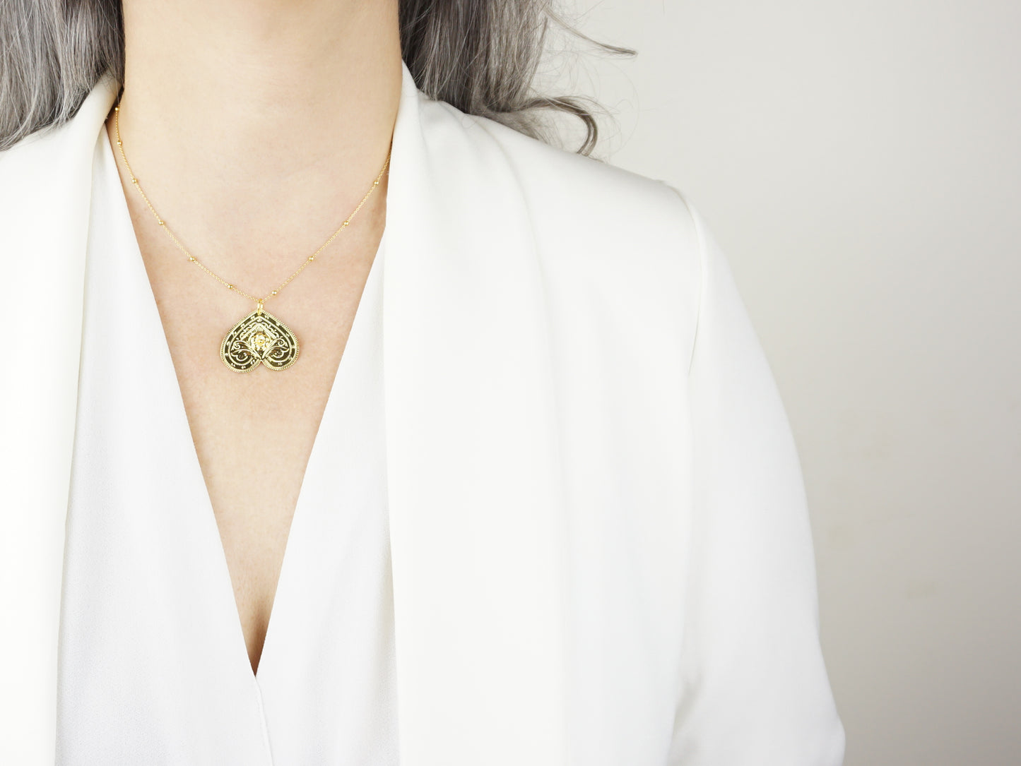 Traditionnellement sous la forme d'une médaille, les coeurs inversés sont fabriqués d'une fine plaque d'argent, sur laquelle une variété de motifs sont méticuleusement gravés à la main - avec une incidence plus marqué sur les motifs floraux.