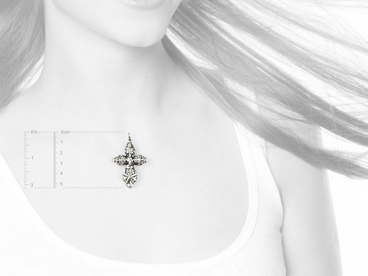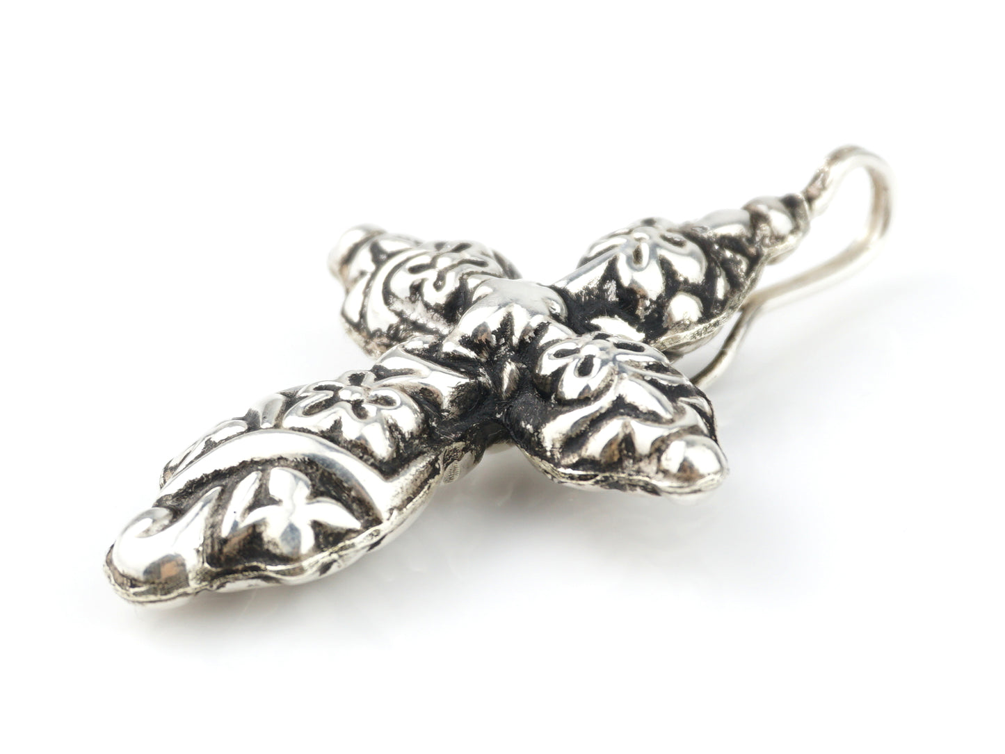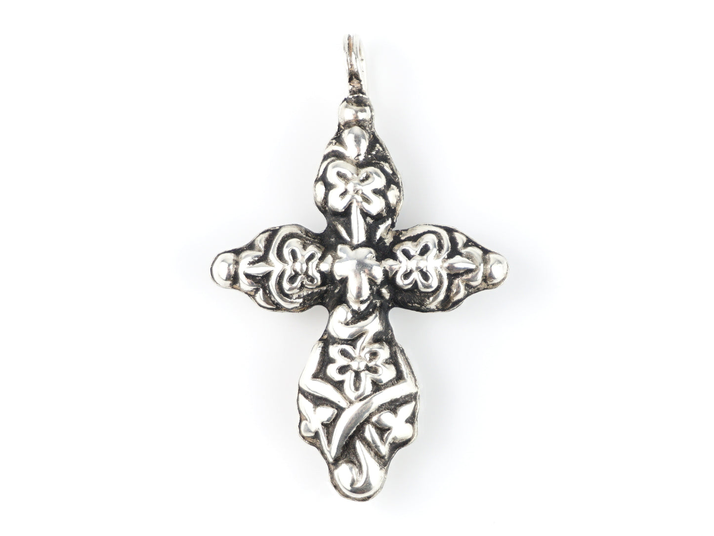 Élégante Médaille Baroque Petite Croix, creuse à double face, fabriqué à la main au Portugal par des artisans talentueux, en Argent 925 Patiné.