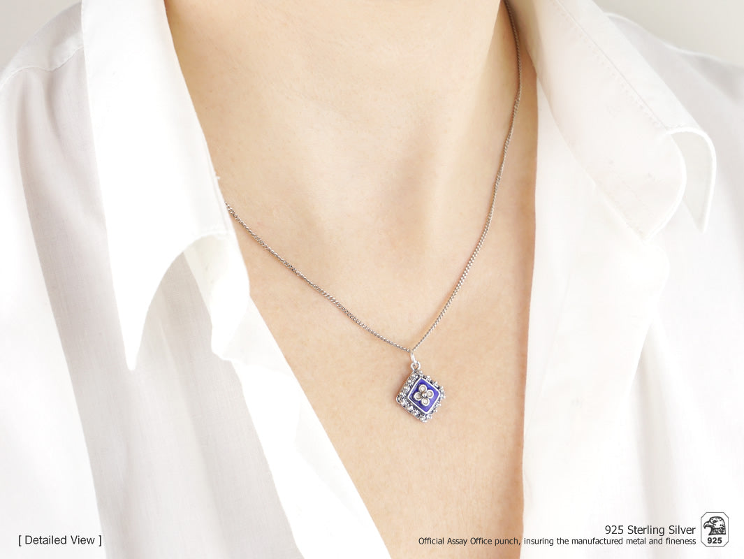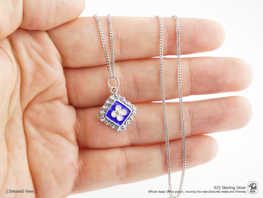 Élégant Collier avec Médaille Caramujo Carré Émailé en Bleu et Blanc, chaine courte réglable. Filigrane Portugaise, fabriqué au Portugal en Argent 925.