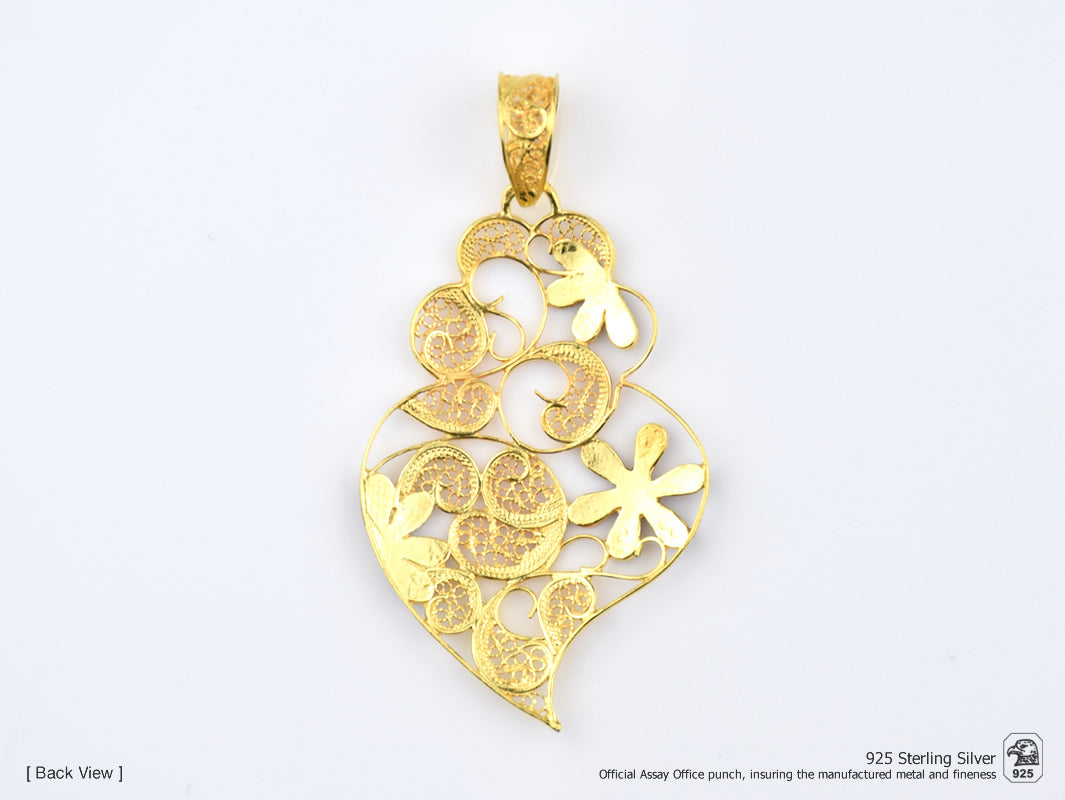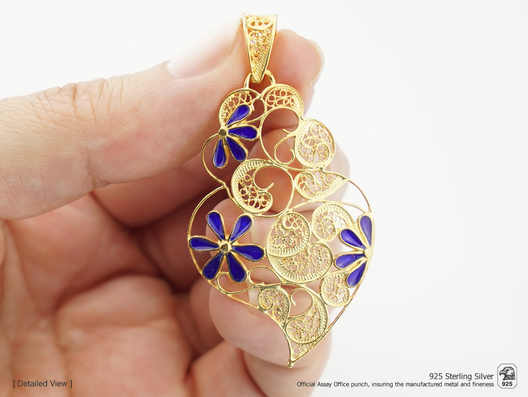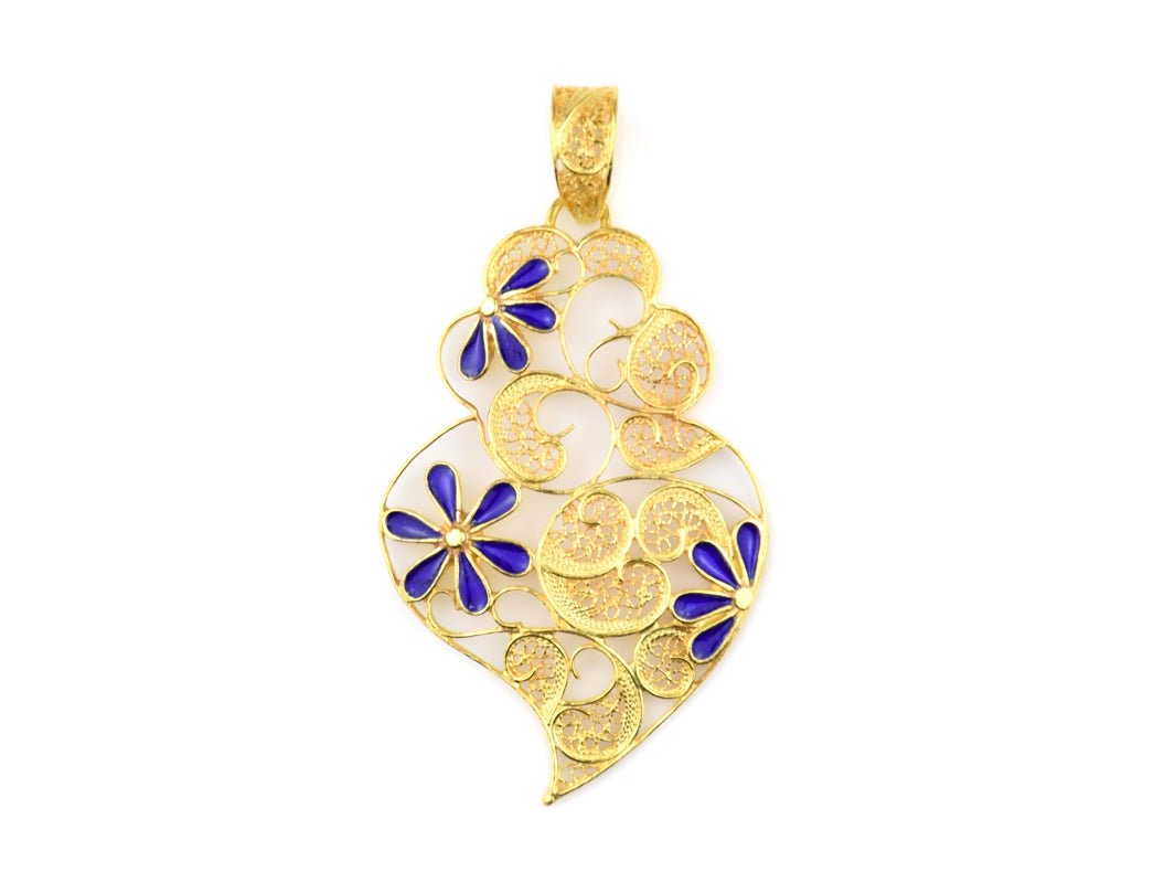 Élégante Médaille Coeur Grand aux Fleurs Émaillées. Filigrane Portugaise, fabriqué au Portugal en Argent 925 Doré.
