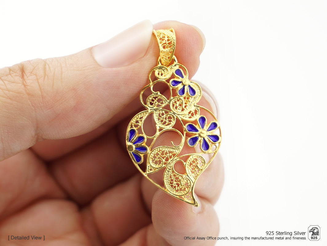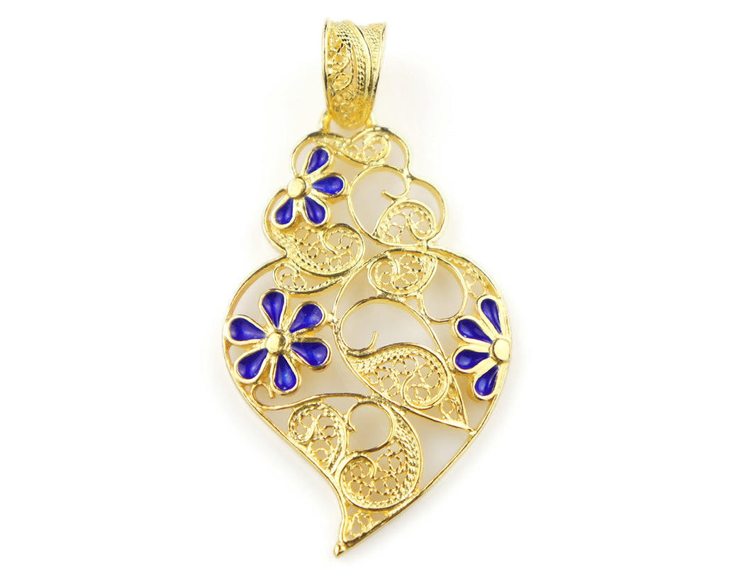 Élégante Médaille Coeur Moyen aux Fleurs Émaillées. Filigrane Portugaise, fabriqué au Portugal en Argent 925 Doré.