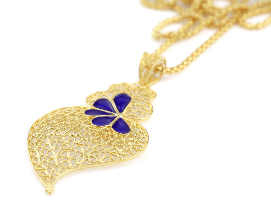 Élégante Sautoir Granité avec Médaille Coeur de Viana Grande aux Pétales Émaillés en Bleu. Filigrane Portugaise, fabriqué au Portugal en Argent 925 Doré.
