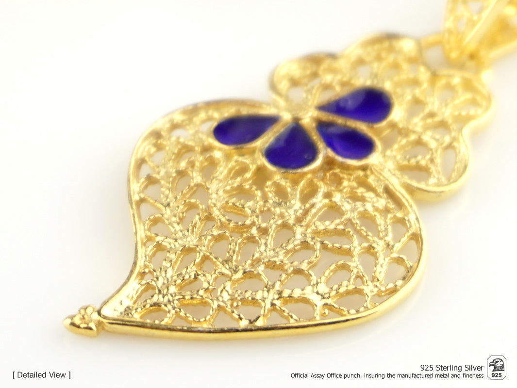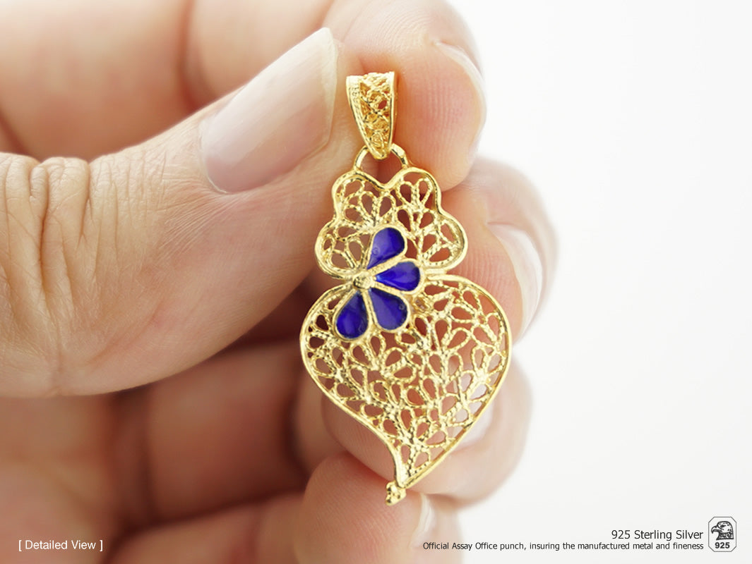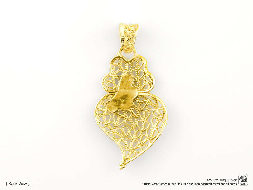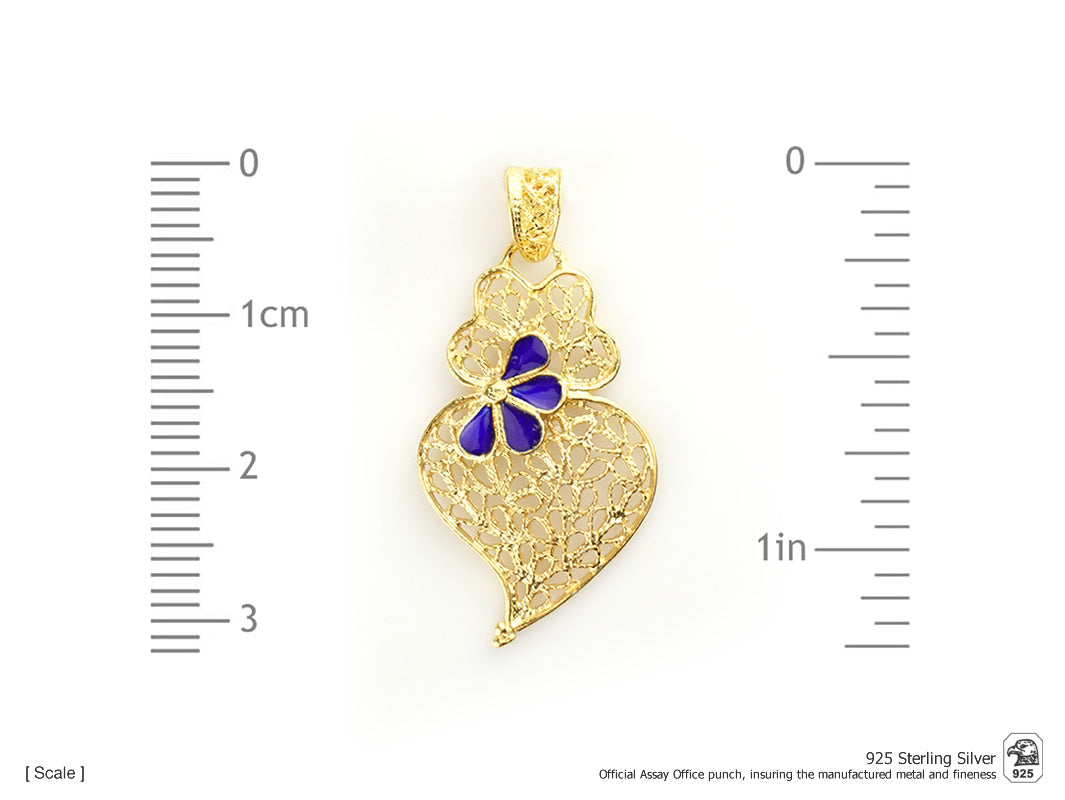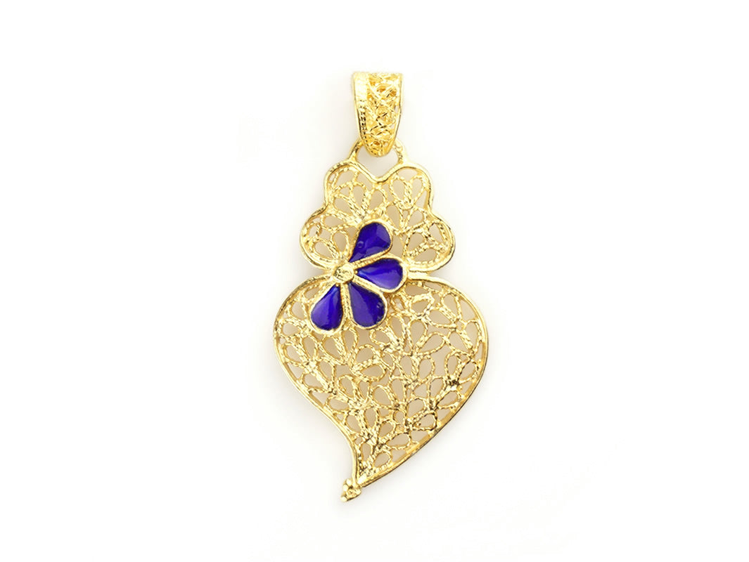 Élégante médaille Petit Coeur de Viana aux Pétales Émaillés. Filigrane Portugaise, fabriqué au Portugal en Argent 925 Doré.