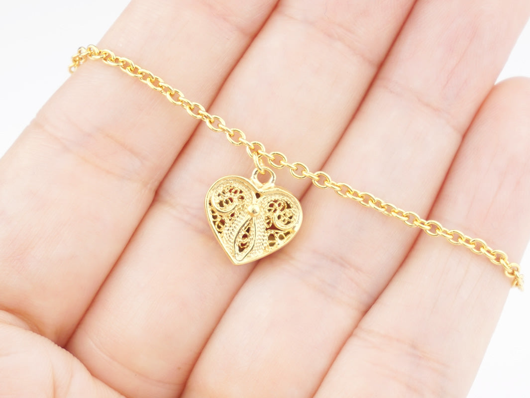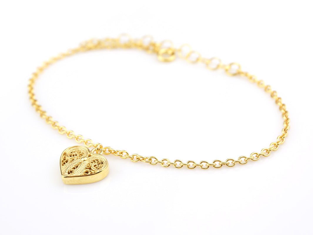 Élégant Bracelet avec breloque Coeur. Filigrane Portugaise, fabriqué au Portugal en Argent 925 Doré.