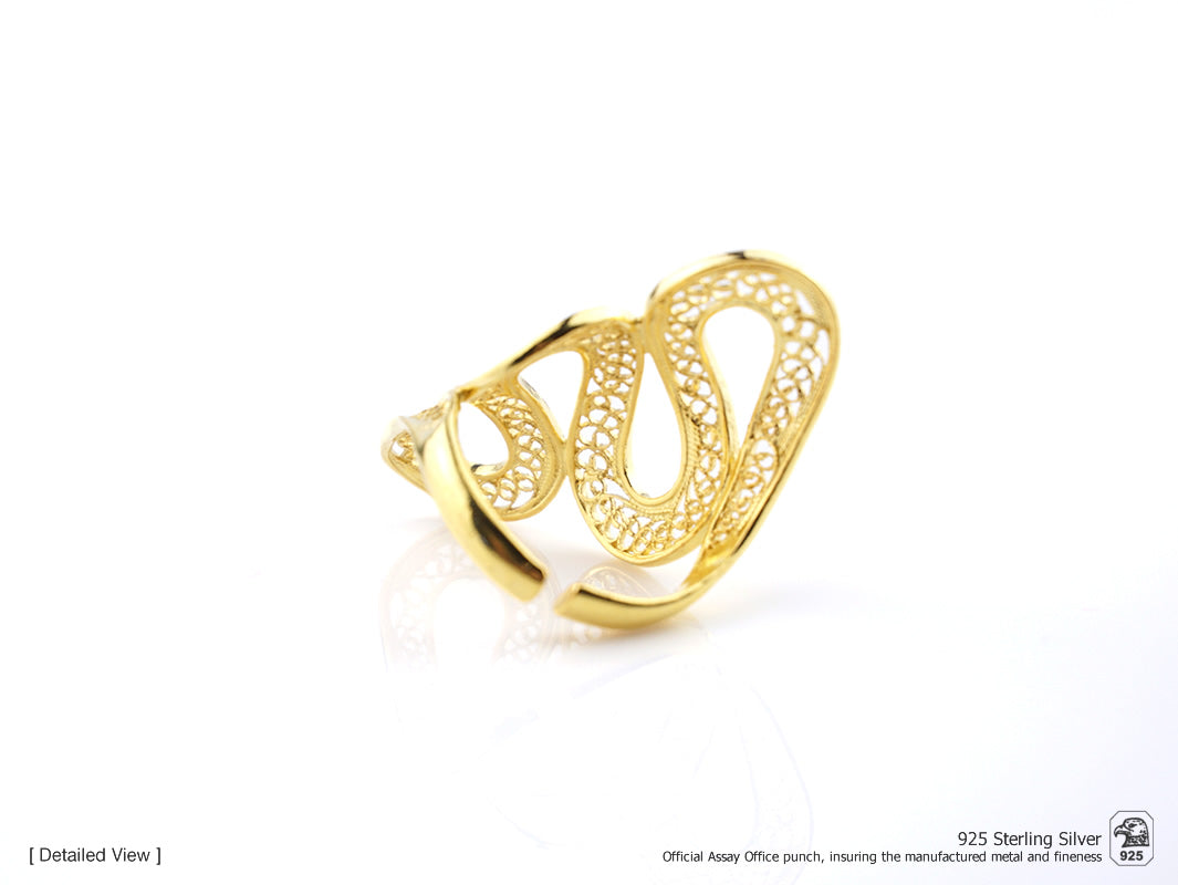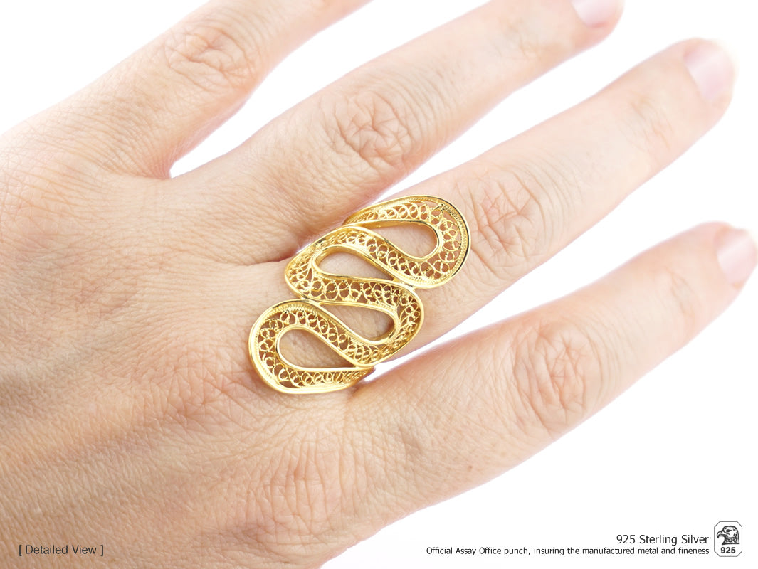 Elegante Anel Curvas, de tamanho ajustável. Filigrana Portuguesa, feito em Portugal em Prata de Lei 925, com Banho de Ouro.