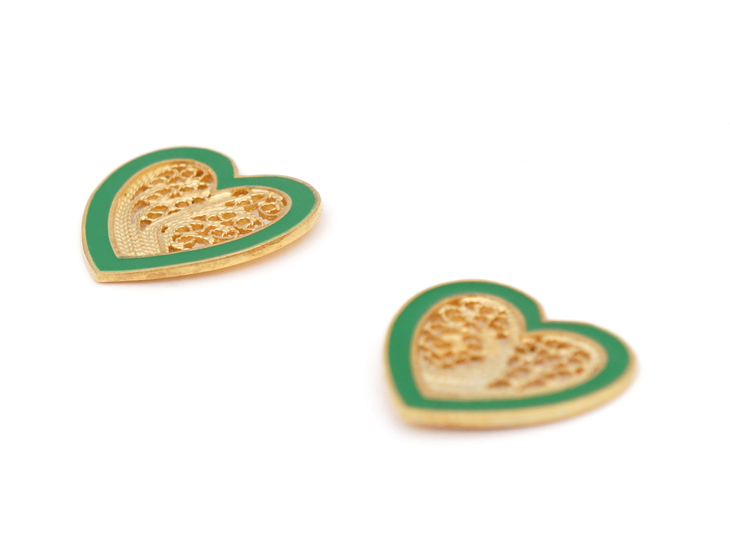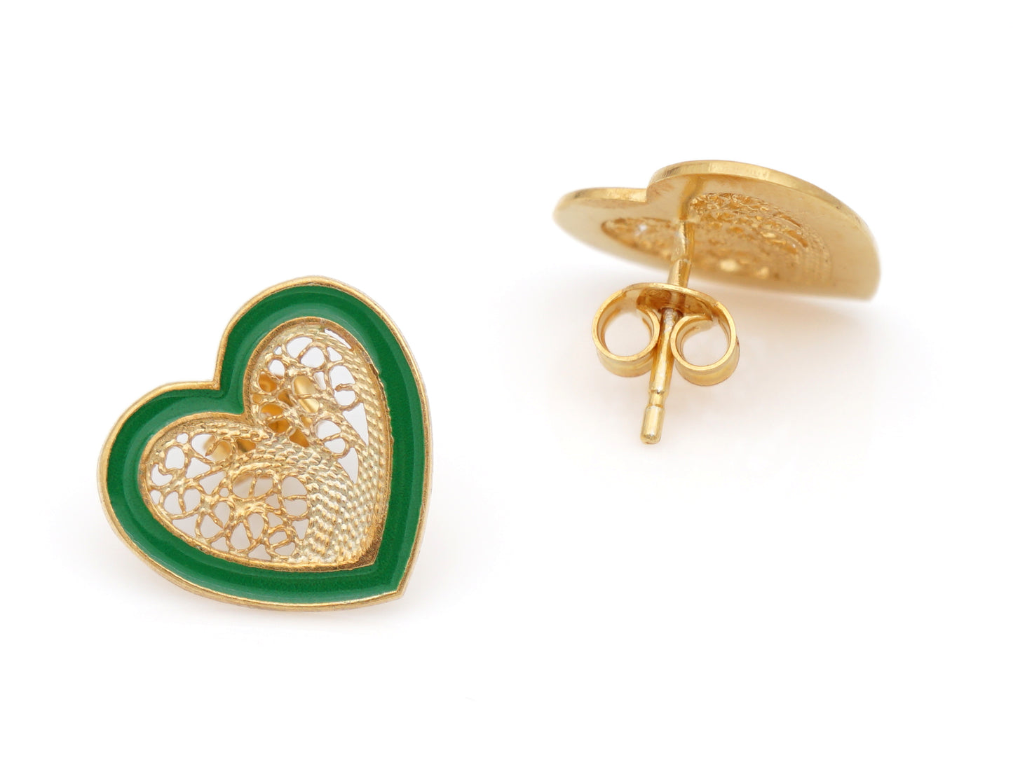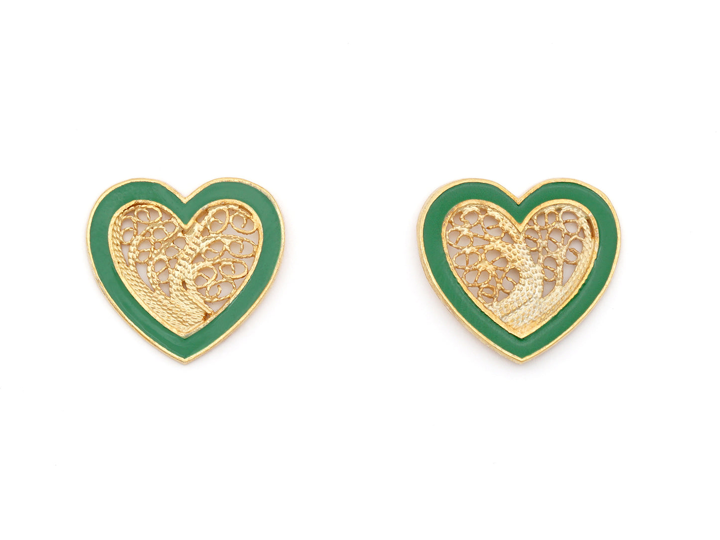 Elegantes Brincos Coração médio com Esmalte Verde, de tornilho. Filigrana Portuguesa, feito em Portugal em Prata de Lei 925, com Banho de Ouro.