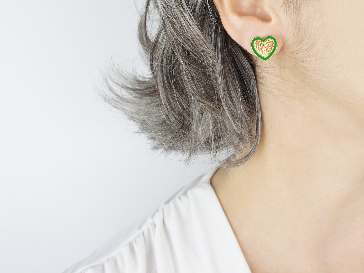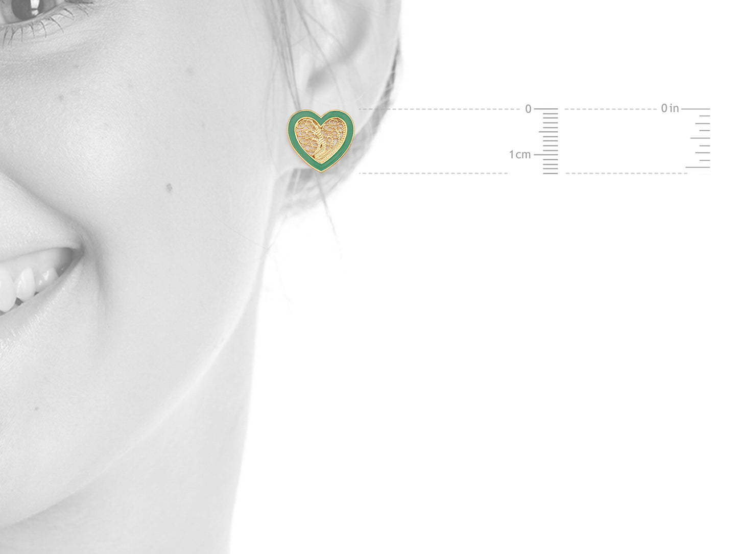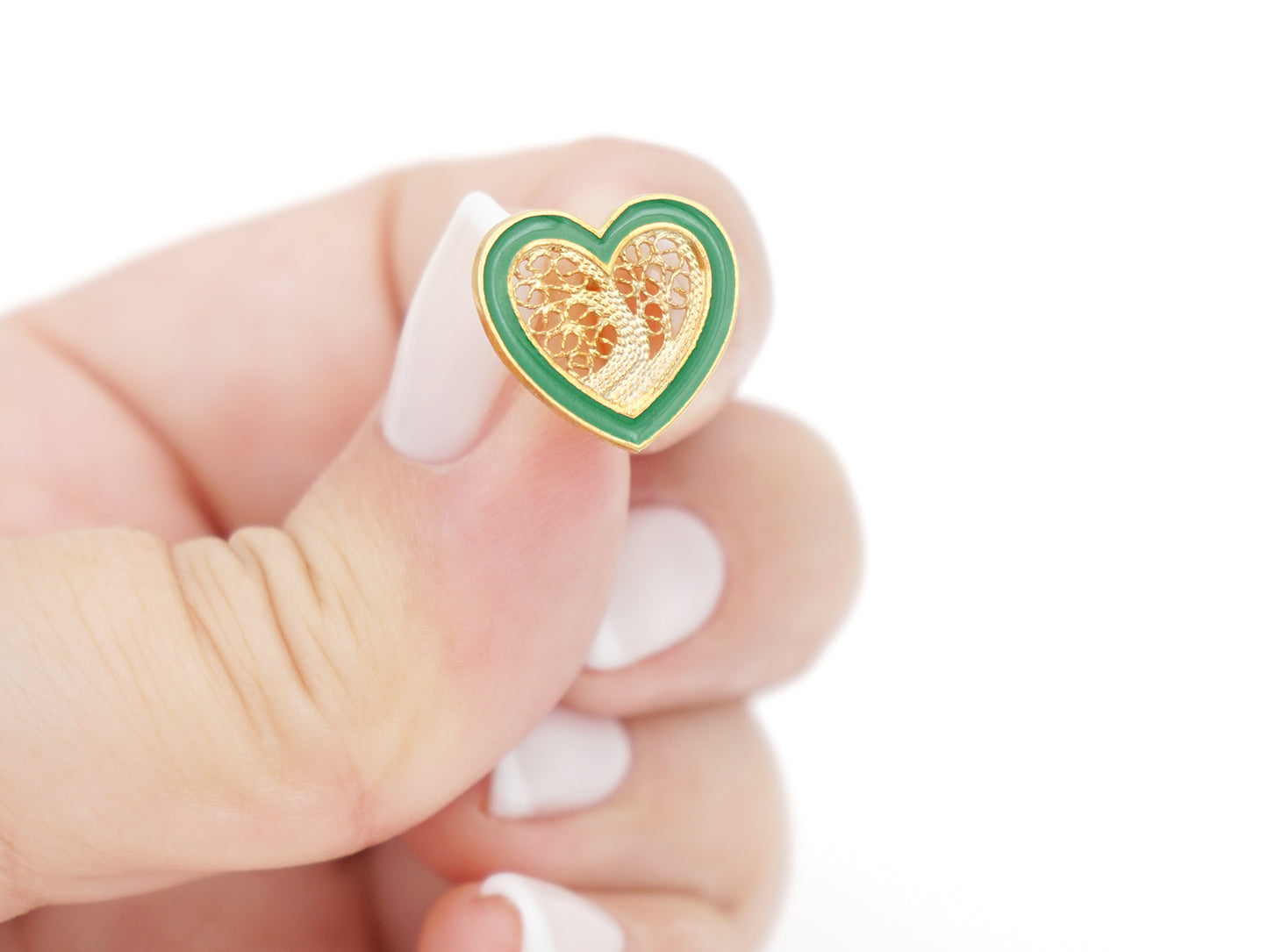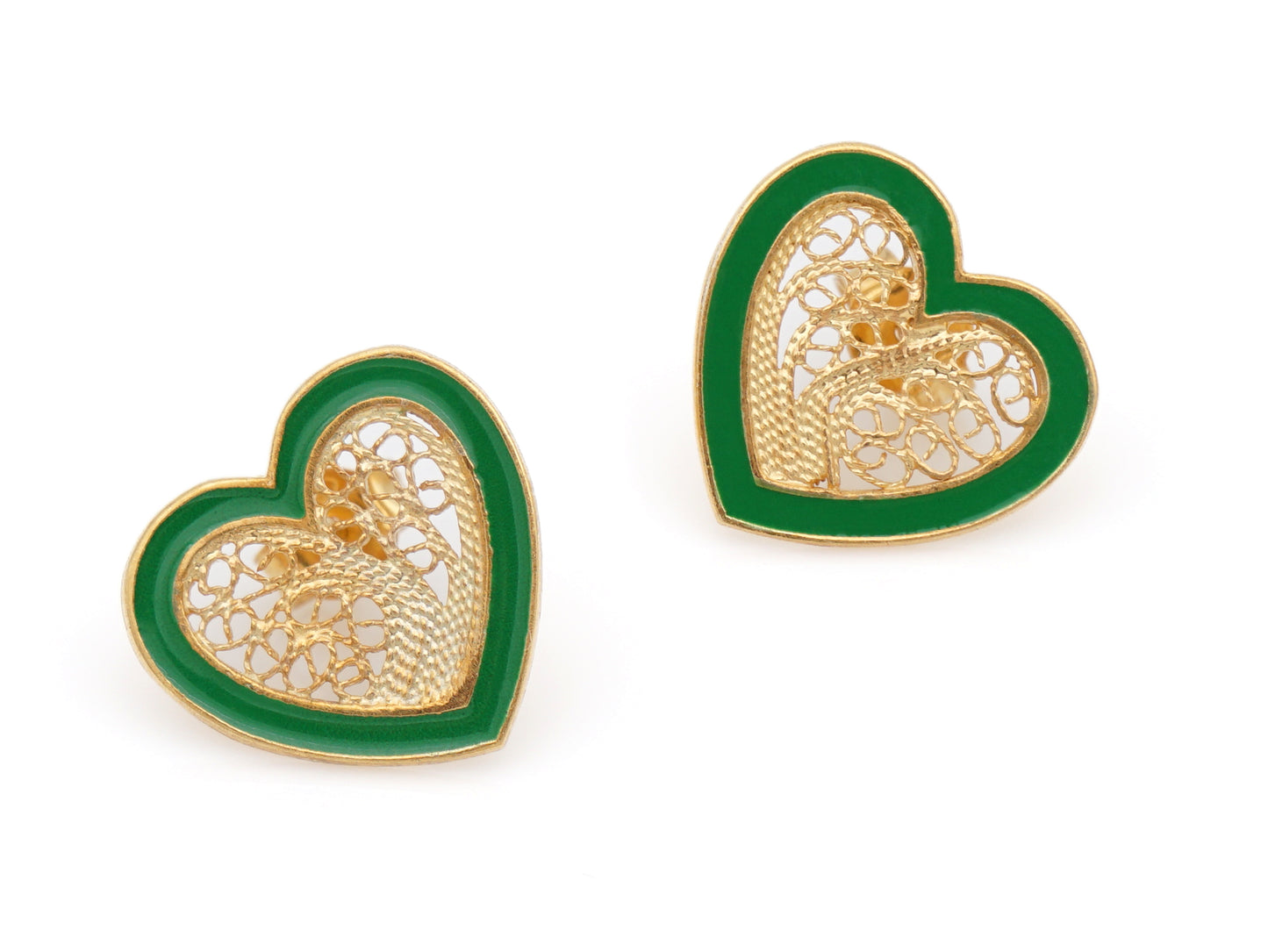 Elegantes Brincos Coração médio com Esmalte Verde, de tornilho. Filigrana Portuguesa, feito em Portugal em Prata de Lei 925, com Banho de Ouro.