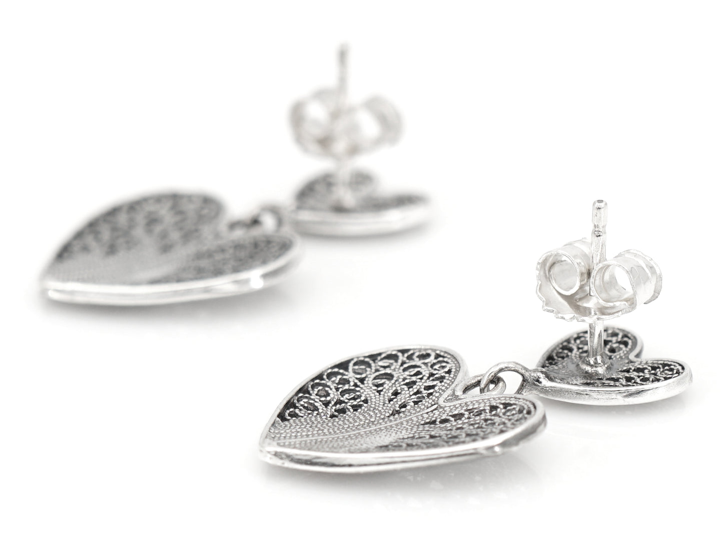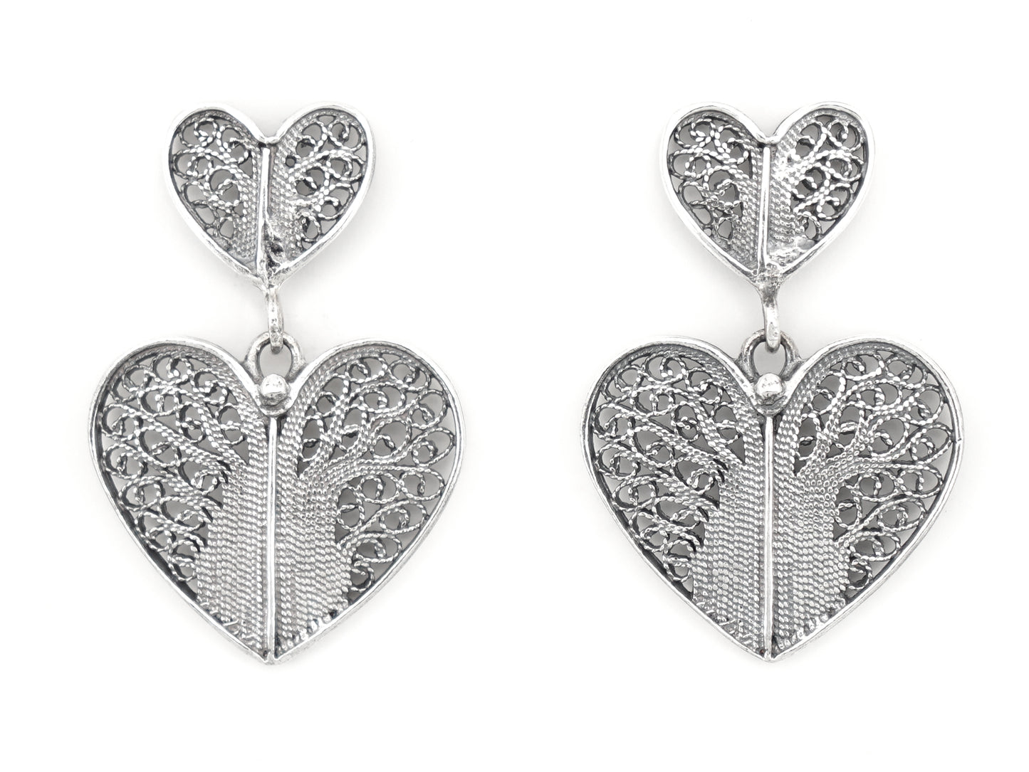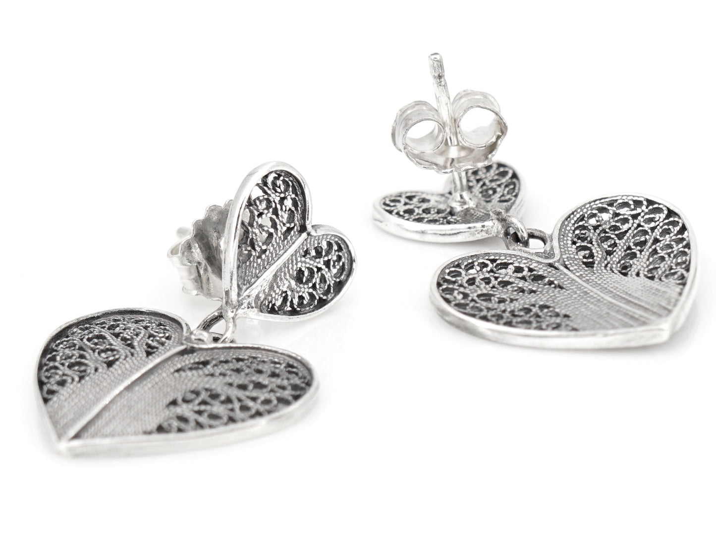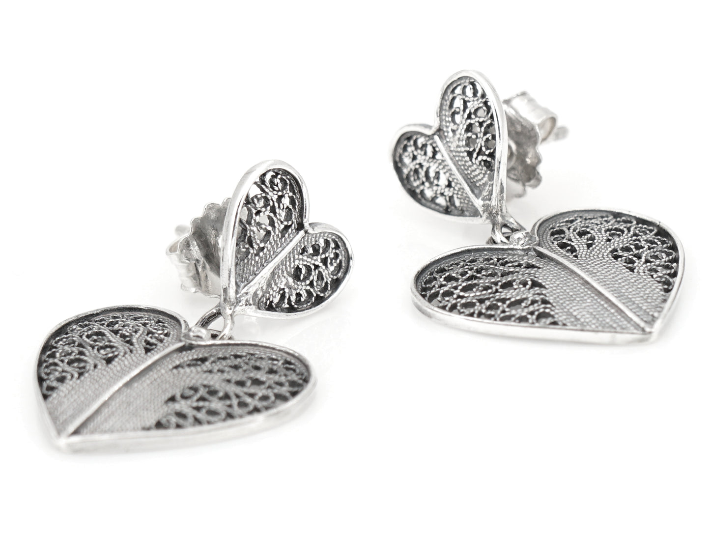 Elegantes Brincos com Dois Corações, de tornilho. Filigrana Portuguesa, feito em Portugal em Prata de Lei 925.