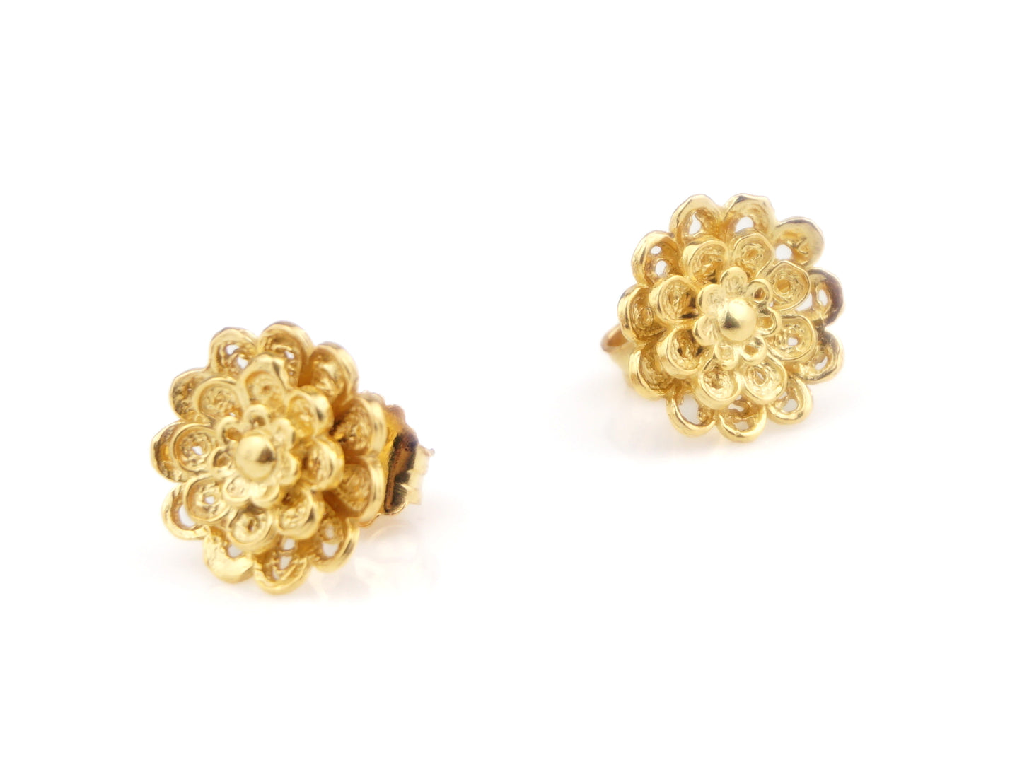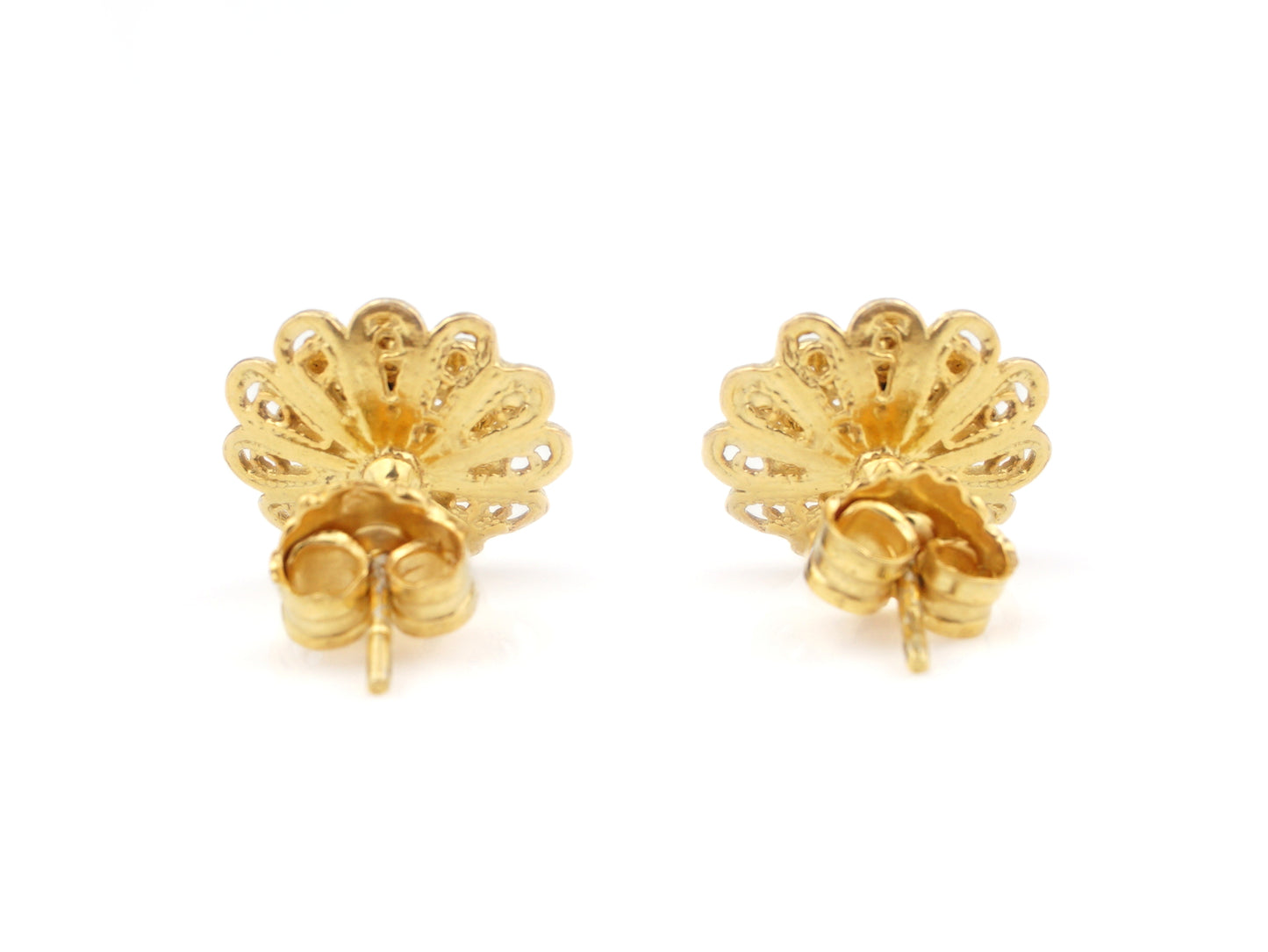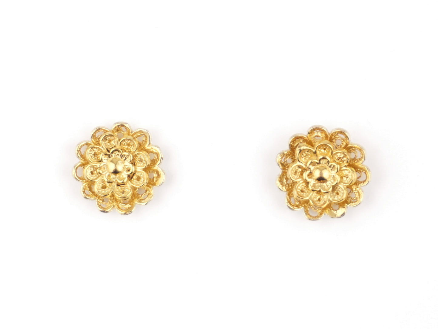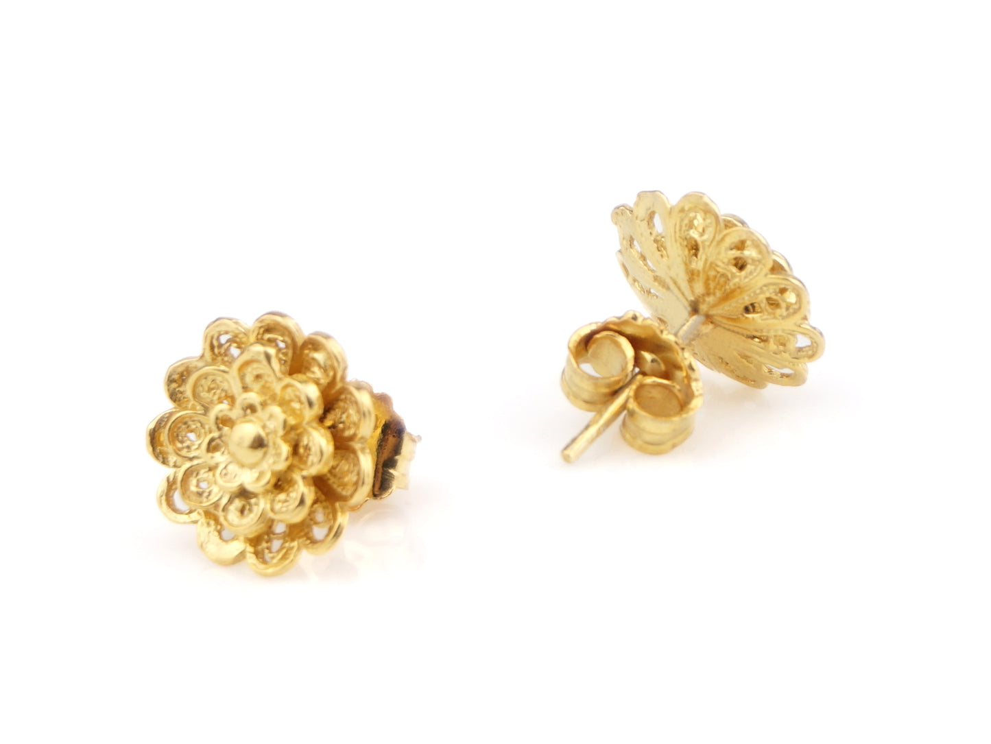 Elegantes Brincos Flor Rica, de tamanho pequeno, de tornilho. Filigrana Portuguesa, feito em Portugal em Prata de Lei 925, com Banho de Ouro.