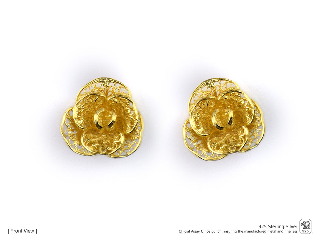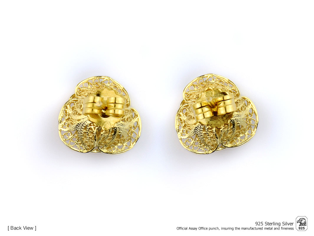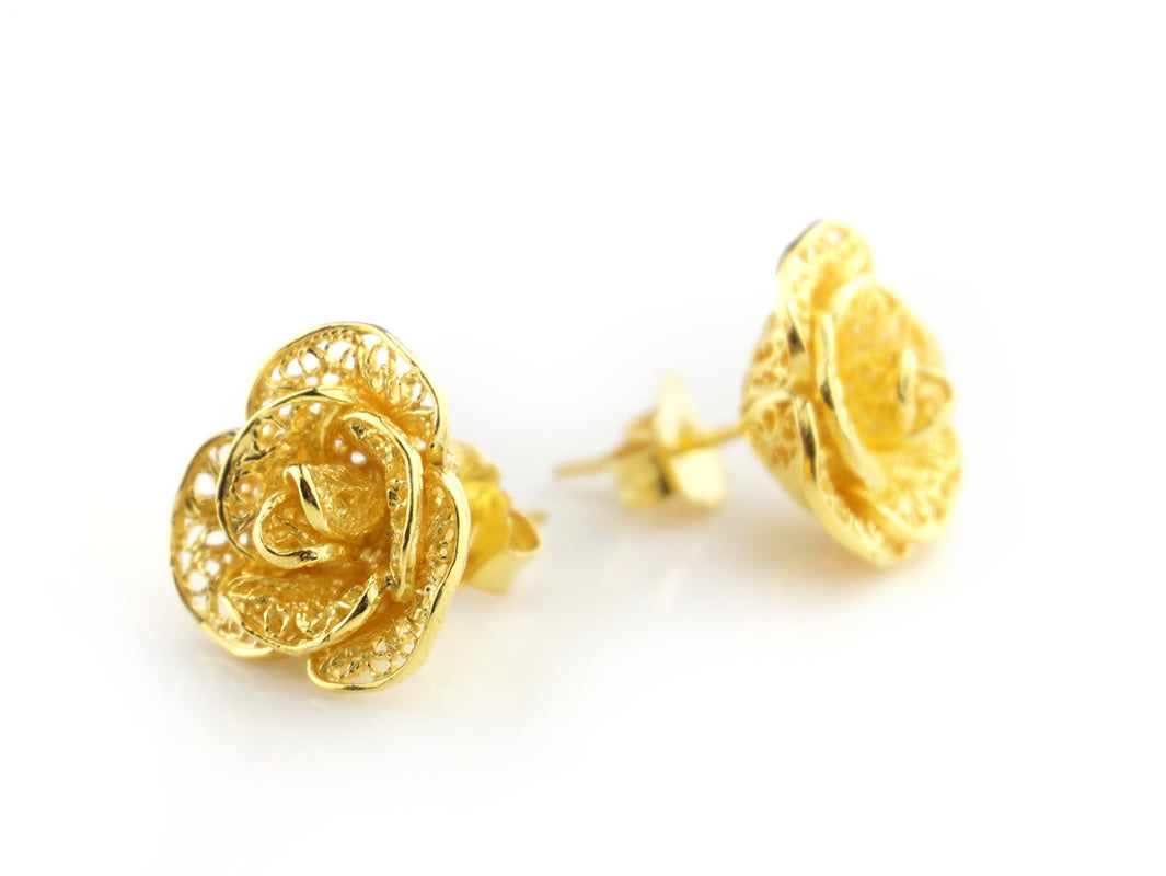 Elegantes Brincos Flores Elaboradas de tamanho médio, de tornilho. Filigrana Portuguesa, feito em Portugal em Prata de Lei 925 com Banho de Ouro.