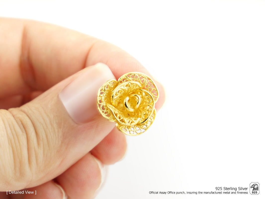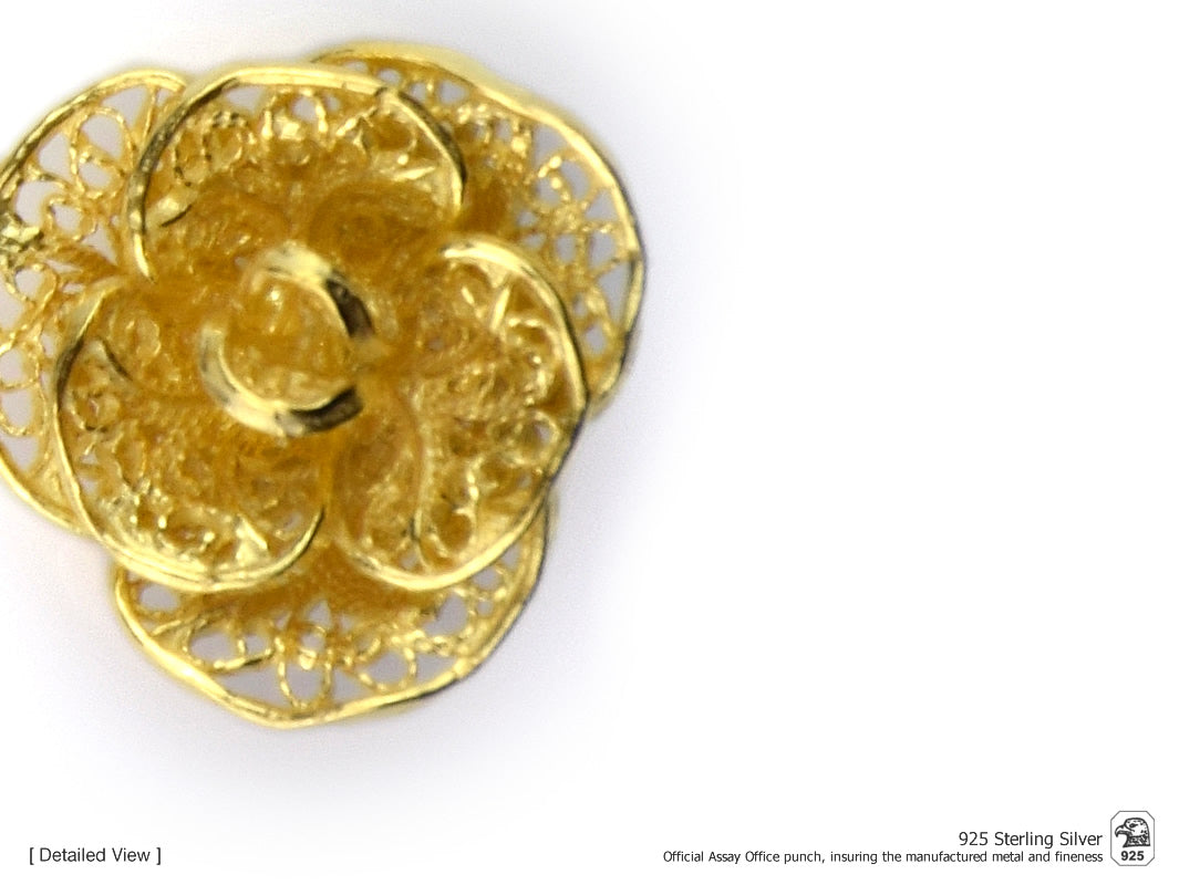 Brincos Flores Elaboradas Médias, Filigrana Portuguesa, Prata de Lei 925 Dourada