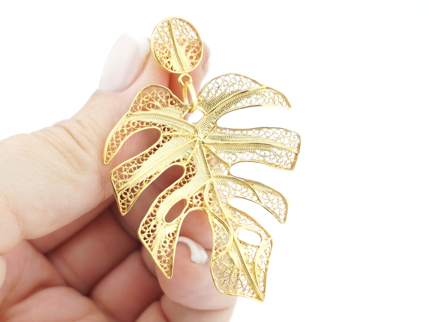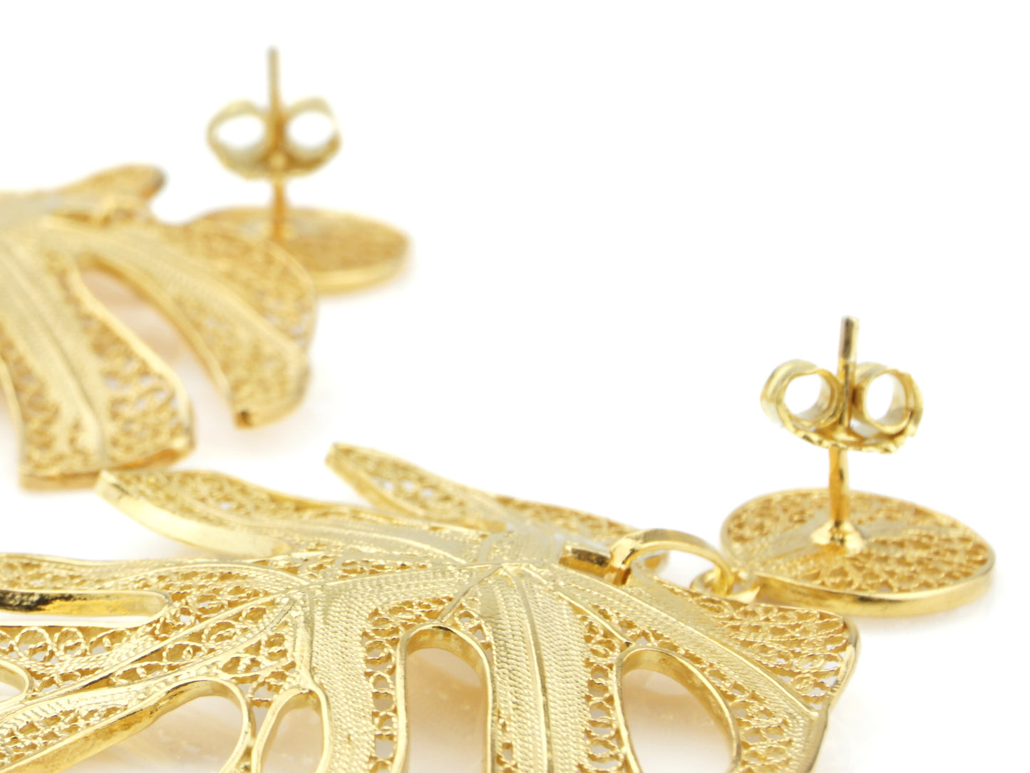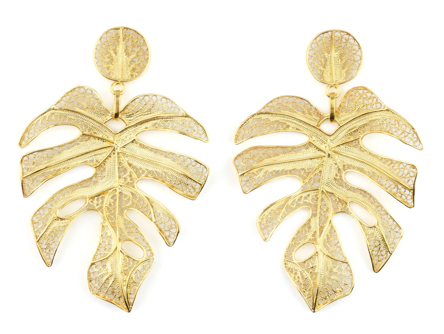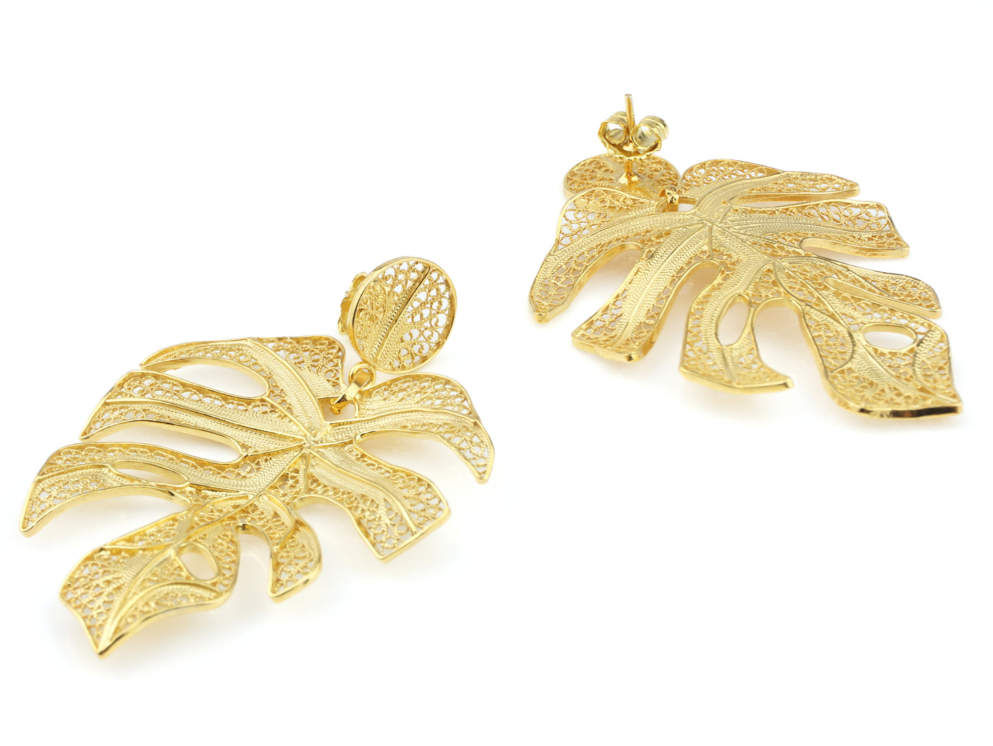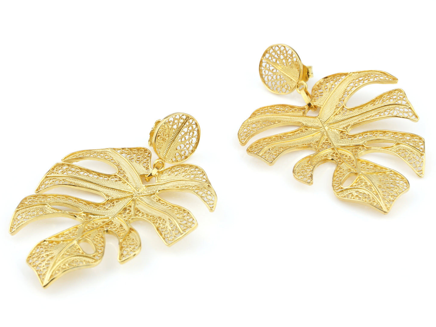 Elegantes Brincos Folha extra grande, de tornilho. Filigrana Portuguesa, feito em Portugal em Prata de Lei 925, com Banho de Ouro.
