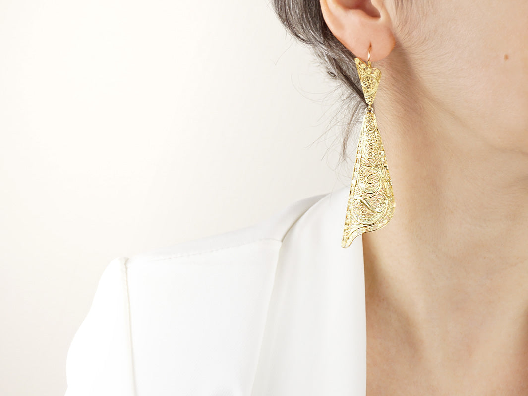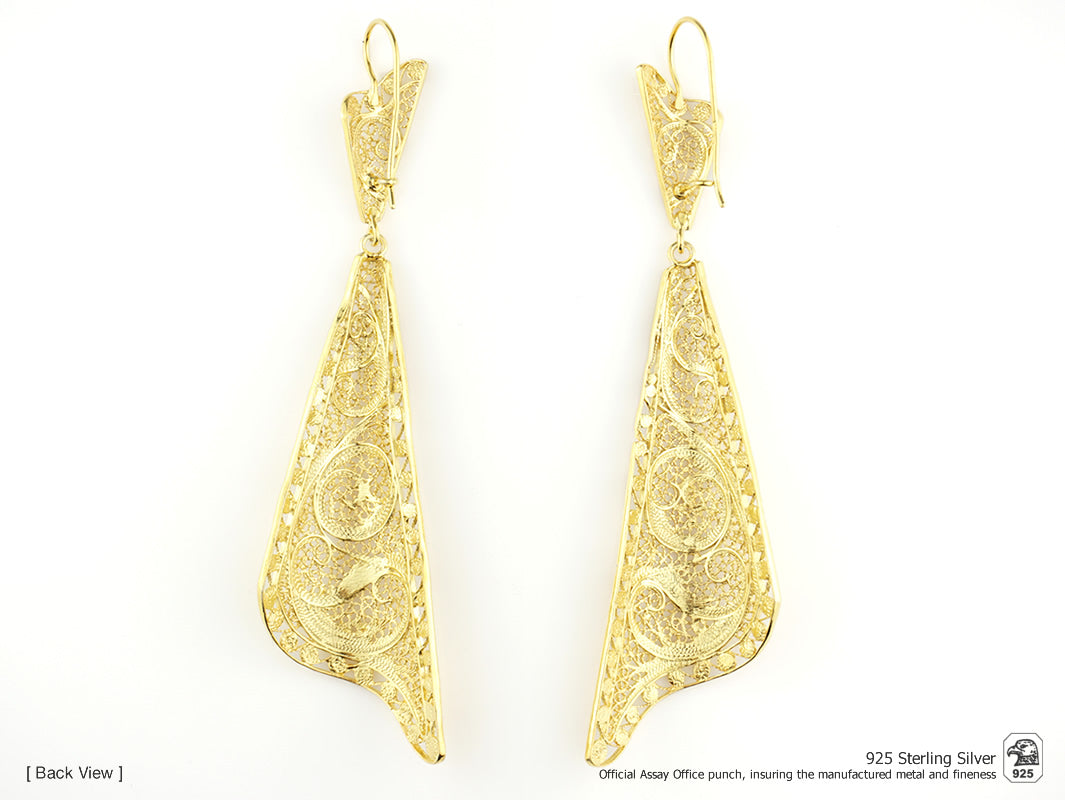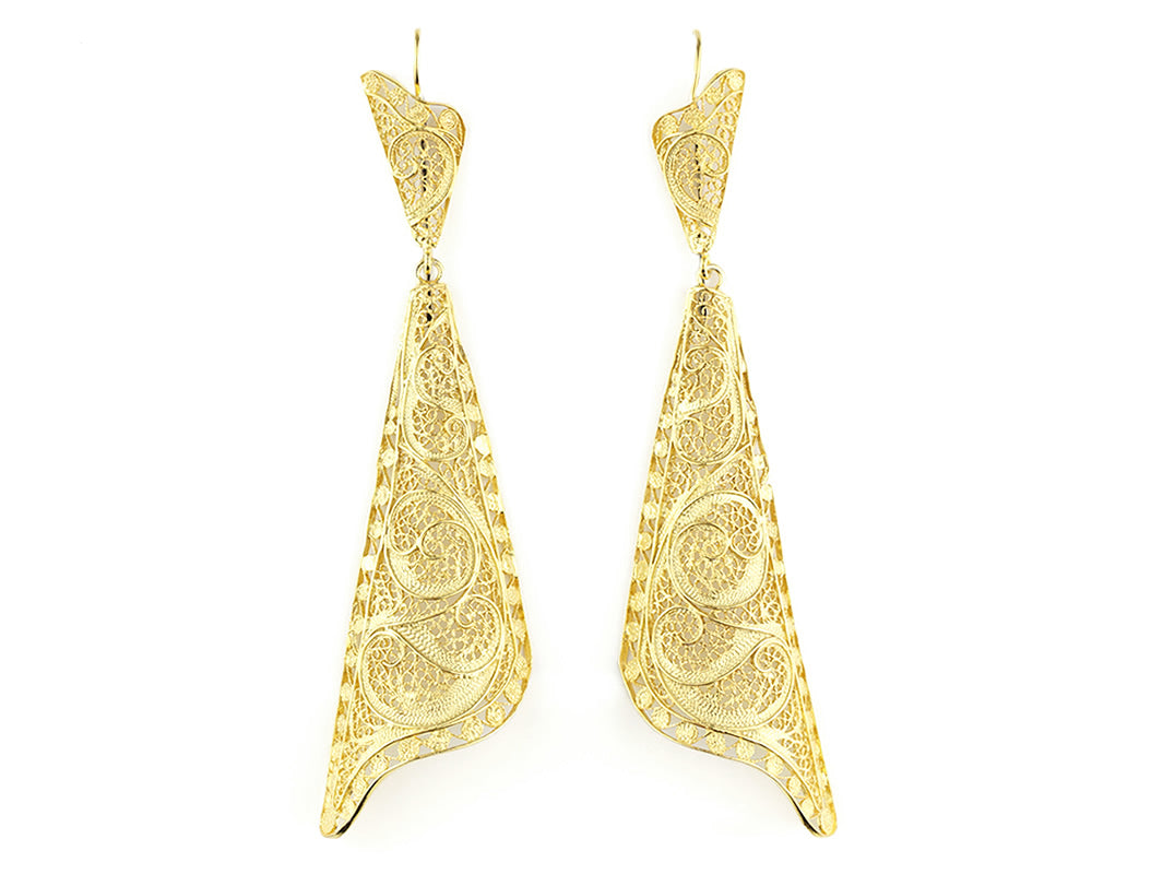 Elegantes Brincos Triângulos curvos, de tamanho grande, de gancho. Filigrana Portuguesa, feito em Portugal em Prata de Lei 925 com Banho de Ouro.