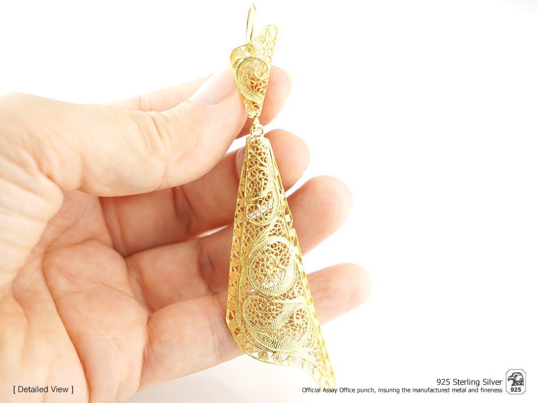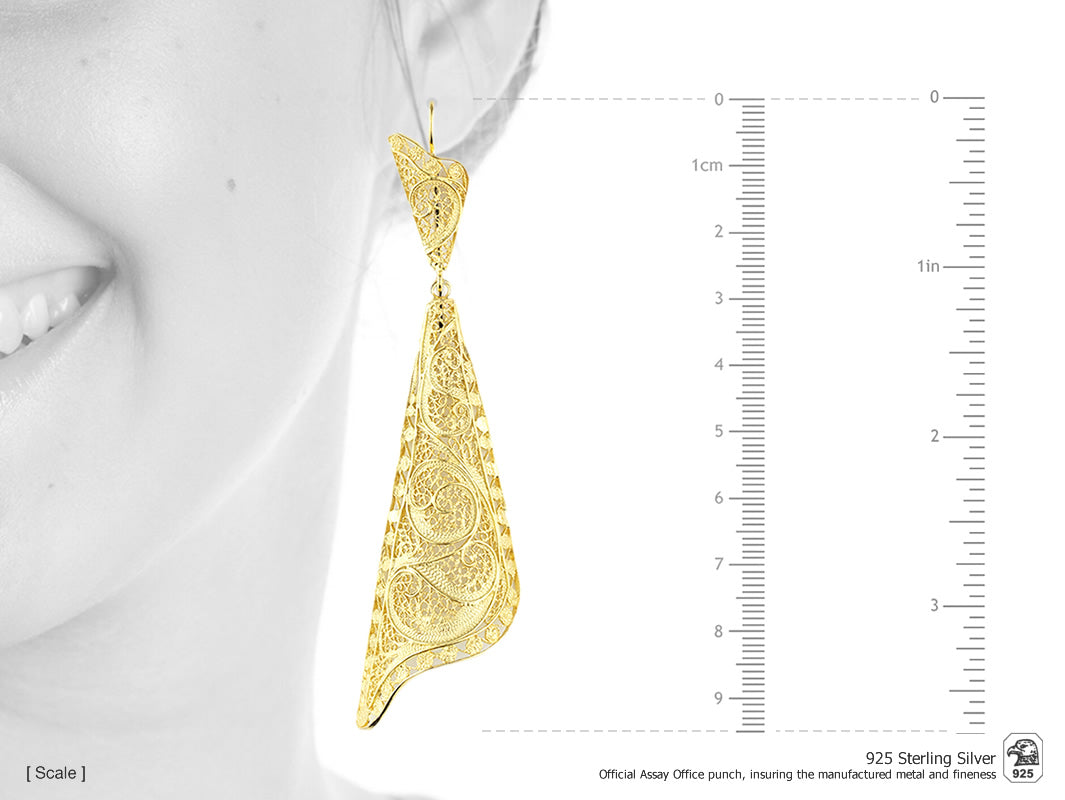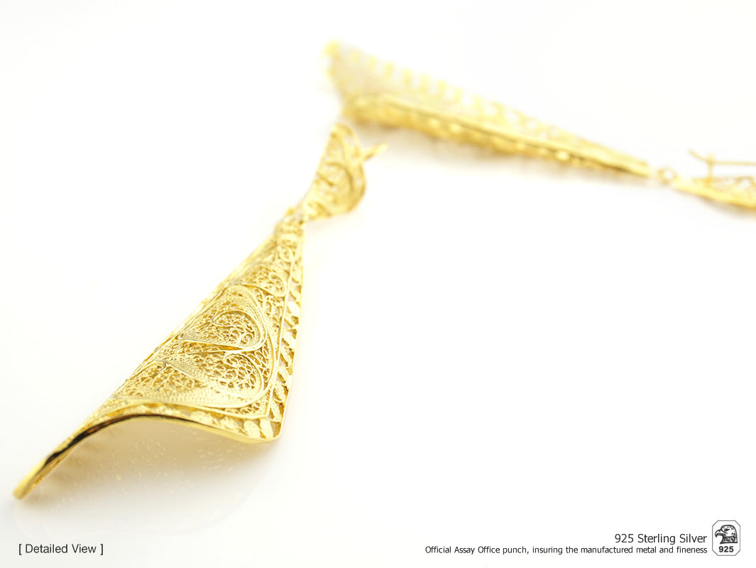 Brincos Triângulos Curvos grandes, Filigrana Portuguesa, Prata de Lei 925 Dourada