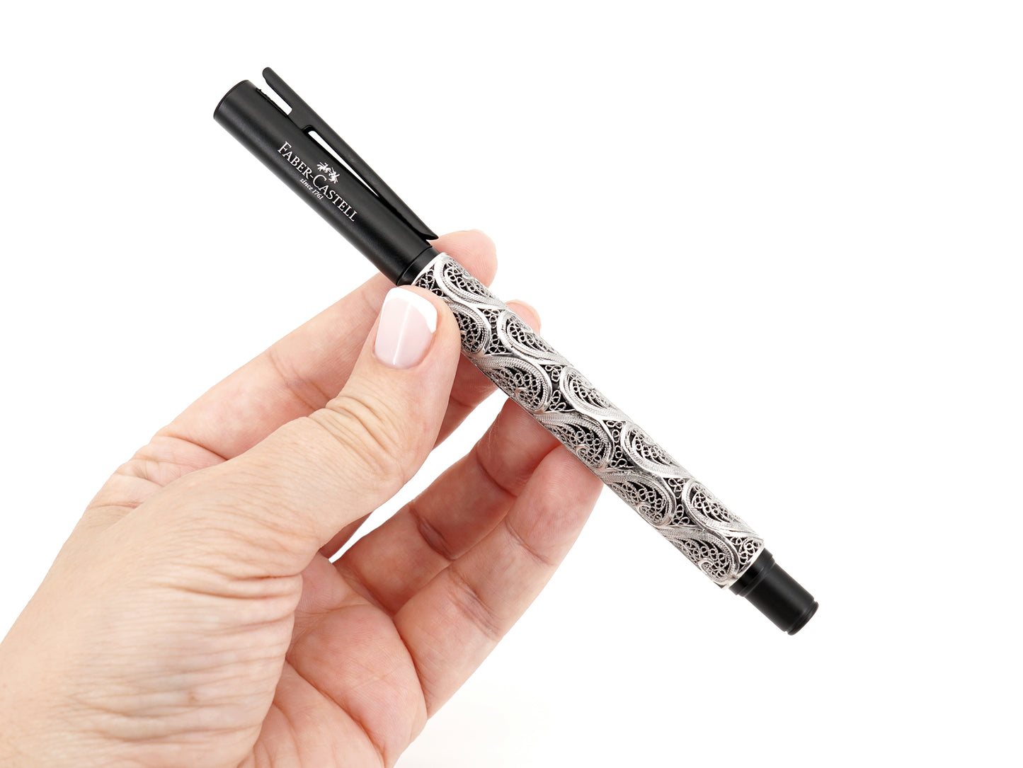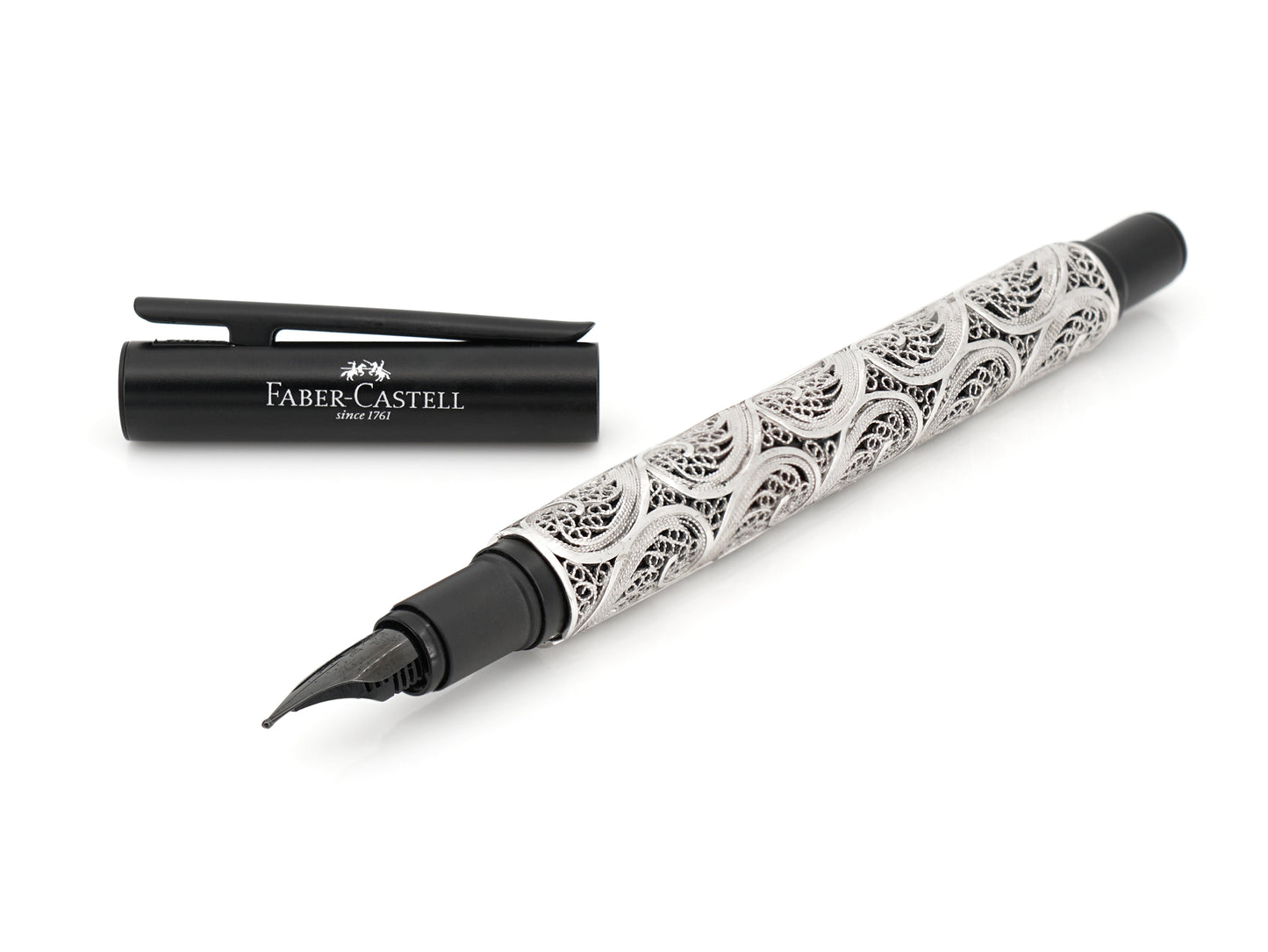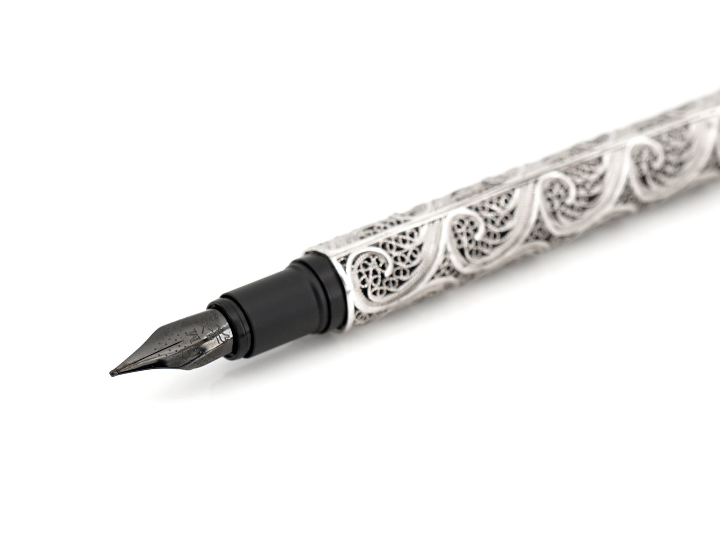 Elegante Caneta de Tinta Permanente Faber-Castell, com aplicação em Filigrana Portuguesa, fabricada em Portugal por talentosos artesãos em Prata de Lei 925 com Banho de Ródio.