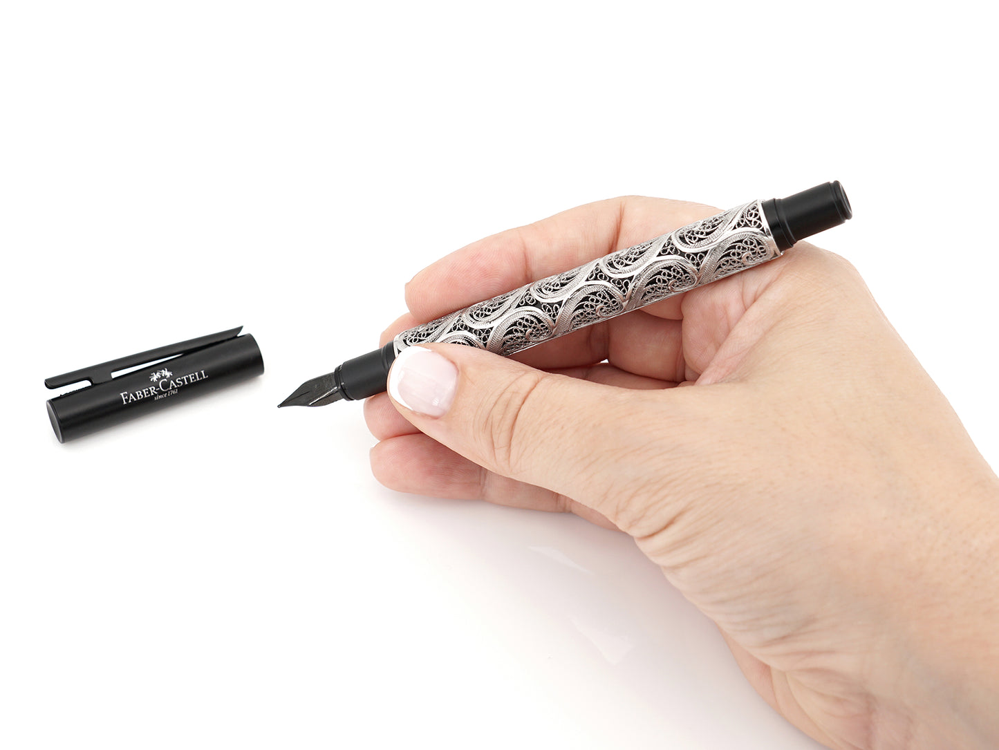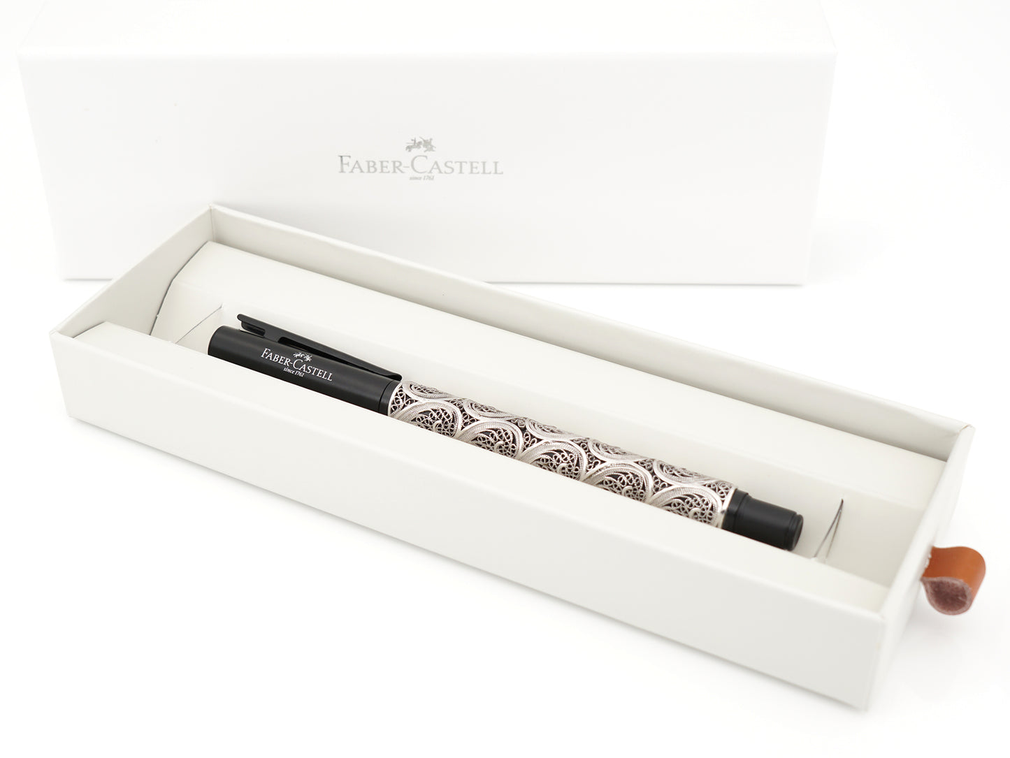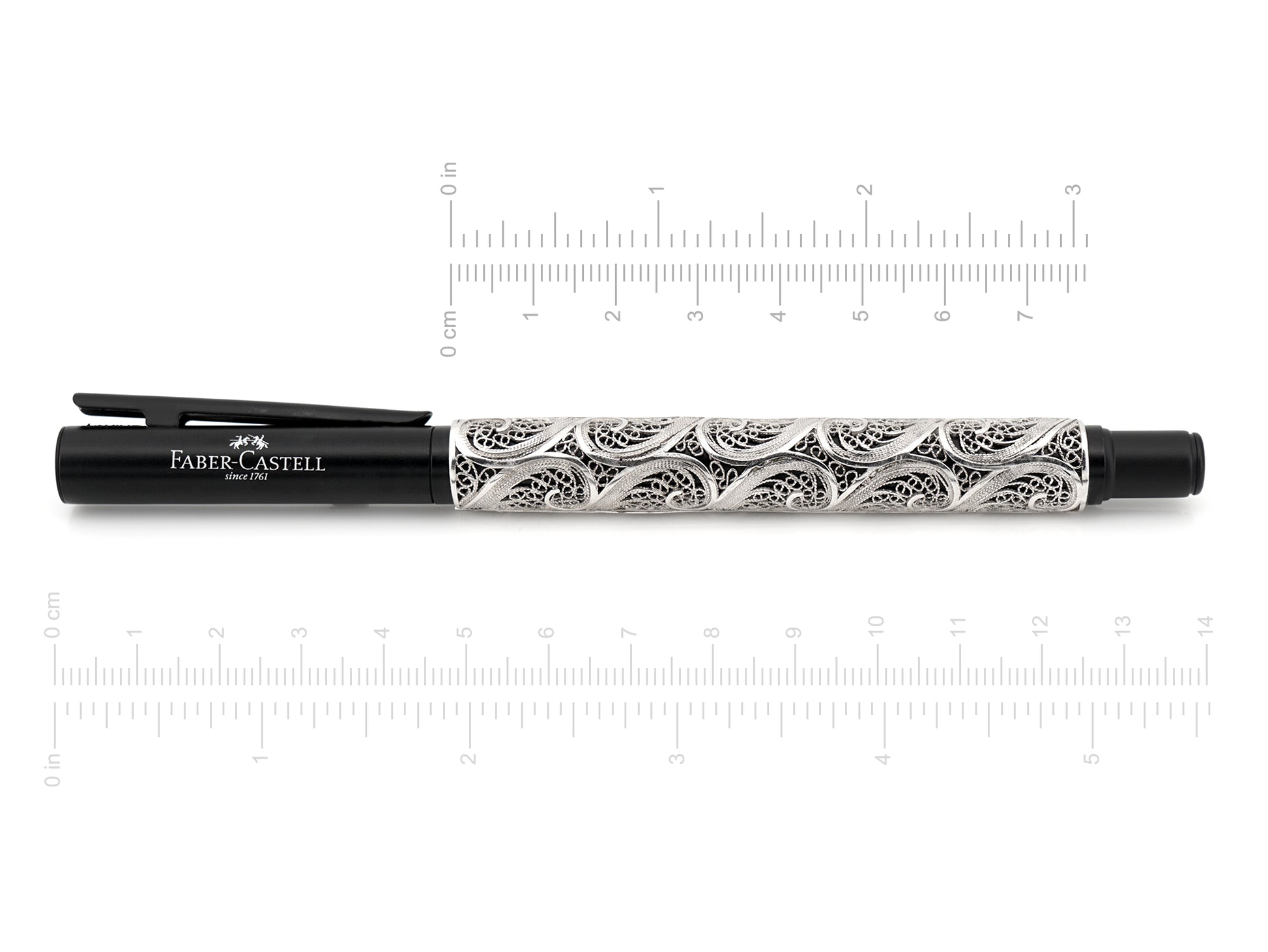 Elegante Caneta de Tinta Permanente Faber-Castell, com aplicação em Filigrana Portuguesa, fabricada em Portugal por talentosos artesãos em Prata de Lei 925 com Banho de Ródio.