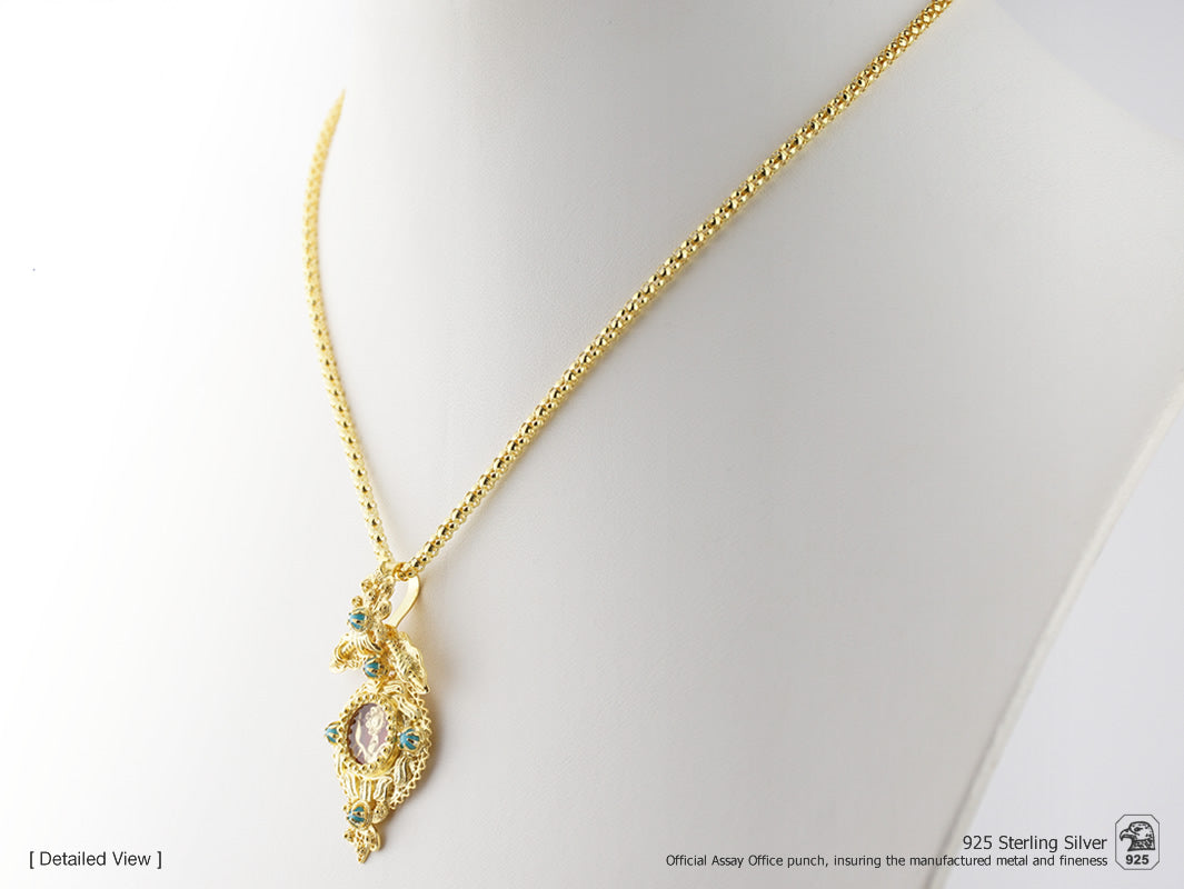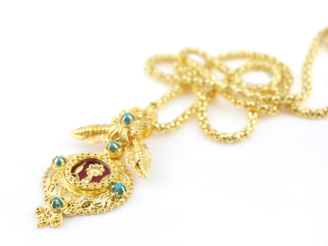 Elegante cordão granitos de comprimento médio com Medalha Relicário / Custódia, de tamanho pequeno, com Turquesas Sintéticas. Filigrana Portuguesa, feito em Portugal em Prata de Lei 925, com Banho de Ouro.