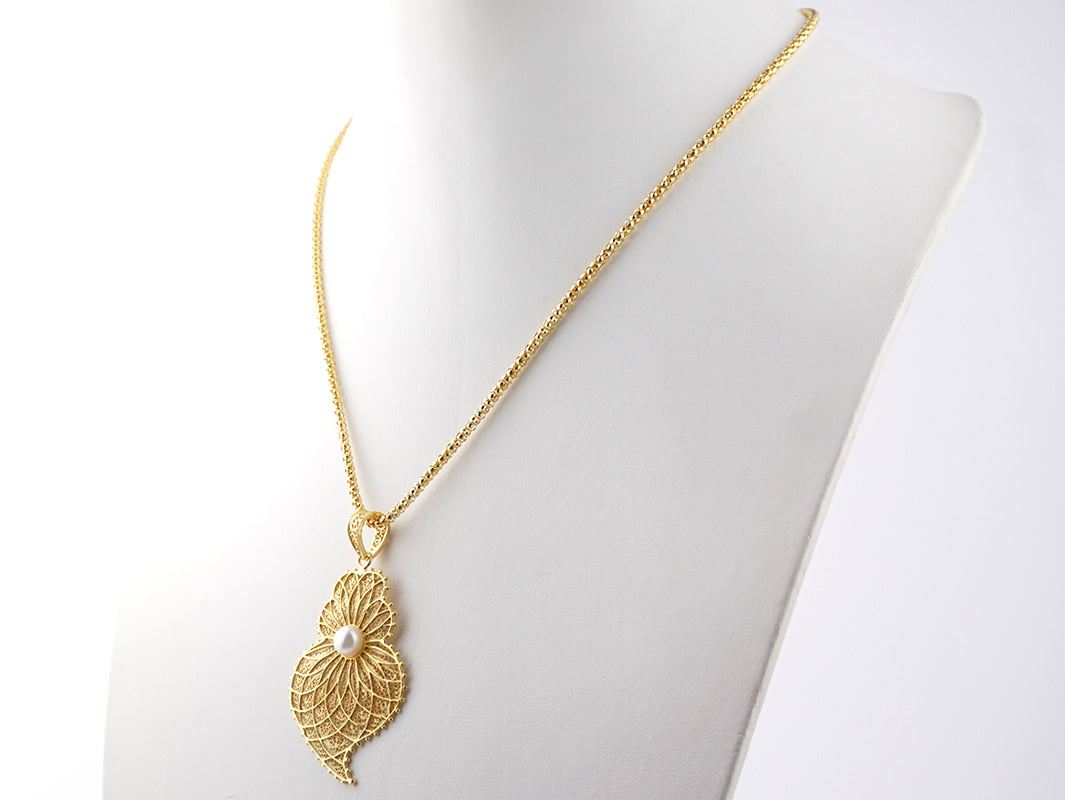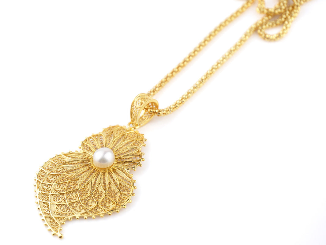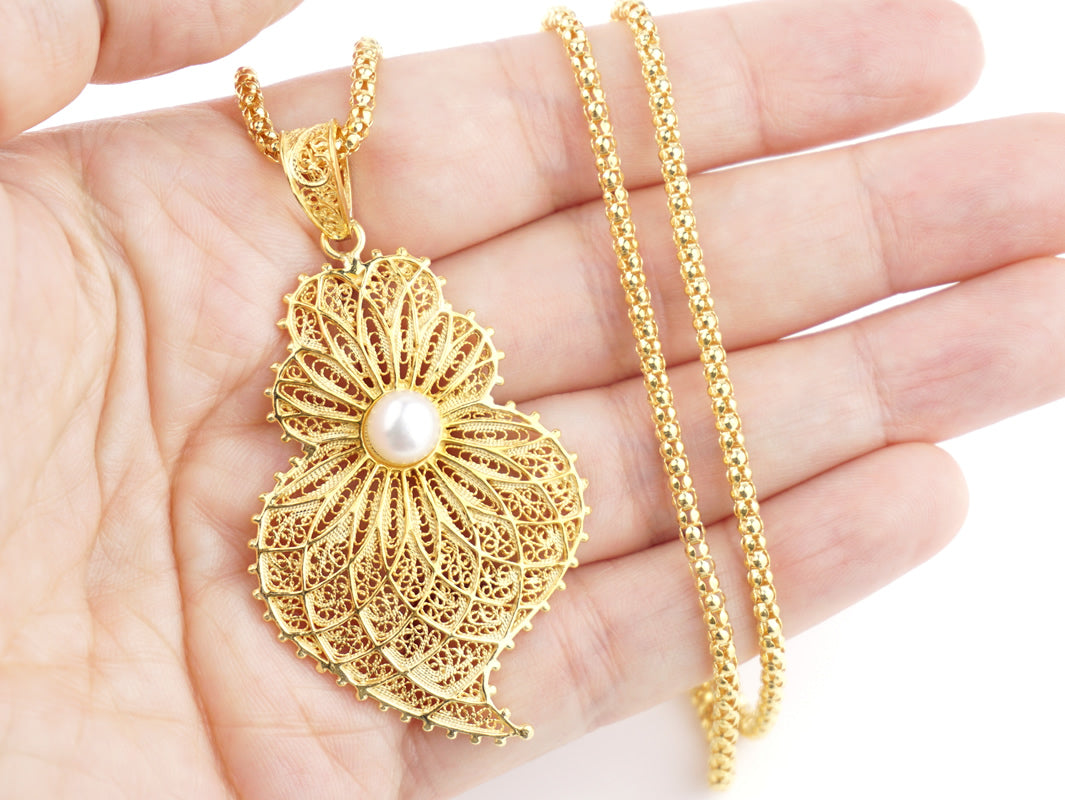 Colar Coração com Pérola, Filigrana Portuguesa, Prata de Lei 925 Dourada