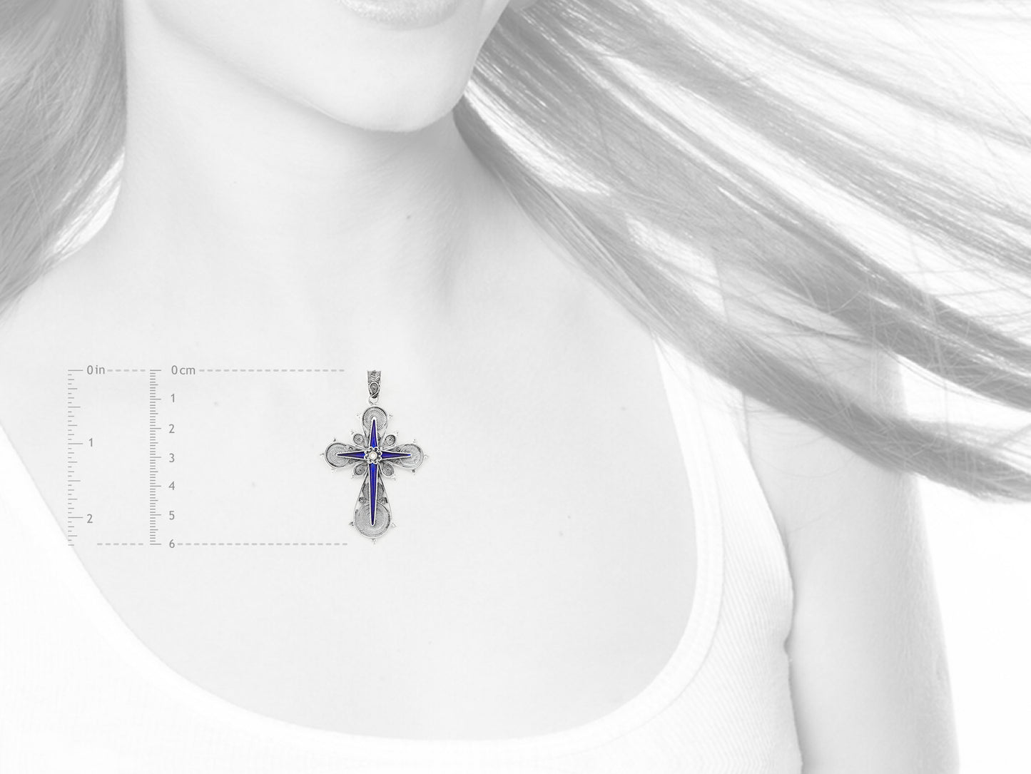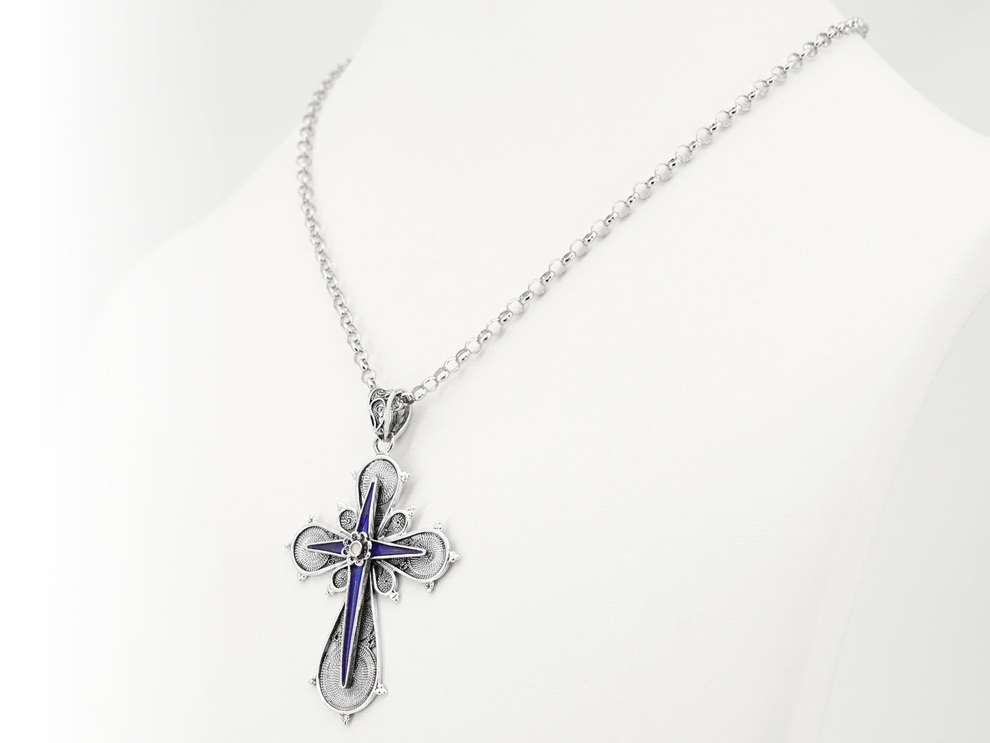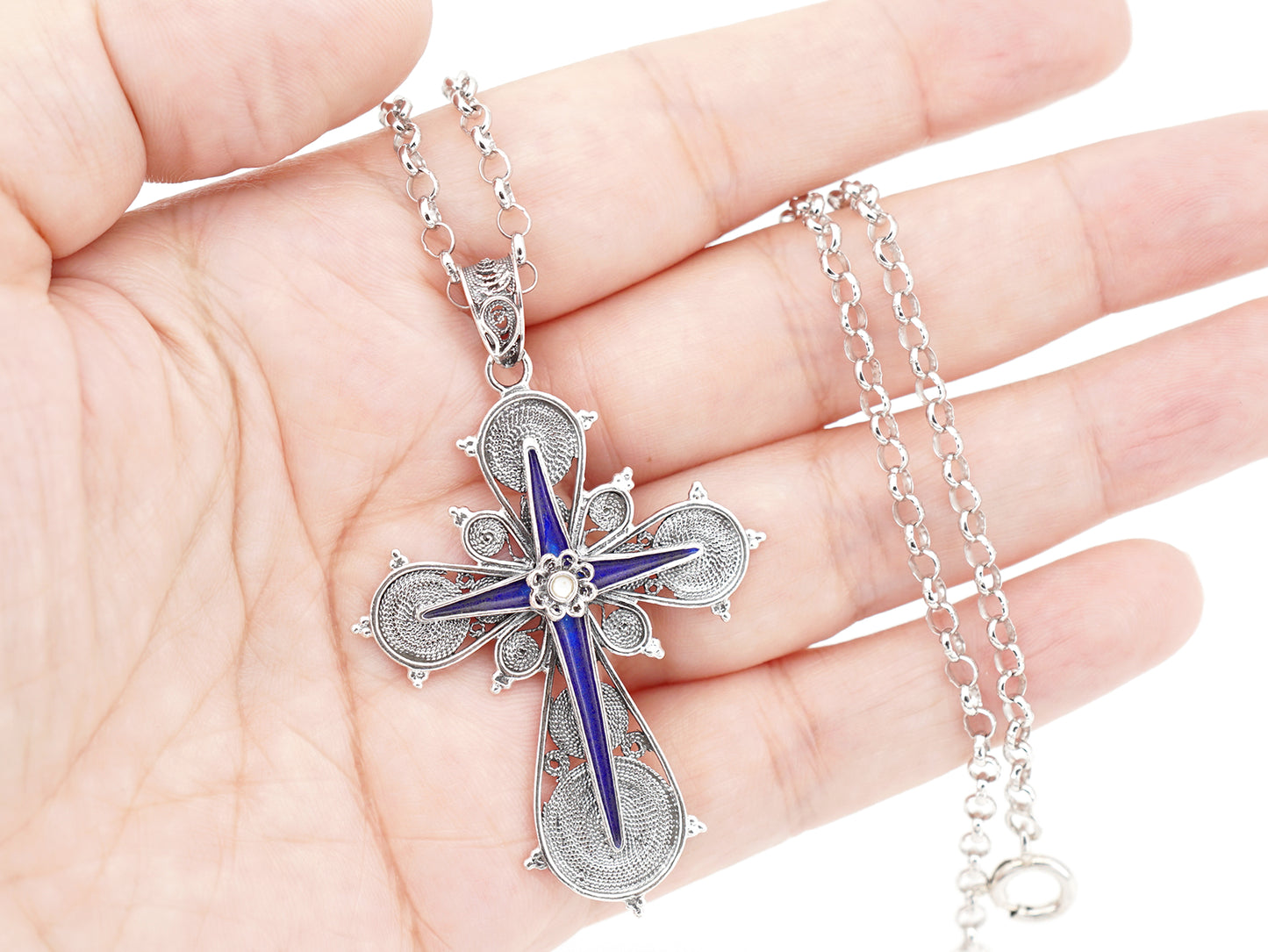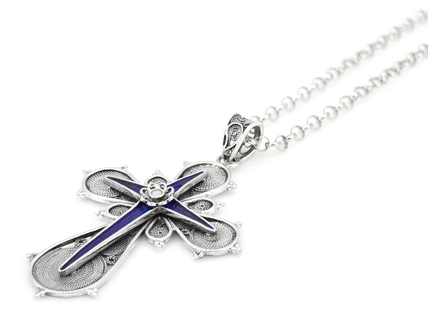 Elegante Colar de comprimento médio com Medalha Cruz com Esmalte azul e branco. Filigrana Portuguesa, feito em Portugal em Prata de Lei 925.