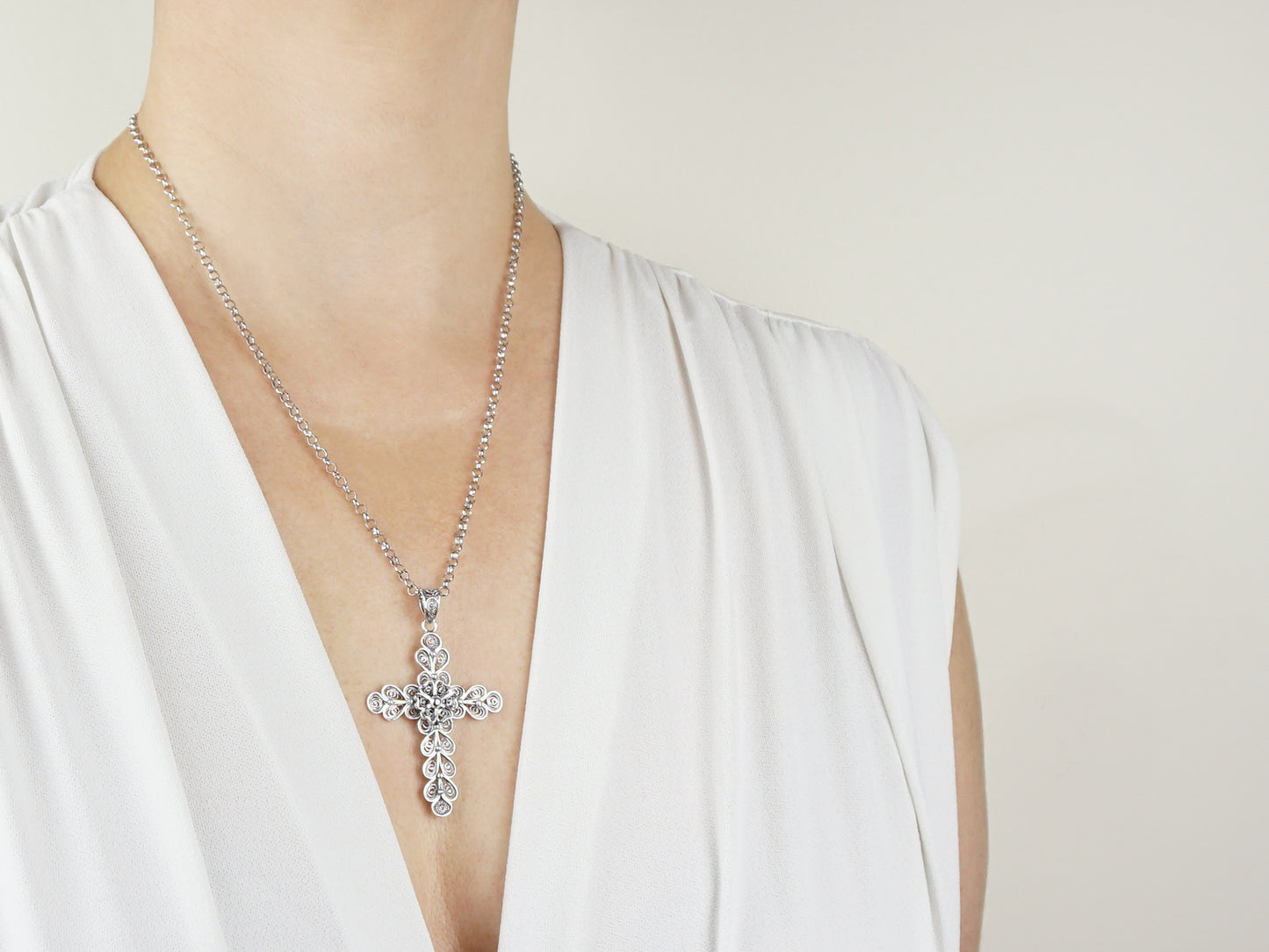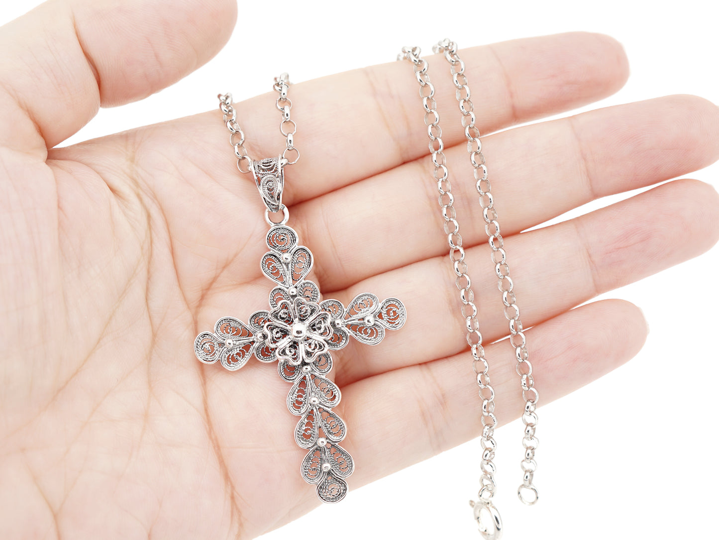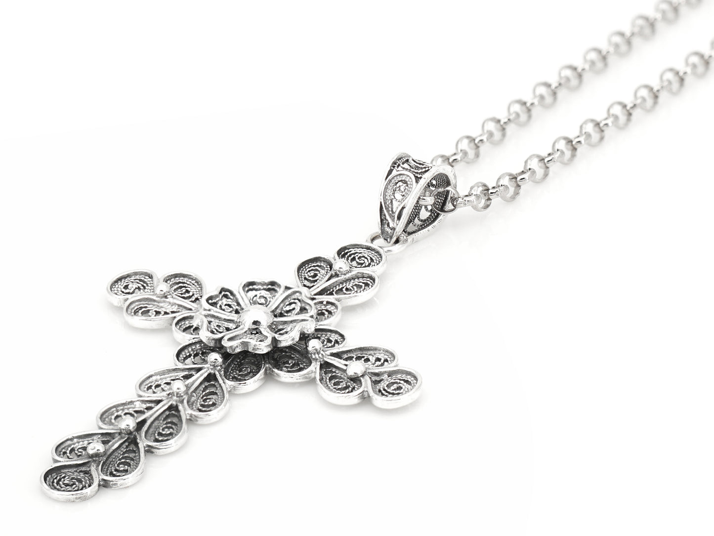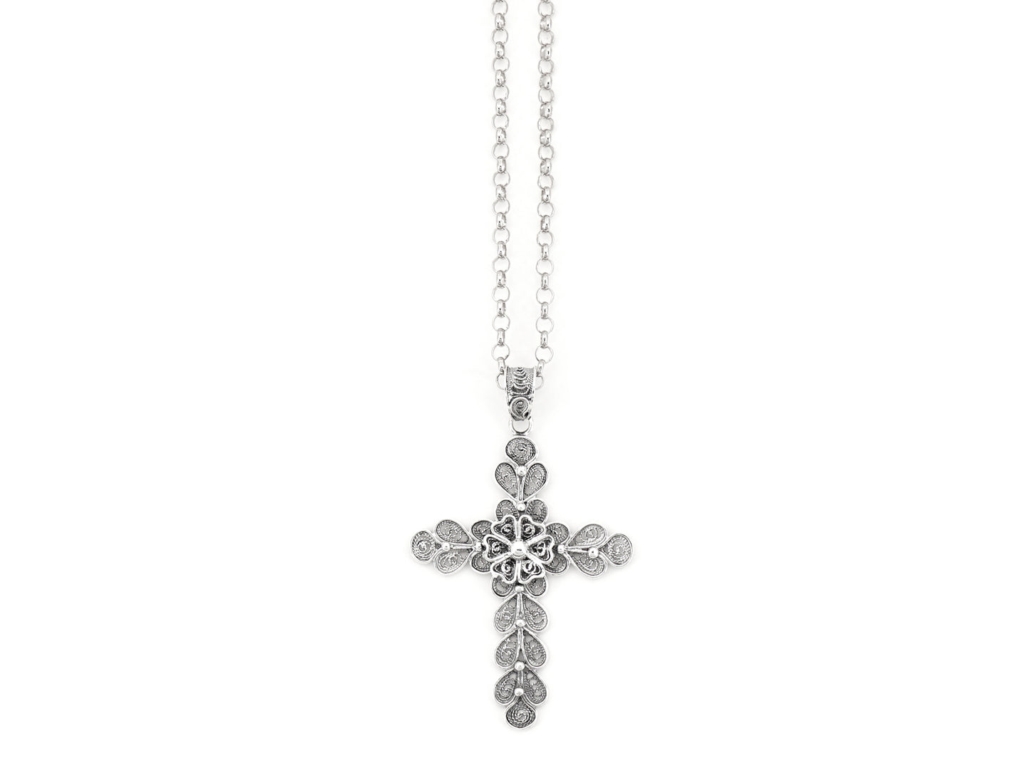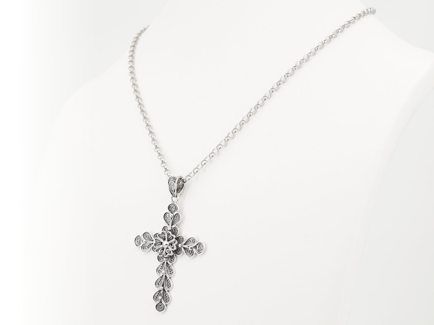 Colar Cruz Frondosa, Filigrana Portuguesa, Prata de Lei 925