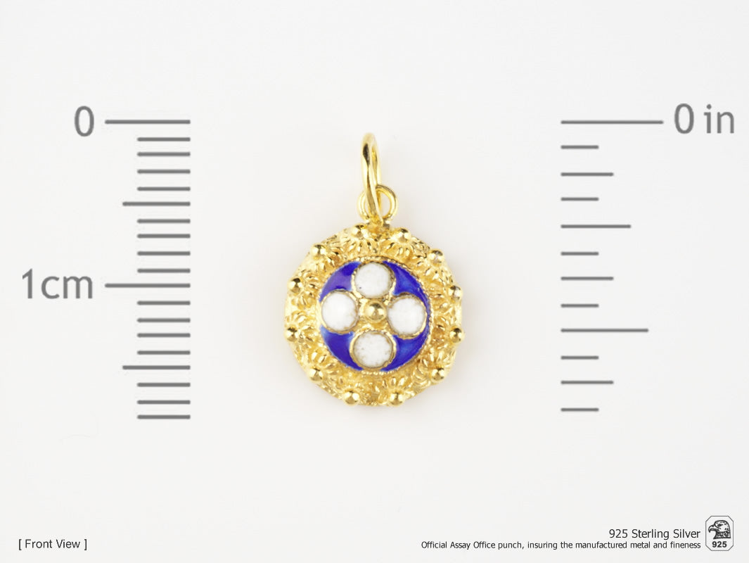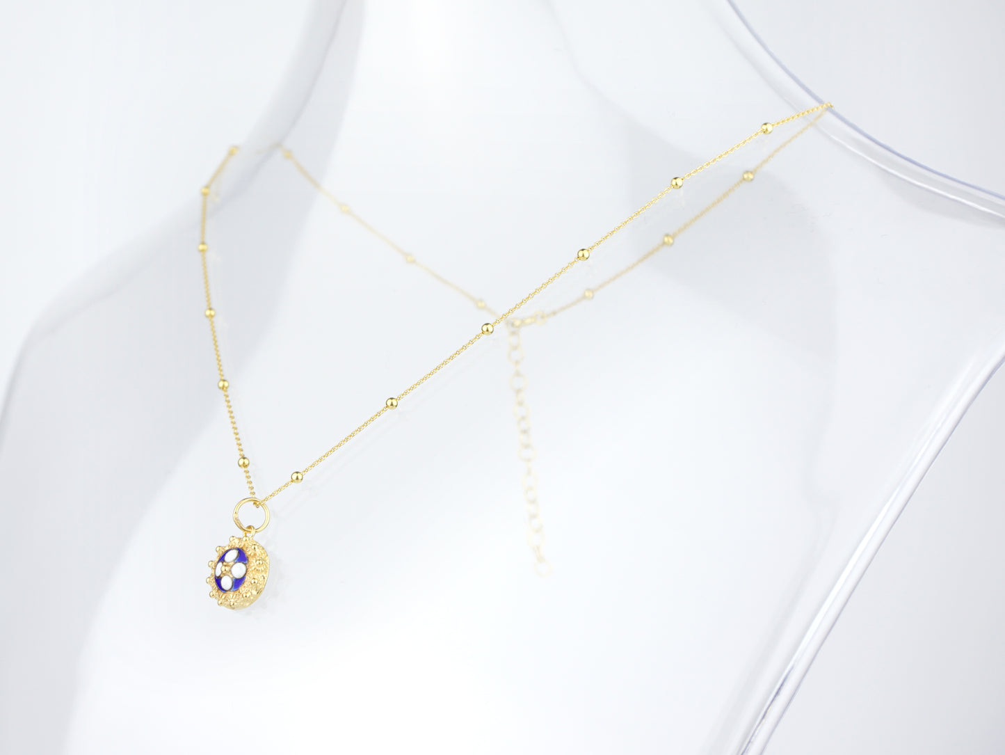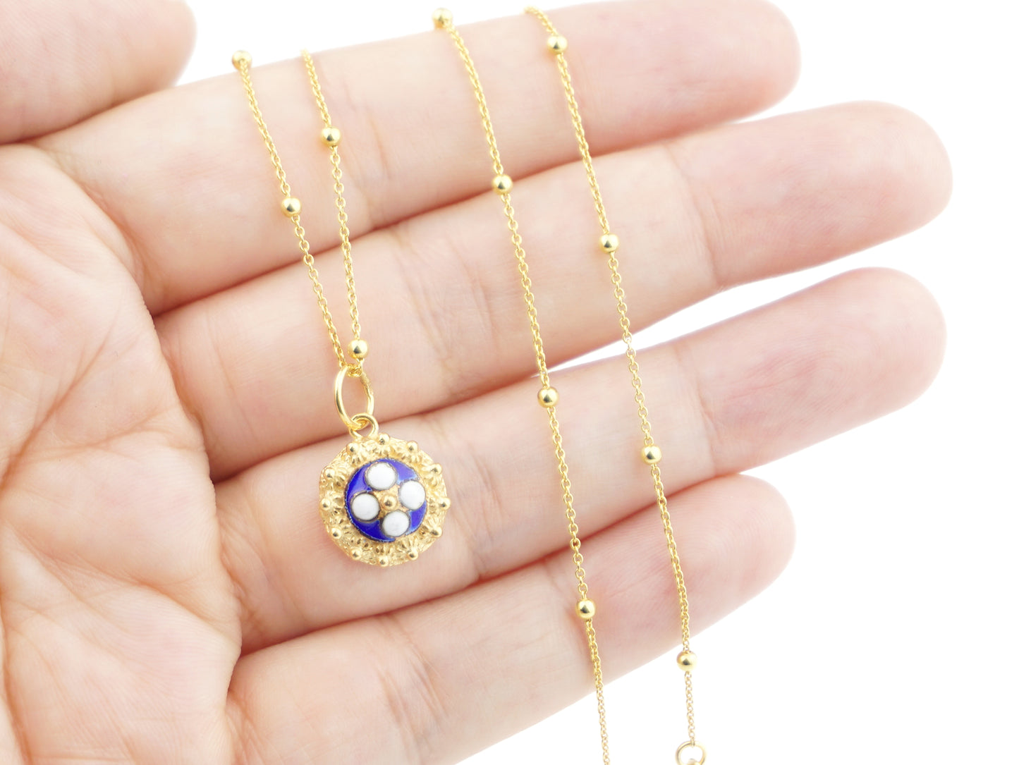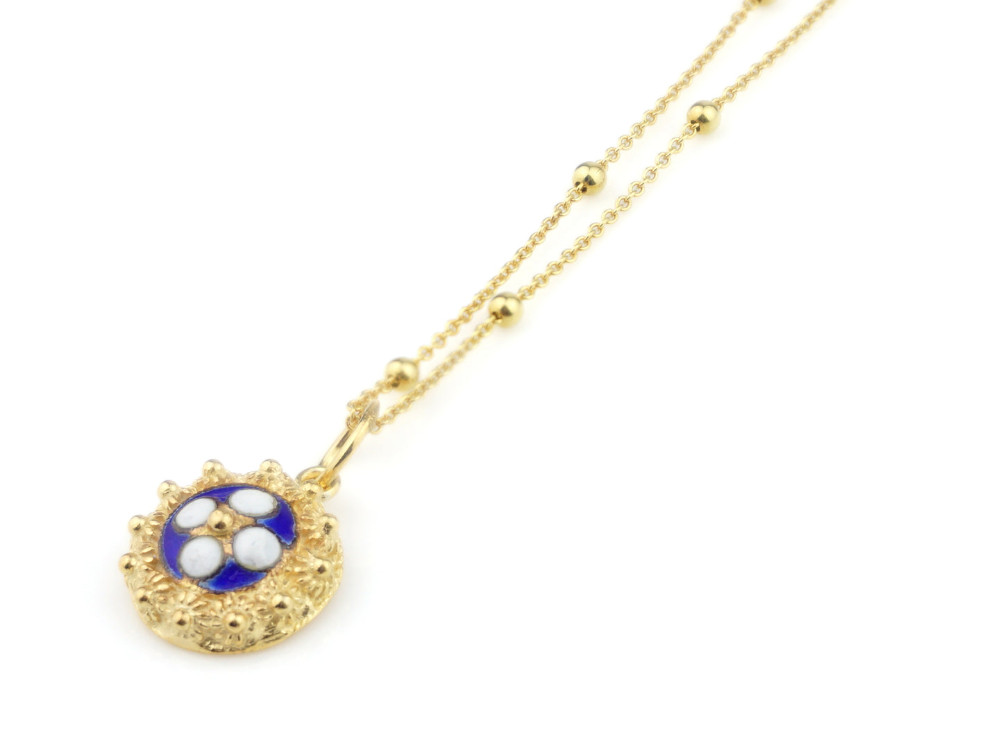 Elegante Colar Esferas ajustável, com Medalha Caramujo Clássico Esmalte Azul. Filigrana Portuguesa, feito em Portugal em Prata de Lei 925, com Banho de Ouro.