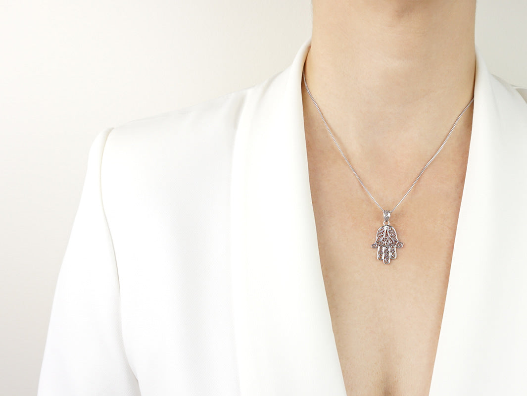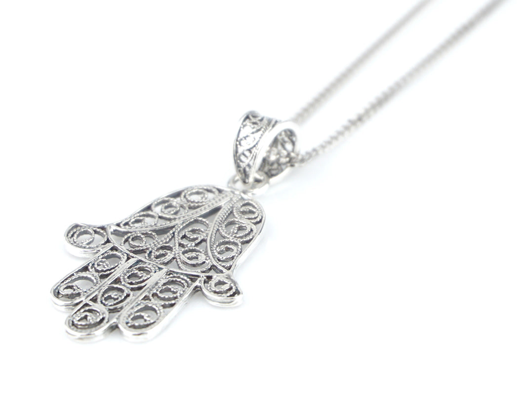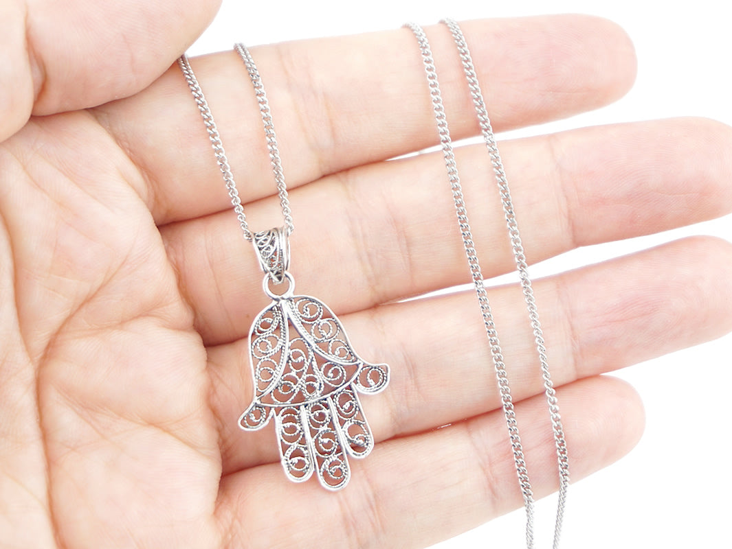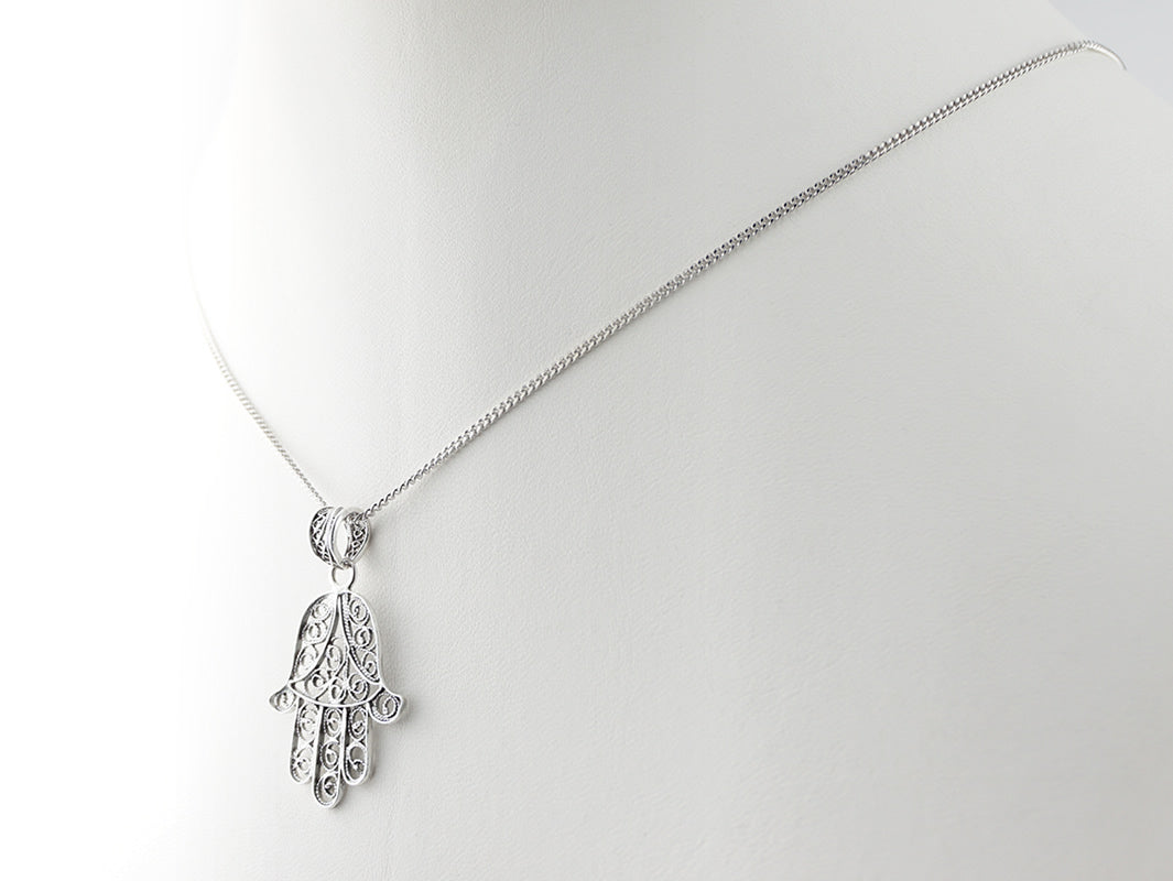 Colar Mão de Fátima Média, Filigrana Portuguesa, Prata de Lei 925