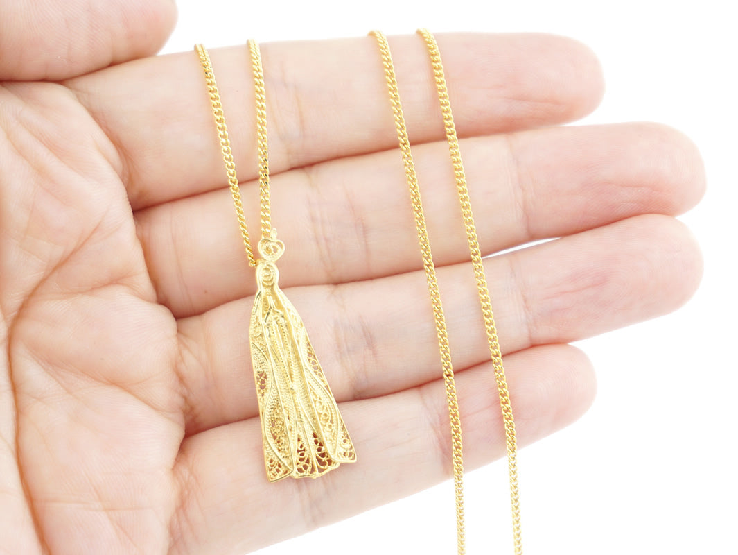 Colar Nossa Senhora de Fátima, Filigrana Portuguesa, Prata de Lei 925 Dourada