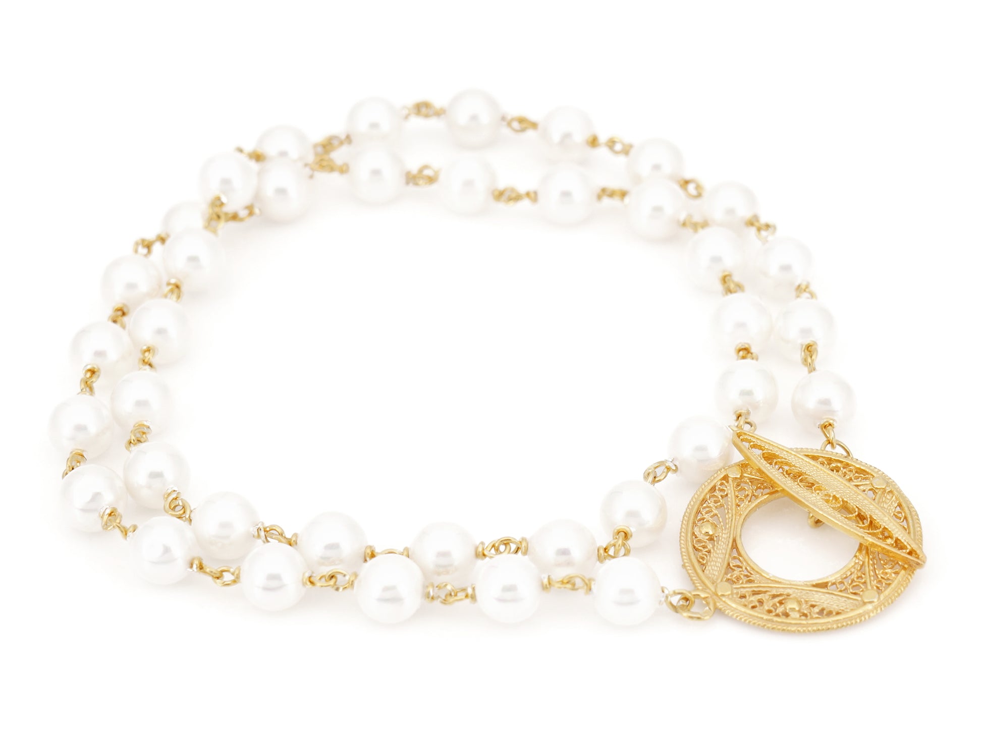 Magnífico Colar de Pérolas com Fecho em Filigrana. Dependendo da medida do pulso, poderá ser usado como pulseira dupla. Feito em Portugal em Prata de Lei 925, com Banho de Ouro.