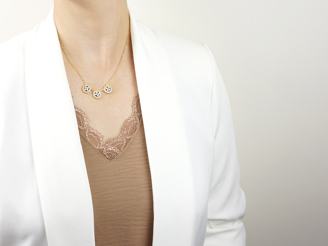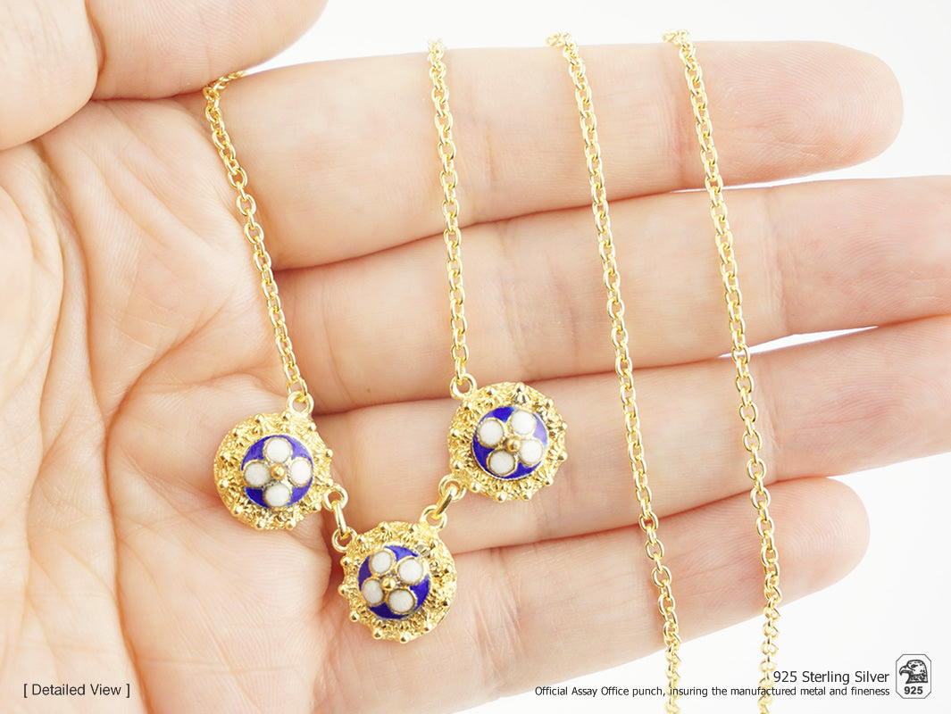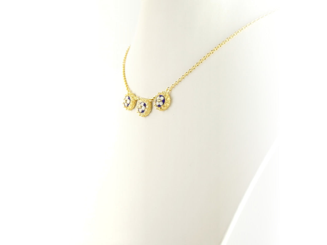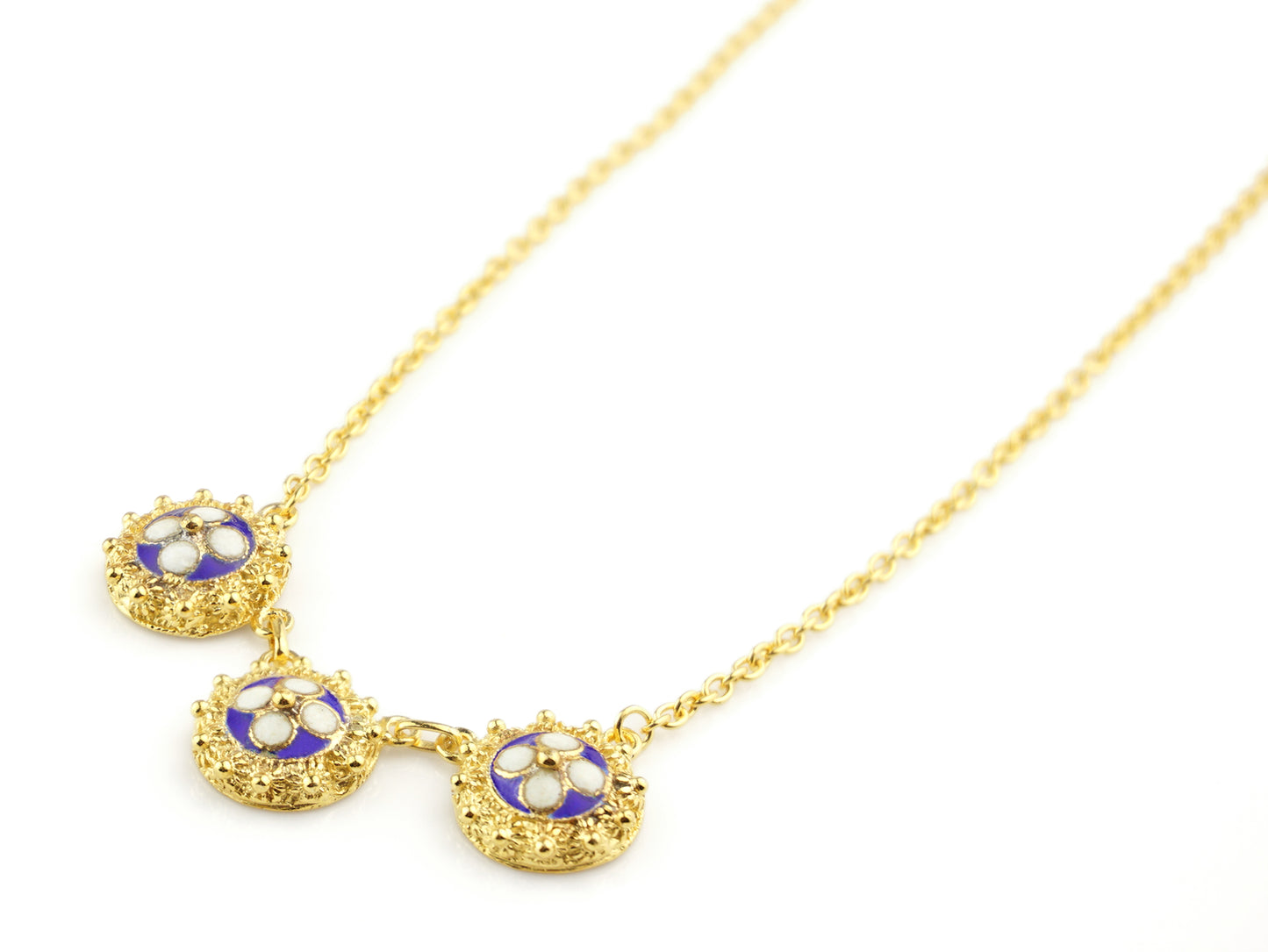 Elegante Colar com Três Caramujos Clássicos Esmalte Azul, com fio curto. Filigrana Portuguesa, feito em Portugal em Prata de Lei 925, com Banho de Ouro.