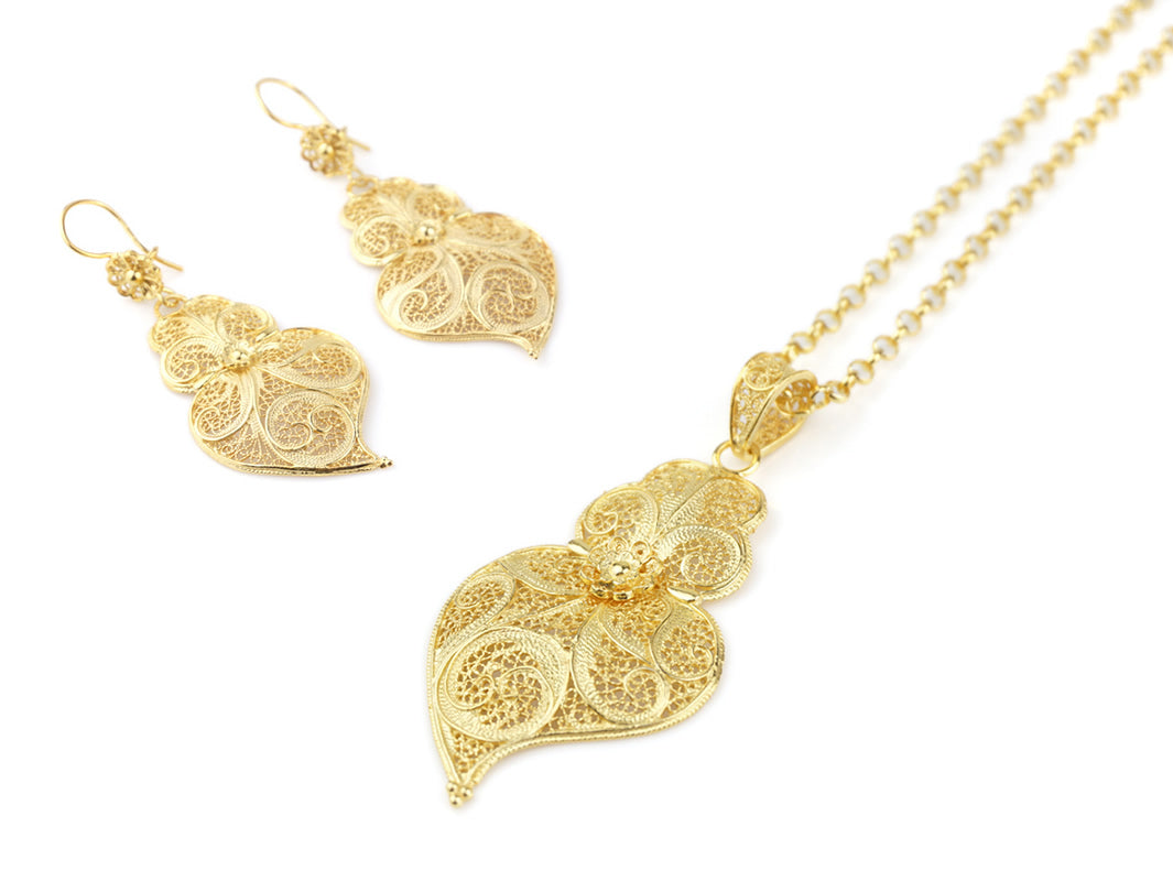 Elegante conjunto composto por Brincos + Colar Coração de Viana médio. Filigrana Portuguesa, feito em Portugal em Prata de Lei 925, com Banho de Ouro.