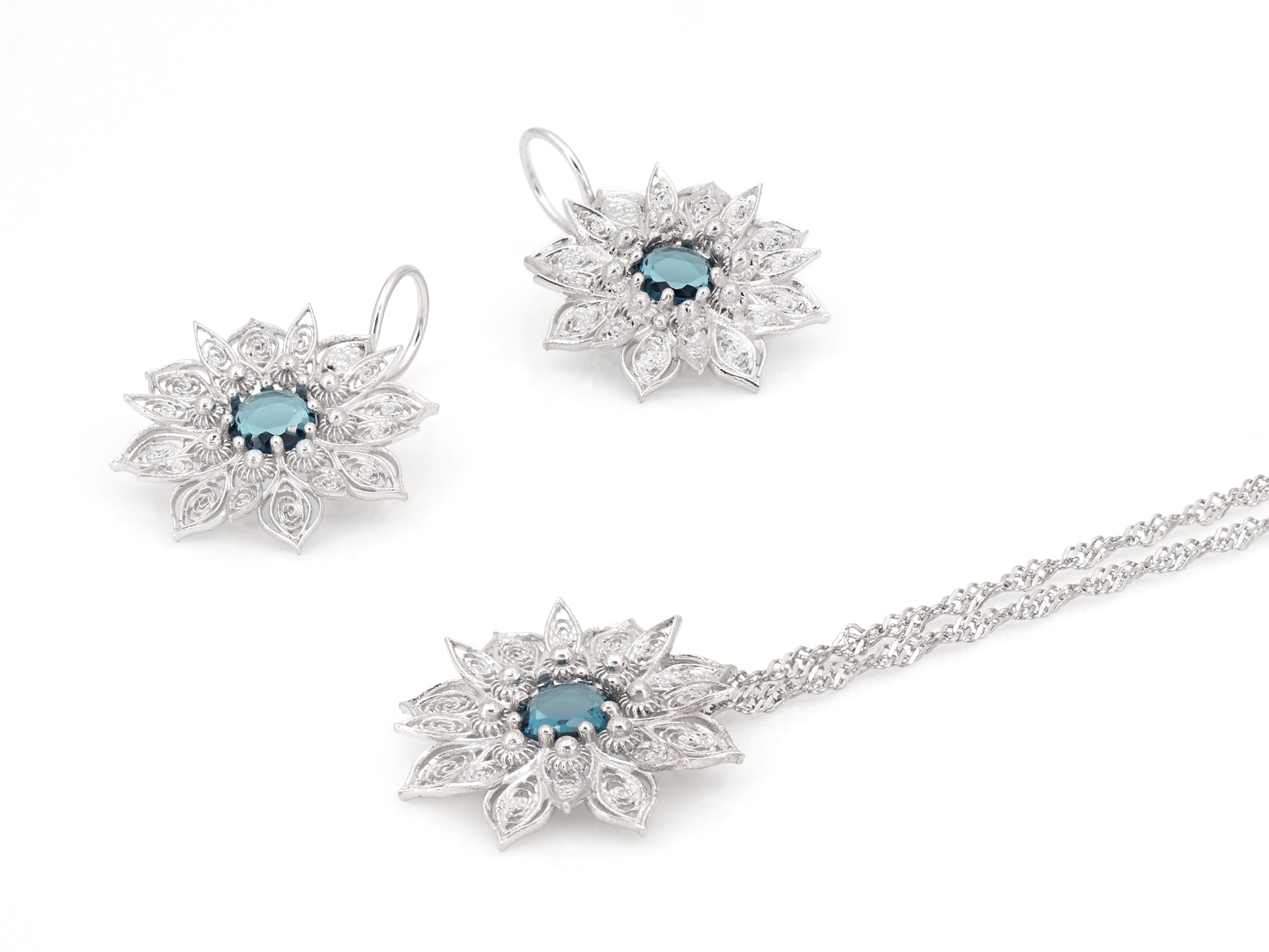 Conjunto Brincos e Colar Flor Rica com Pedras, Filigrana Portuguesa, Prata de Lei 925