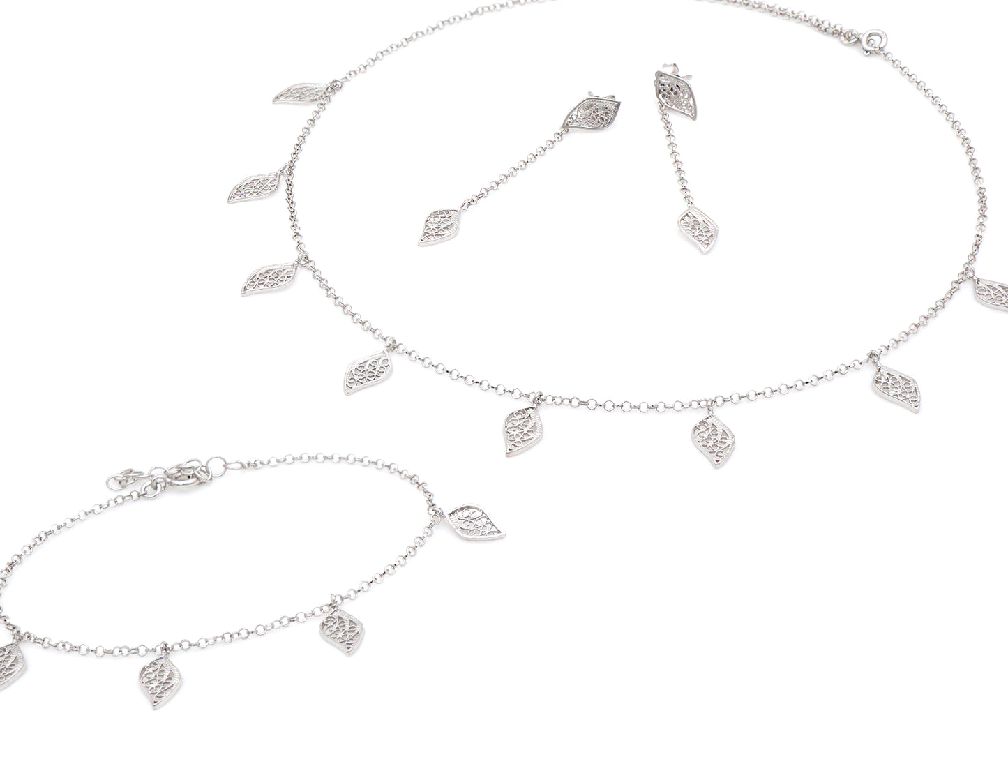 Conjunto Brincos + Pulseira + Colar Folhinhas, Filigrana Portuguesa, Prata de Lei 925