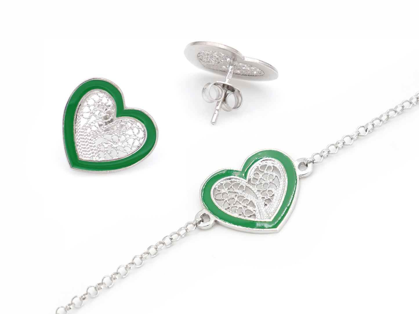 Elegante Conjunto de Brincos de tornilho + Pulseira com Coração Médio com Esmalte Verde. Filigrana Portuguesa, feito em Portugal em Prata de Lei 925, com Banho de Ródio.