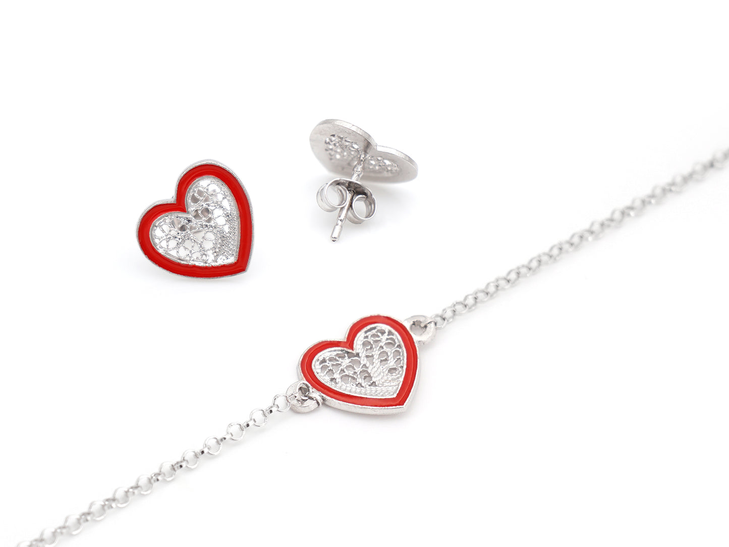 Elegante Conjunto de Brincos de tornilho + Pulseira Coração pequeno com Esmalte Vermelho. Filigrana Portuguesa, feito em Portugal em Prata de Lei 925, com Banho de Ródio.