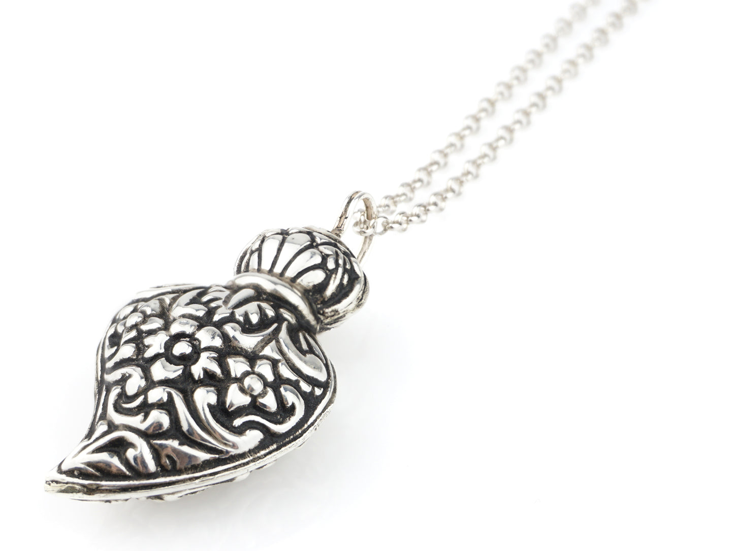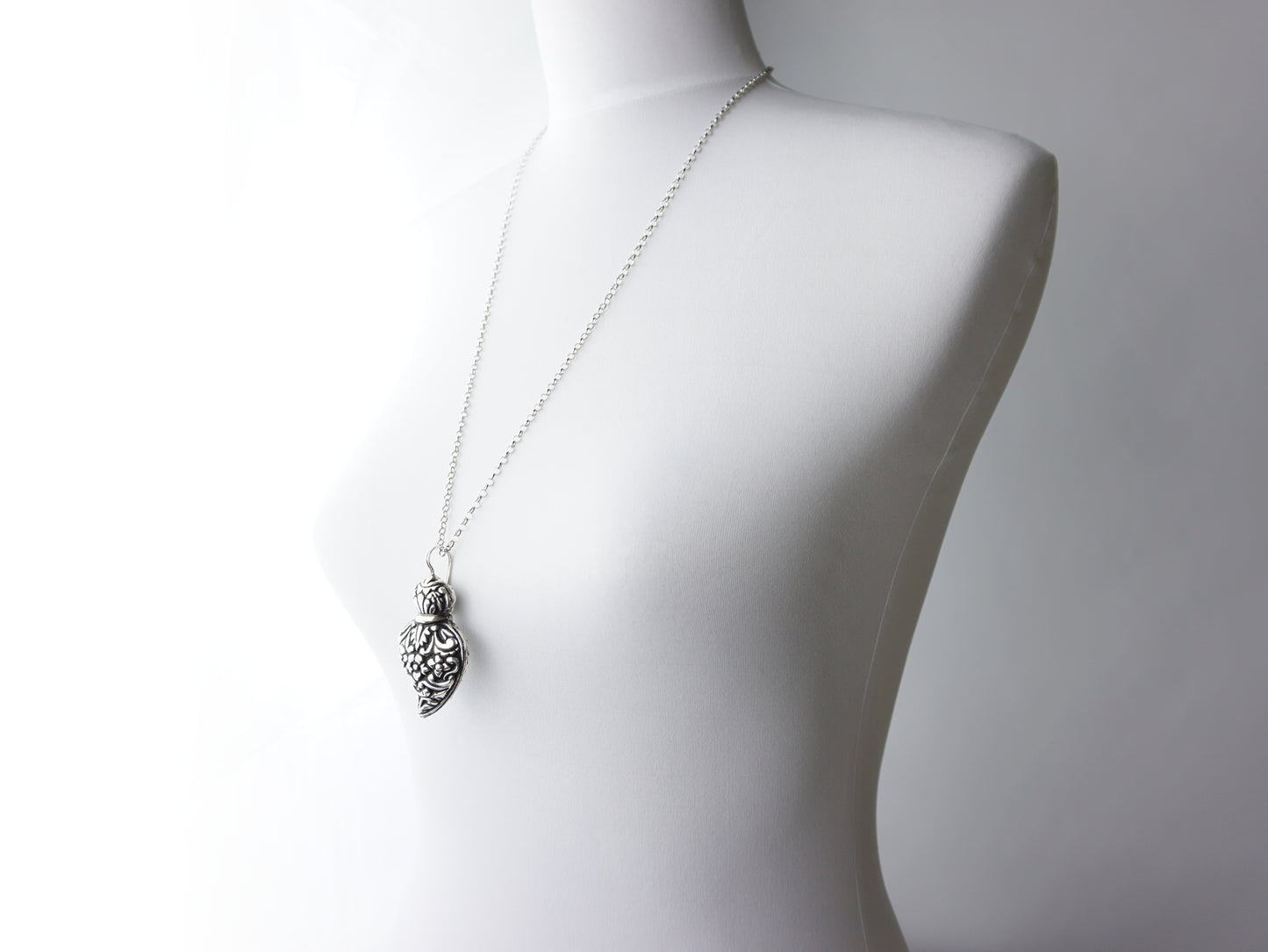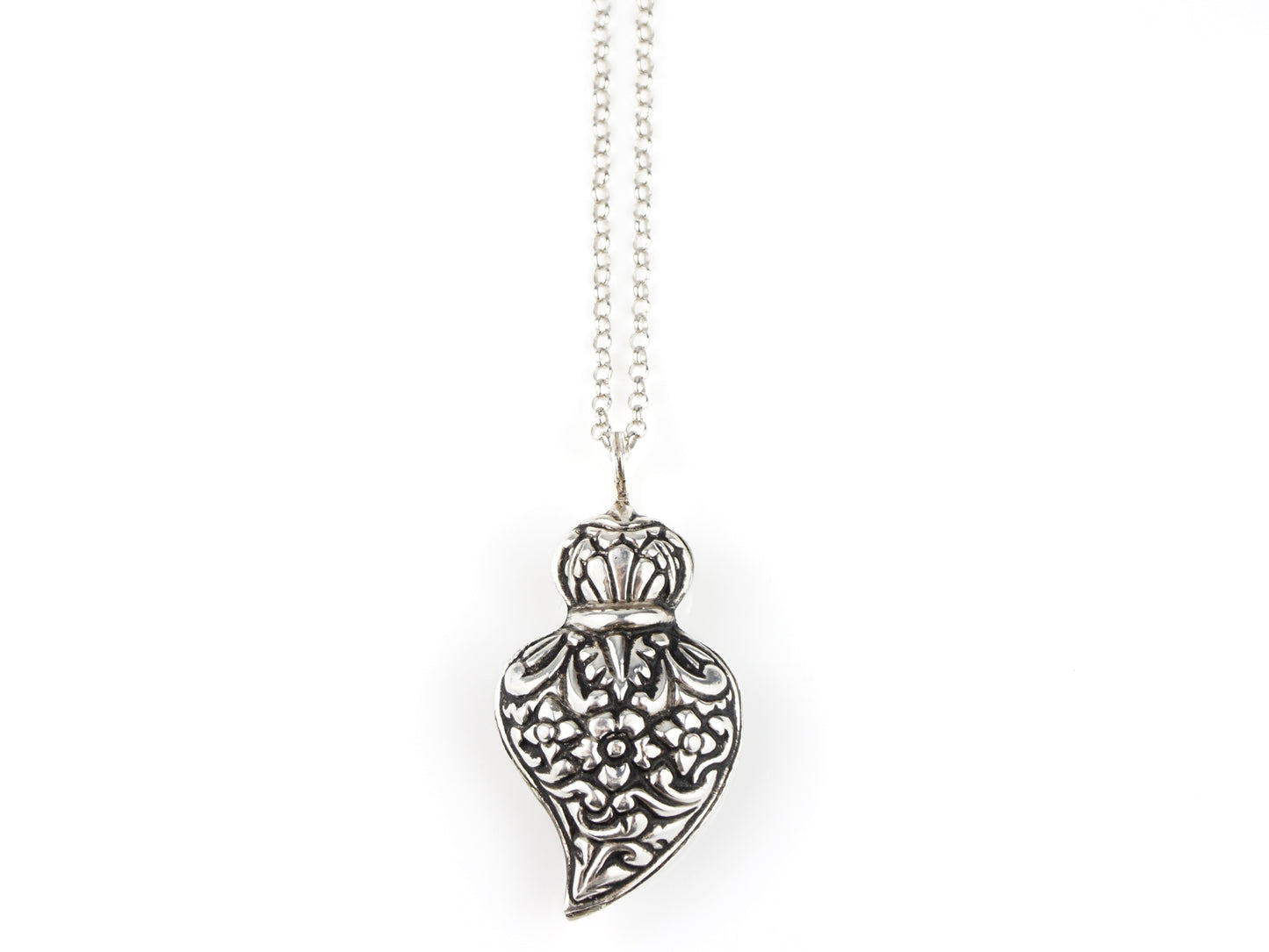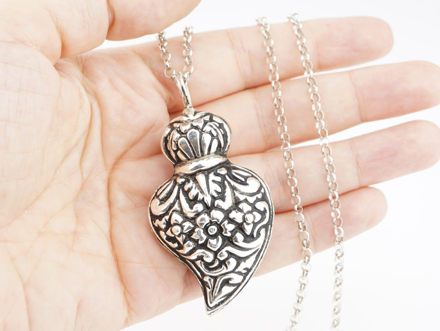 Elegante Cordão Fino comprido com Medalha Barroca Coração Grande, oca de dupla face, feito à mão em Portugal por talentosos artesãos, em Prata de Lei 925 com acabamento "patine".