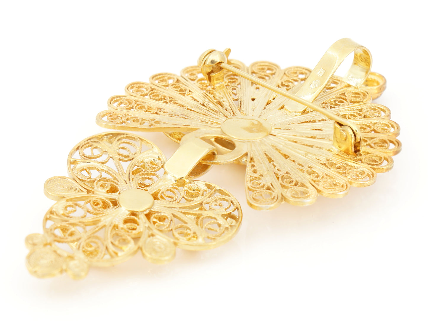 Elegante Medalha / Alfinete Laça Invertida, de tamanho extra grande. Filigrana Portuguesa, feito em Portugal em Prata de Lei 925, com Banho de Ouro.