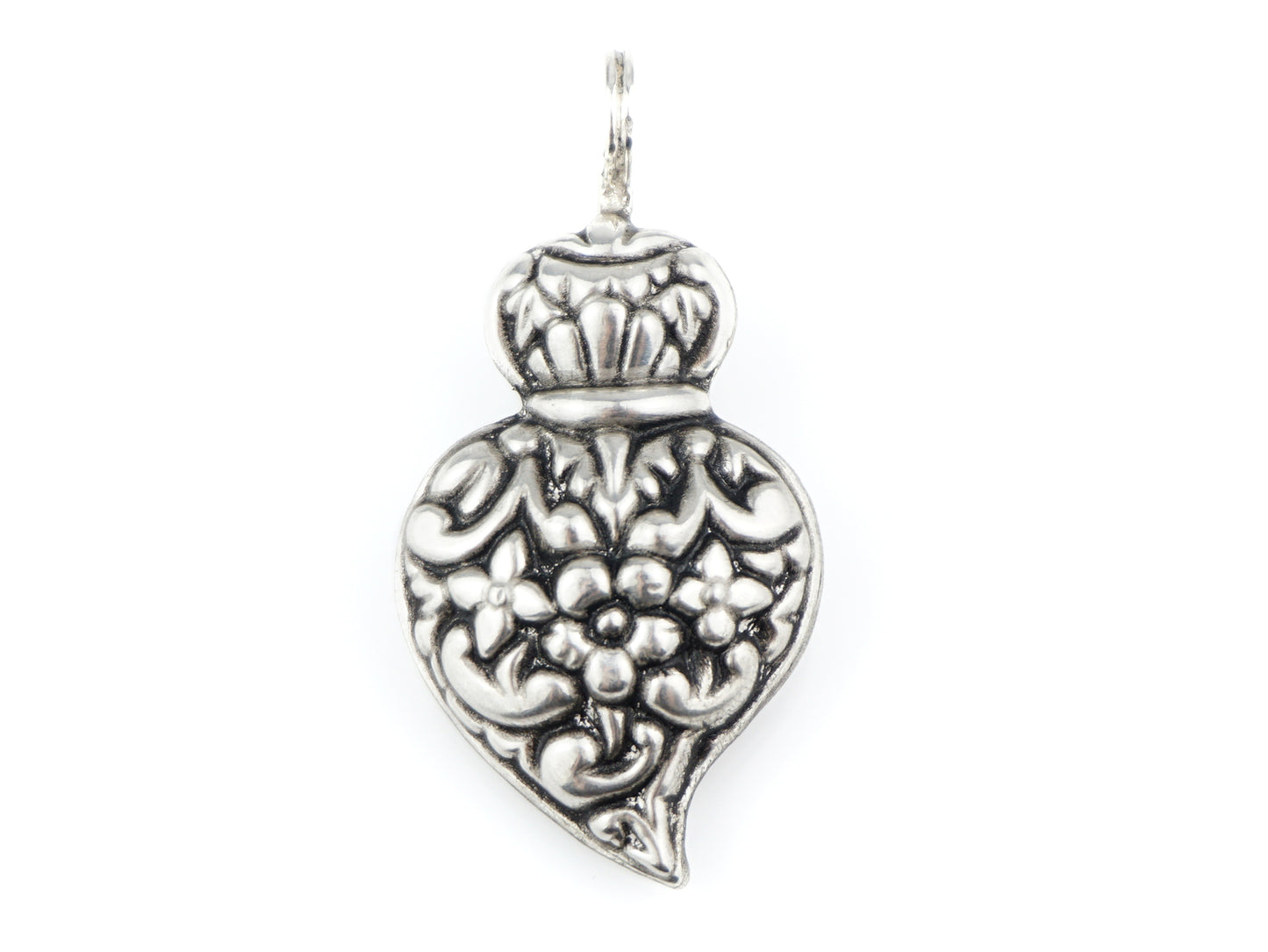 Elegante Medalha Barroca Coração Médio, oca de dupla face, feito à mão em Portugal por talentosos artesãos, em Prata de Lei 925 com acabamento "patine".