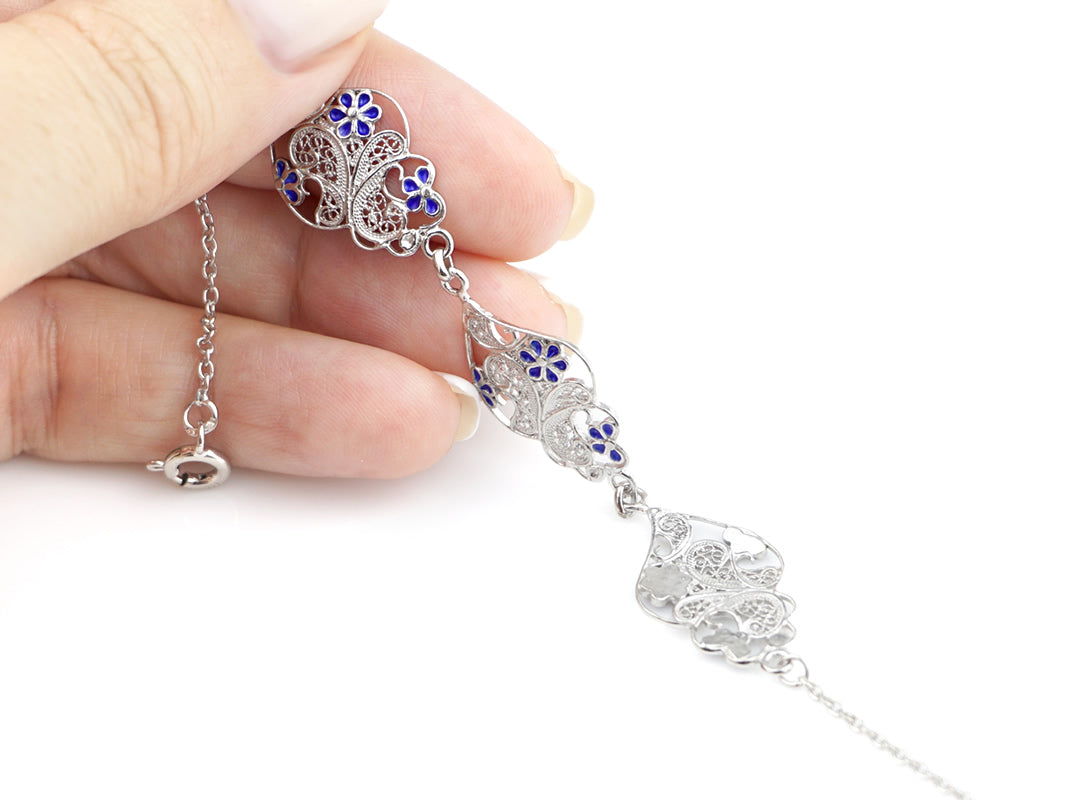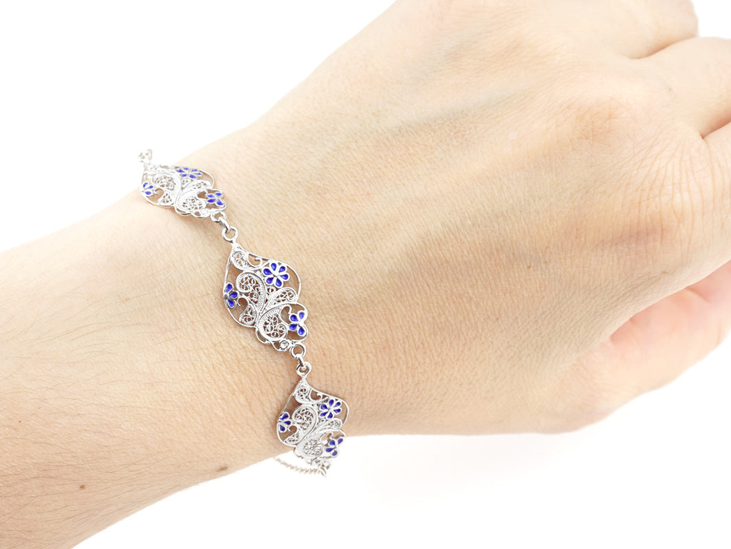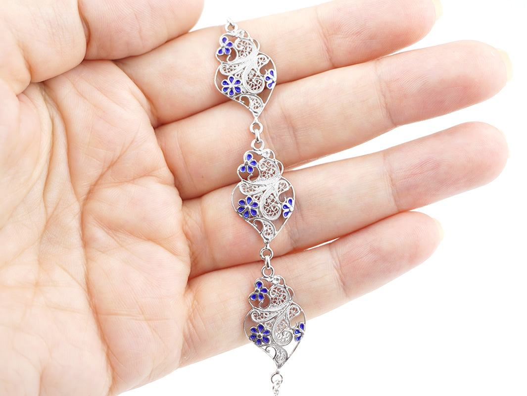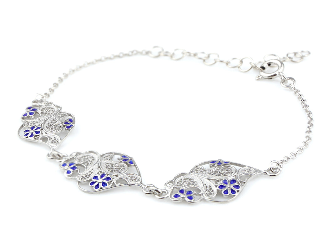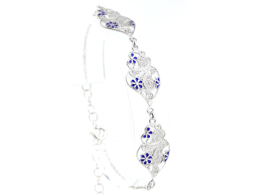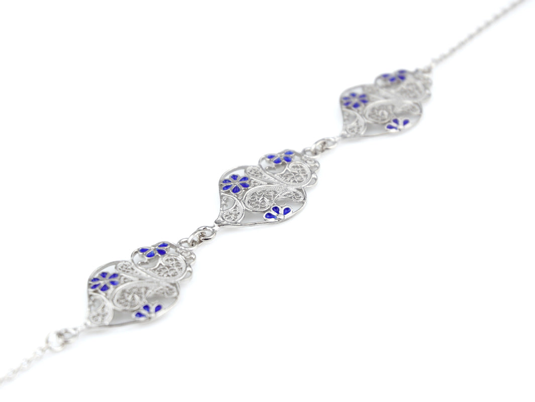 Pulseira Três Corações Flores Esmalte, Filigrana Portuguesa, Prata de Lei 925